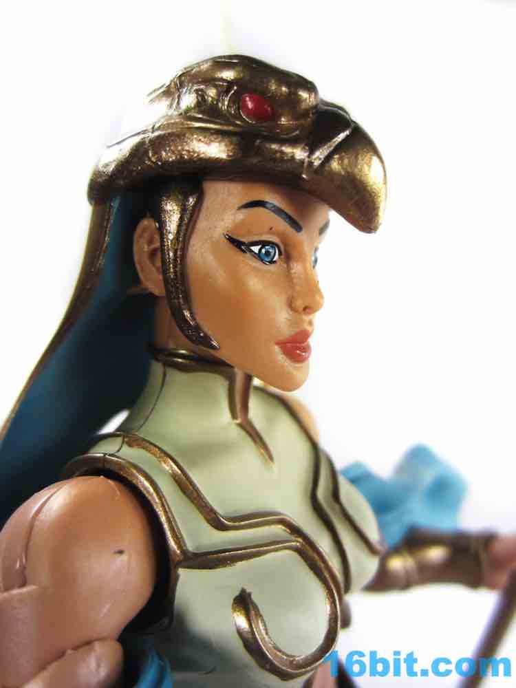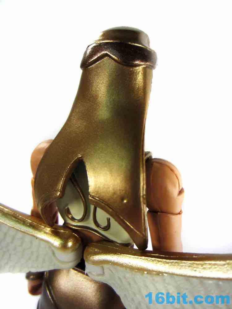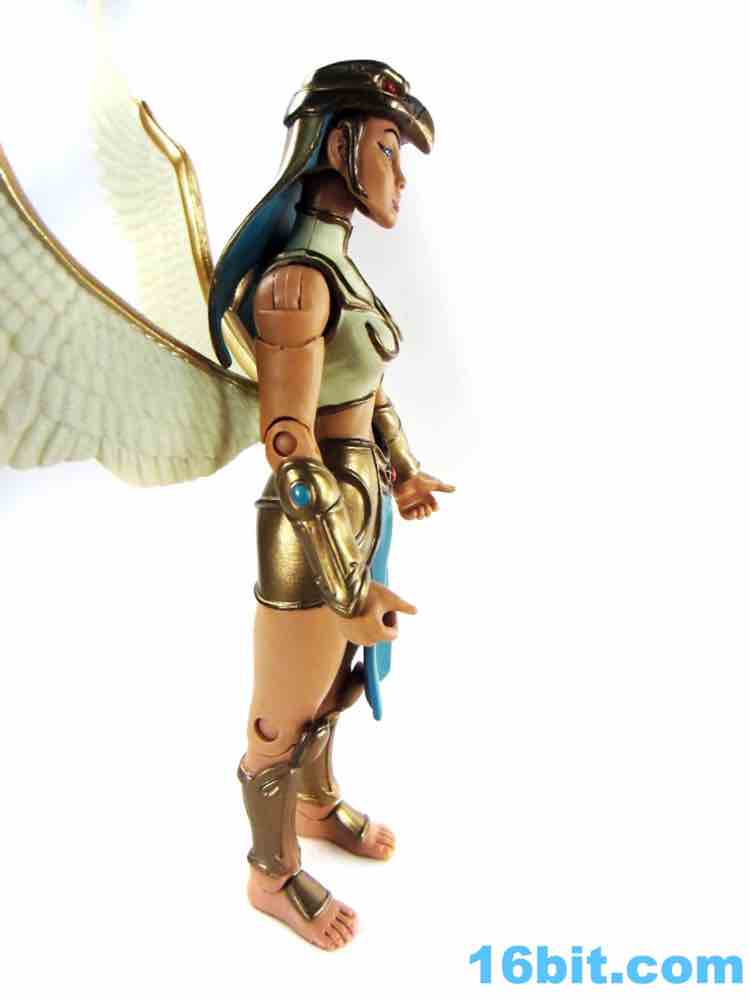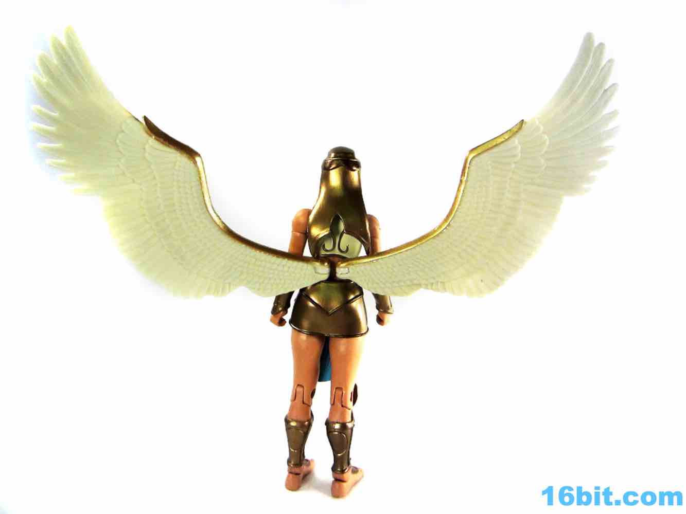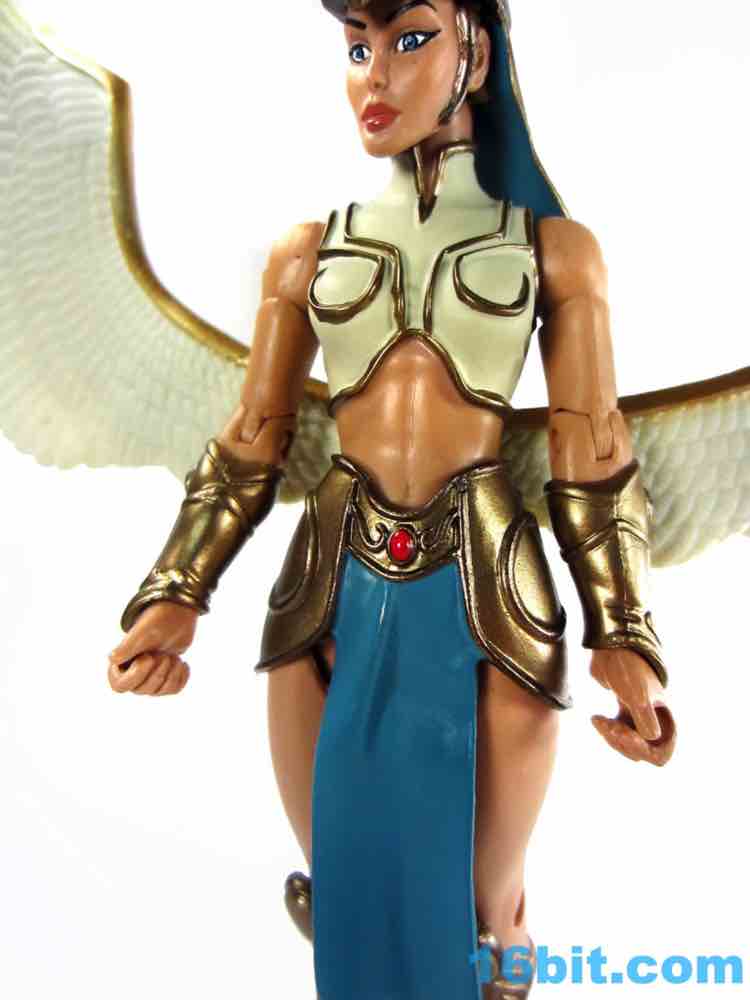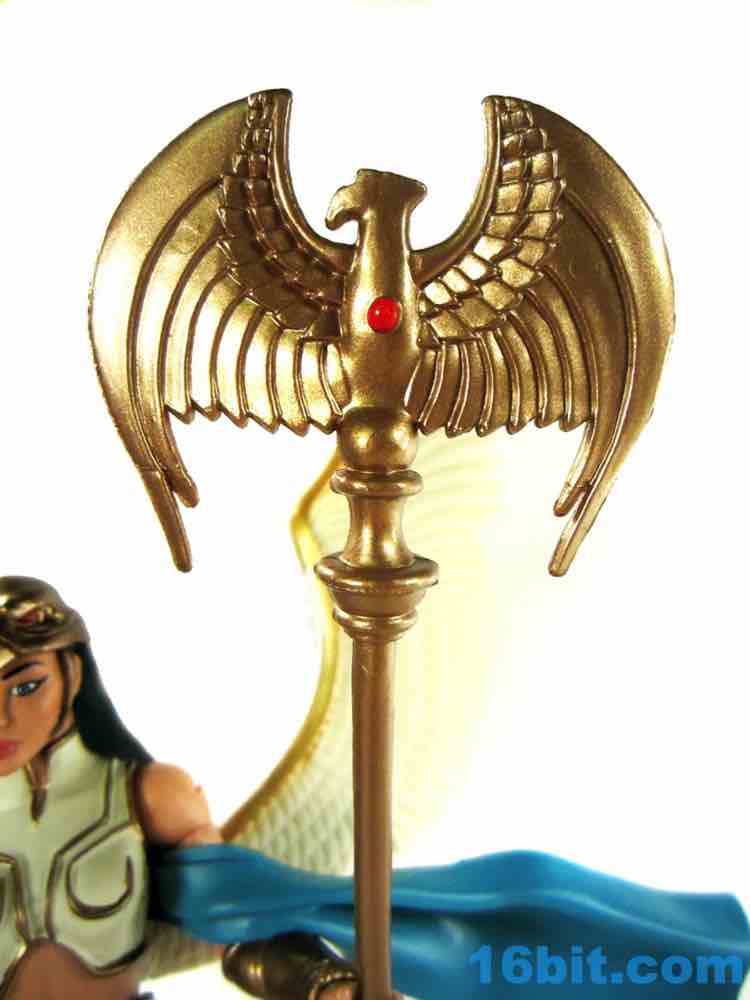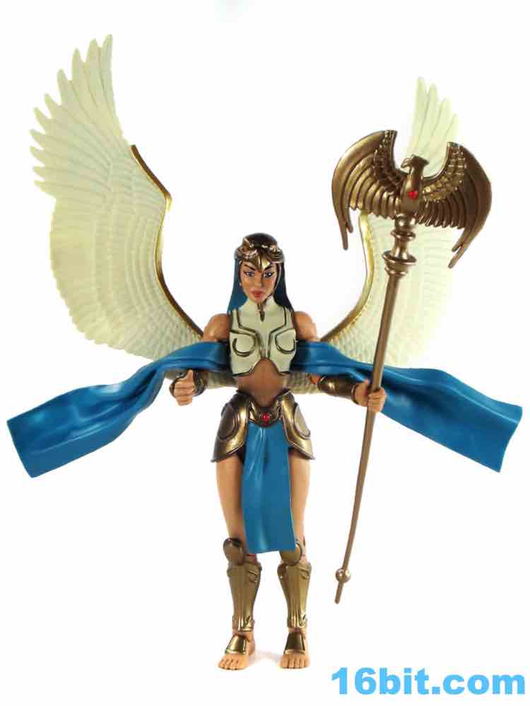Articulation is really nothing special - if you have any other figures from the line, this is pretty close to them. Jointed ankles and a swivel waist are nice, and the arms have the same great movement you're used to at this point. Of course, the arms are sort of held in a certain pose or two thanks to a blue shawl accessory that, well, they tried. It's not very good. It doesn't "hang" well unless you spend a lot of time bending it and twisting it so the wings hold it in place, but the sculpting is great and the color is good. I don't doubt that it was anime inspired rather than The Incredibles-inspired, notably because Pixar's film mocked capes and their deadly attributes after this particular chapter of He-Man came to a close. So it just sort of dangles there... it gets in the way if you're playing with the figure and might look better in the junk drawer. Thankfully her wings and their feathers are exquisite, the sculpted feather detail on each no doubt drove one of the Horsemen completely mad. The staff is also quite nice - chunky, old, gold.