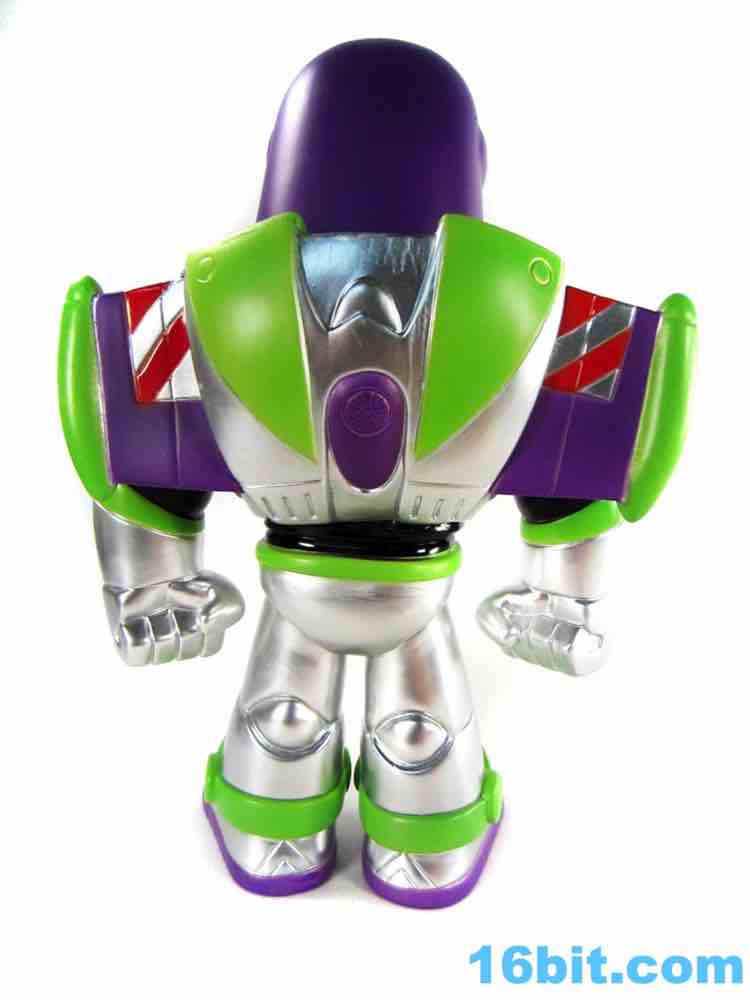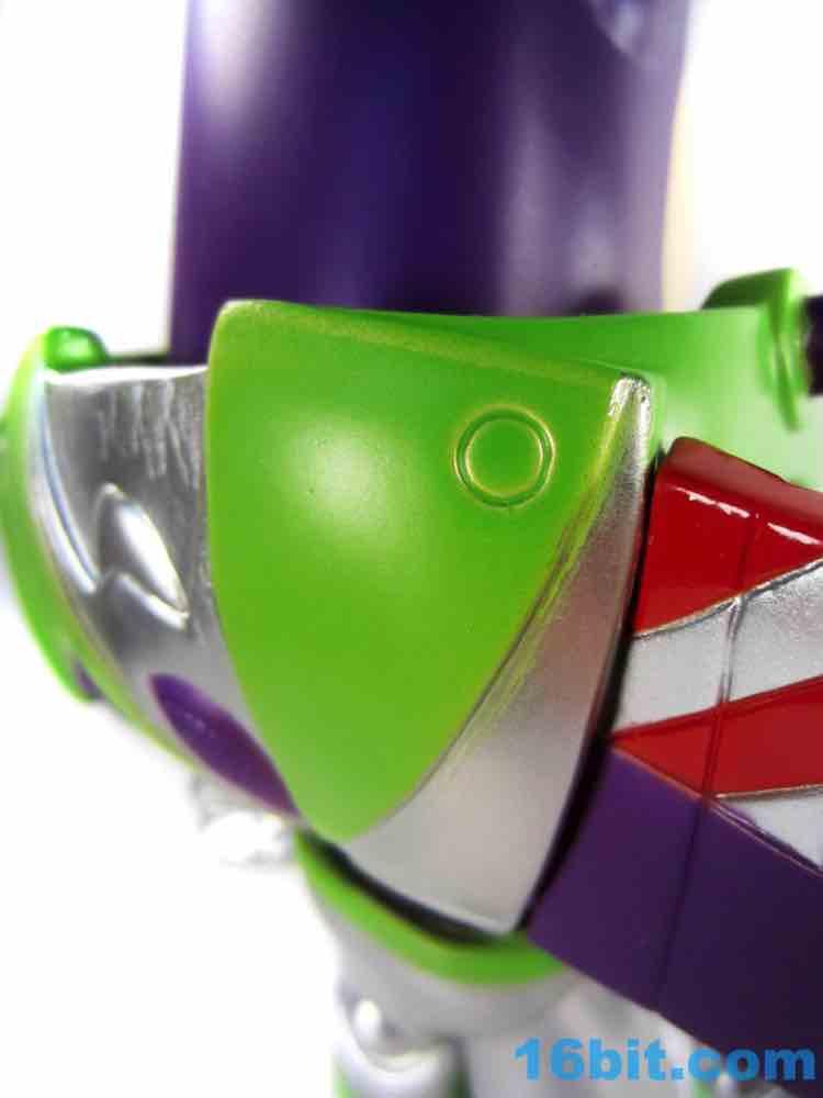 Generally these figures smooth out some of the details - not always, but sometimes. Here, we have a number of sculpted buttons, an embossed "SR" Space Rangers patch on his shoulders, and panels galore. The white parts of the body are an almost (but not) reflective silver that looks fabulous in a light room and still fabulous but different in a dark one. The paint job is, to say the least, impressive. The head has a fleshy color that looks a lot like the movie, giving the figure's "skin" the same opacity you saw in the movie - there's a big difference between a flesh plastic and flesh painted toy head, and they nailed it. The face is expressive and the body is, well, it's appropriately deformed. Small wings barely pop out of his backpack with red and silver and purple stripes, plus green rocket-like bits on the sides. The green seems to be fading into a slight worn area in spots, giving it a really stellar look depending on where and when you see it. The toy has a lot of personality that changes up depending on the room he's in at the time, so that makes this more than a little exciting.