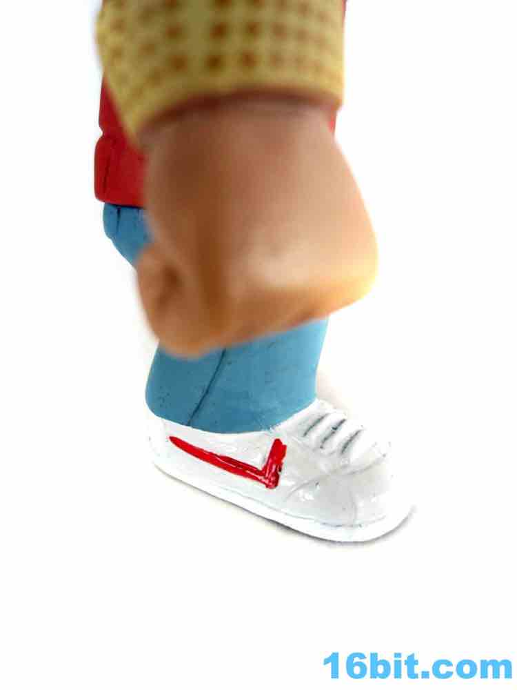 In the movies Marty was referenced as having worn Nikes - and these white sneakers have a vaguely Nike "swoosh" design that's suggestive, but not a copy of, the design. His vest - which I'm pretty sure wasn't even a thing back in 1985 (in that I never remember seeing one), is present as are his rolled-up shirt cuffs, jeans, downplayed large headphones, and shirt. The paint is notably good, except on the bottoms of the feet - the soles are almost undecorated in spots. This is weird. It won't hurt the figure for its intended purposes as a display piece, but it's one of those little shortcuts that probably help the factory to deliver them at ten bucks. I wonder what a premium one would look like?