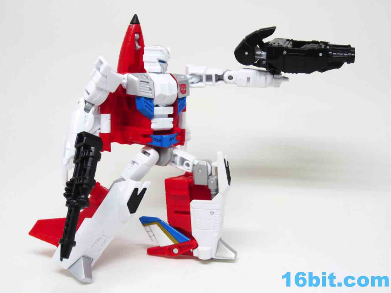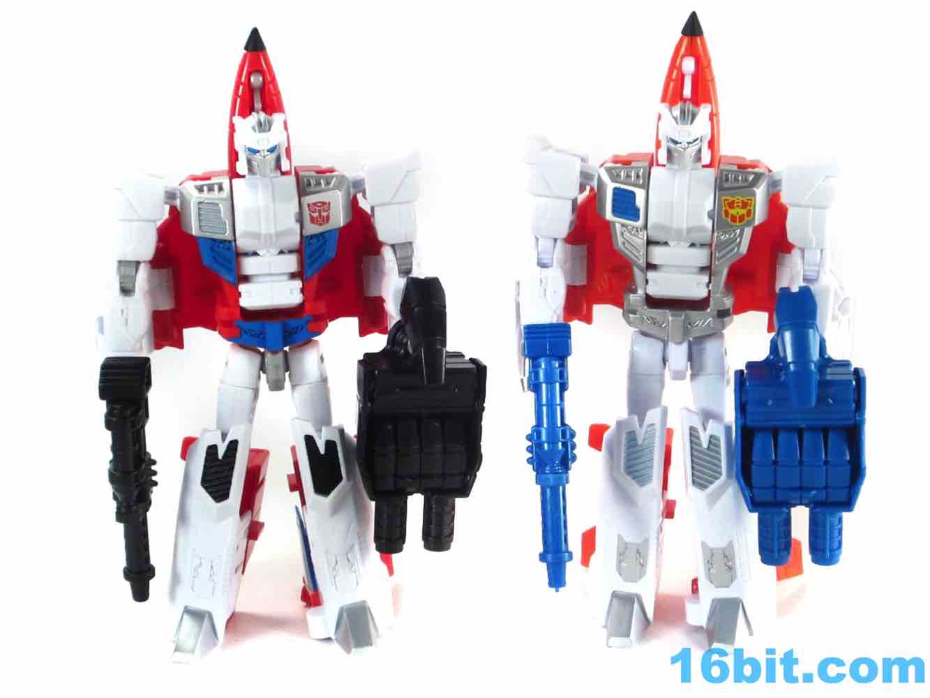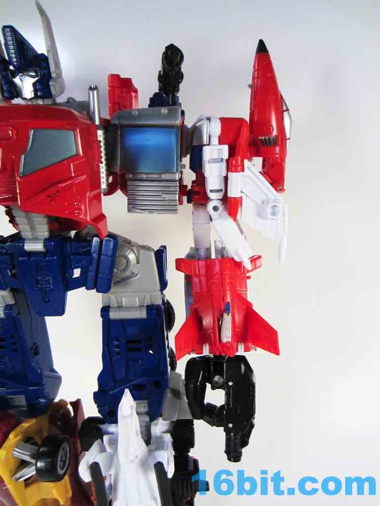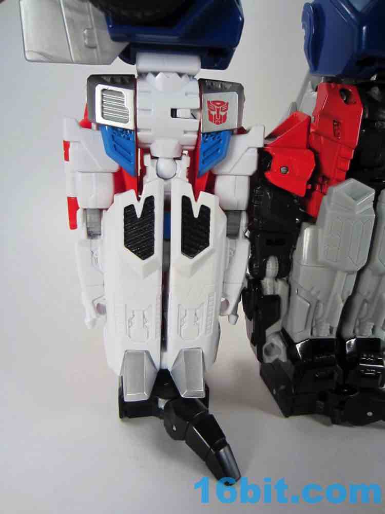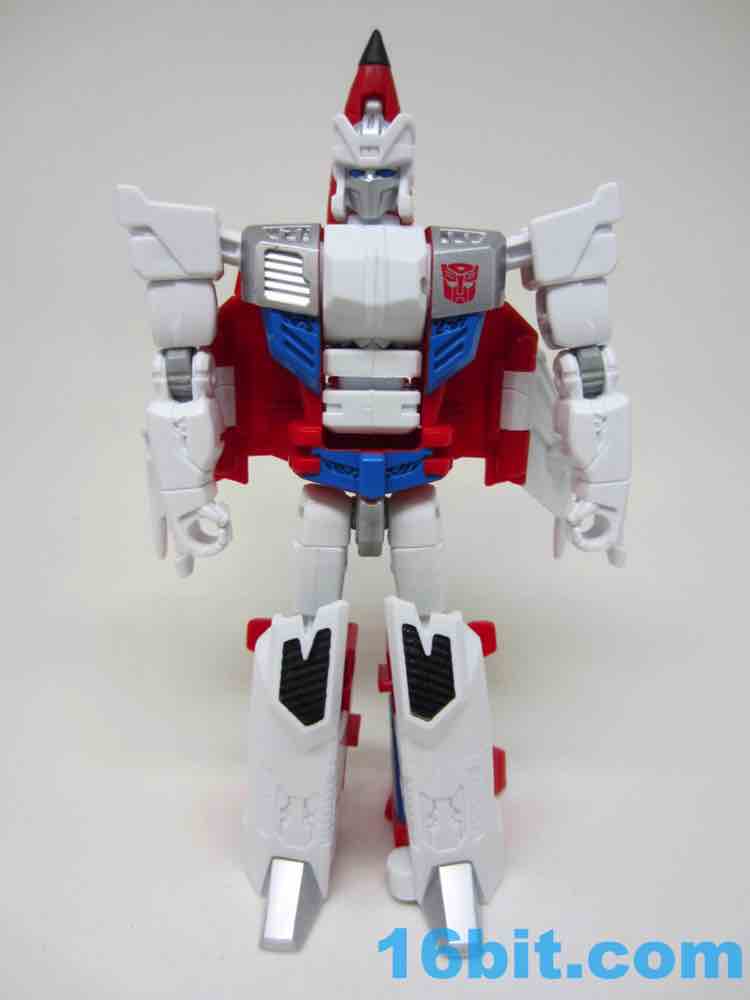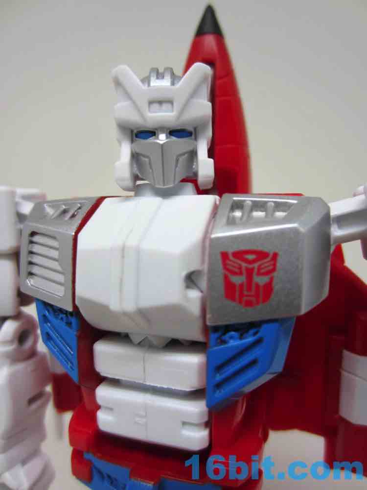 Paint is largely clean, and there's a lot of it. As a robot he's mostly white plastic in the front with red on the back, slathered in thick, clean silver paint. Silver usually rubs off easily if you store it in boxes rubbing against other toys, so if you plan on not taking good care of this figure I suggest you buy two. There's a wonderful Autobot symbol on his chest, some painted ents, and a great face plate on his head. The blue eyes are nice and bright with no eye port to darken your shelves. It really does make a big difference. It's very similar in terms of Skydive as construction goes, although the joints are placed in slightly different locations. 16 points of articulation - more if you count the plug on the chest that rotates - await you, so you can make sure this guy stands without much of a problem. The joints are nice and the elbows even click a bit, making this a nicely poseable toy. The 5 2/5-inch figure could even sit if the jet kibble didn't get in the way.