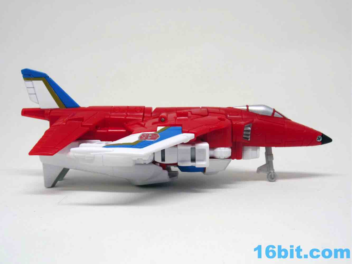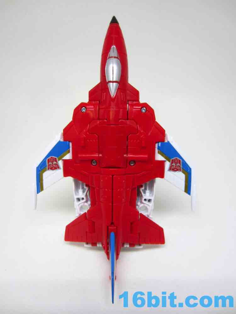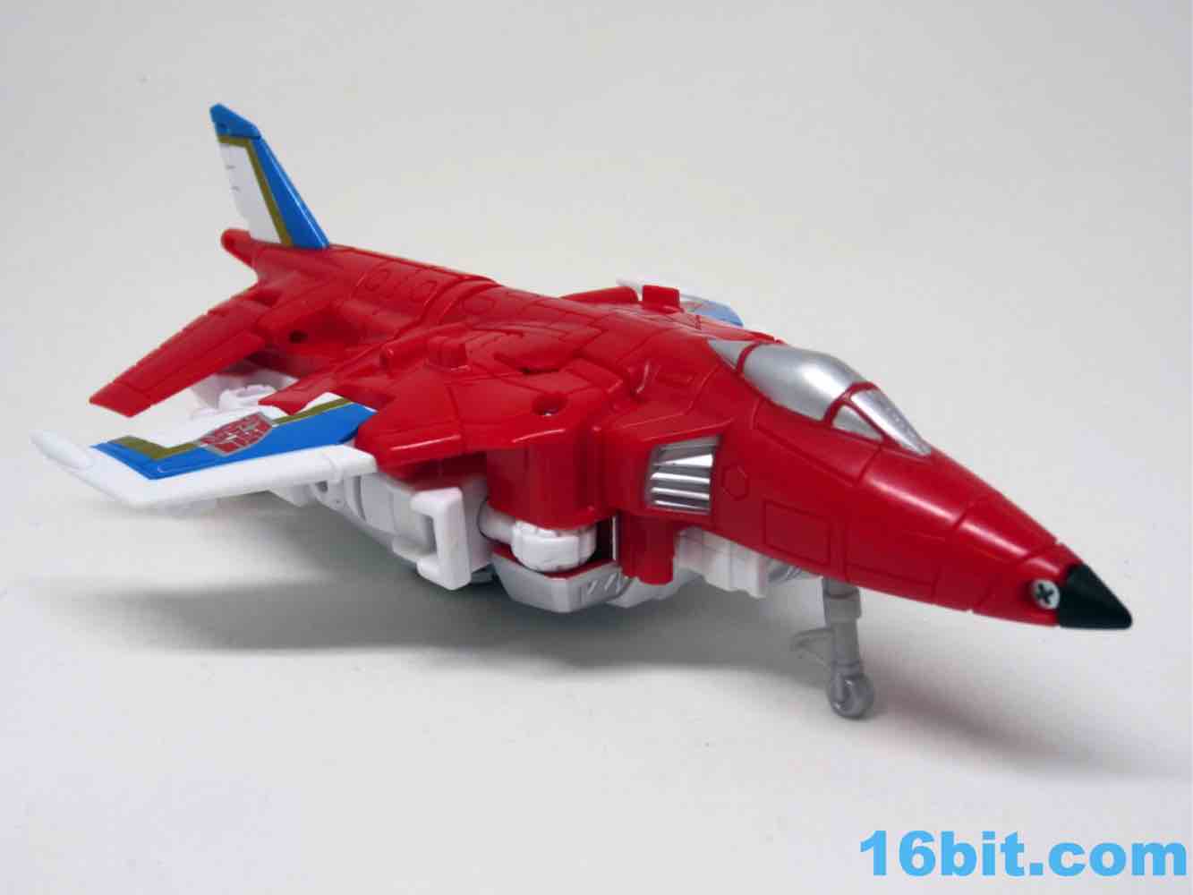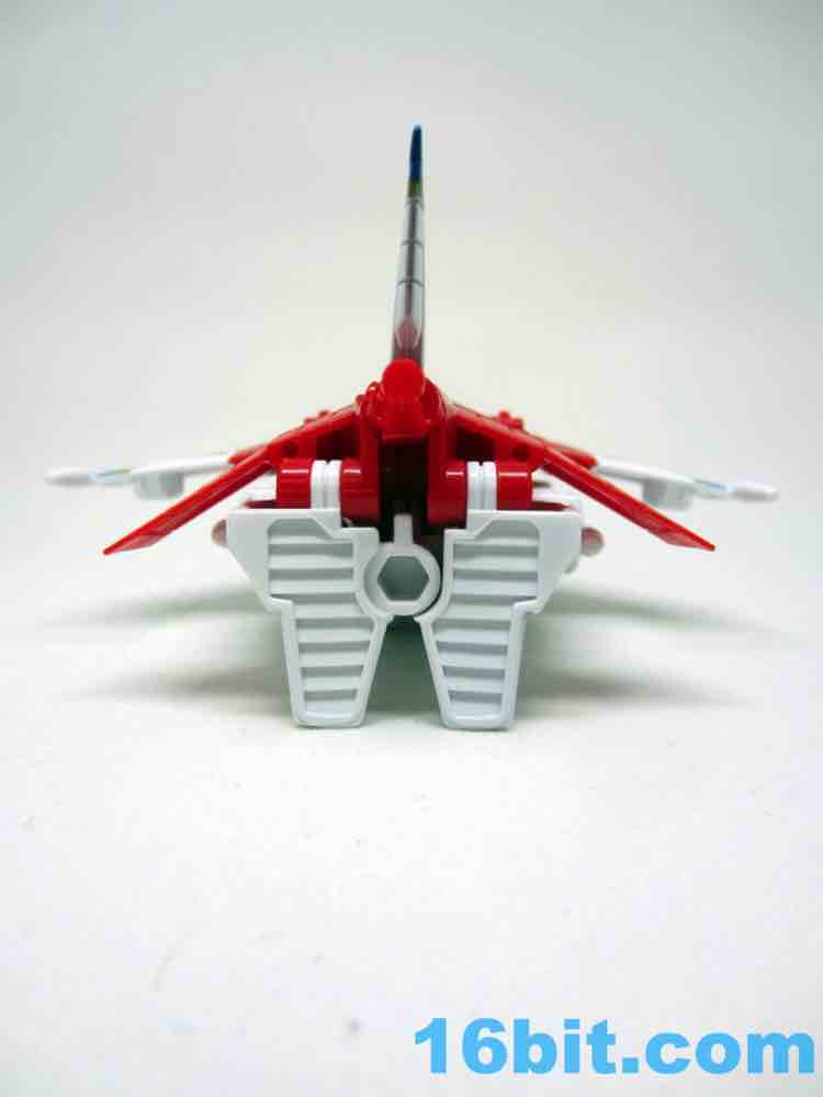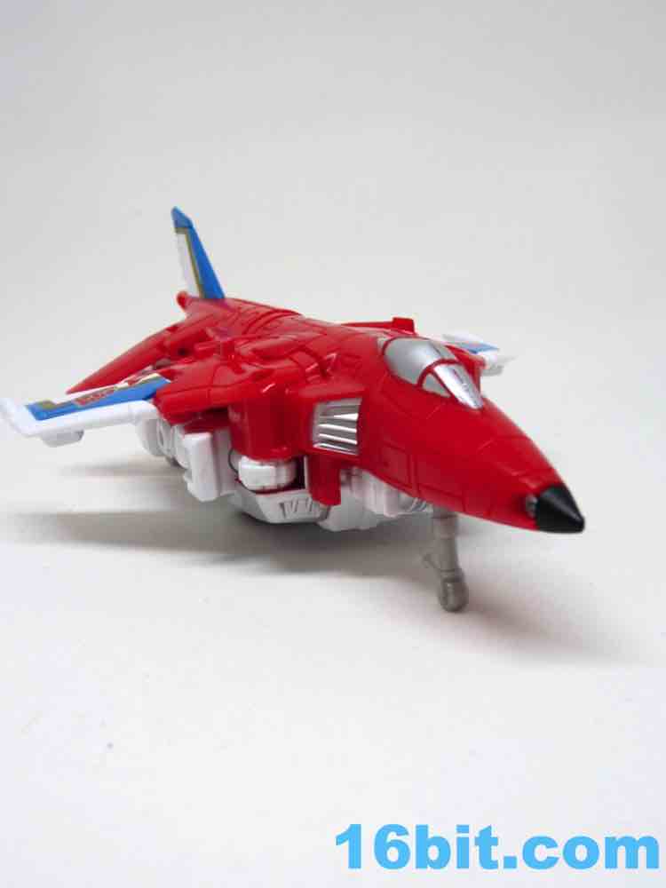 It's a plane! Transformation to jet is pretty much the same as Skydive. Pop open the legs and move them forward. Fold down the arms. Rotate the head. Get the nosecone up like a hat. Oh, and rotate down the landing gear if you want. It's fun. And now you probably won't see it in stores.