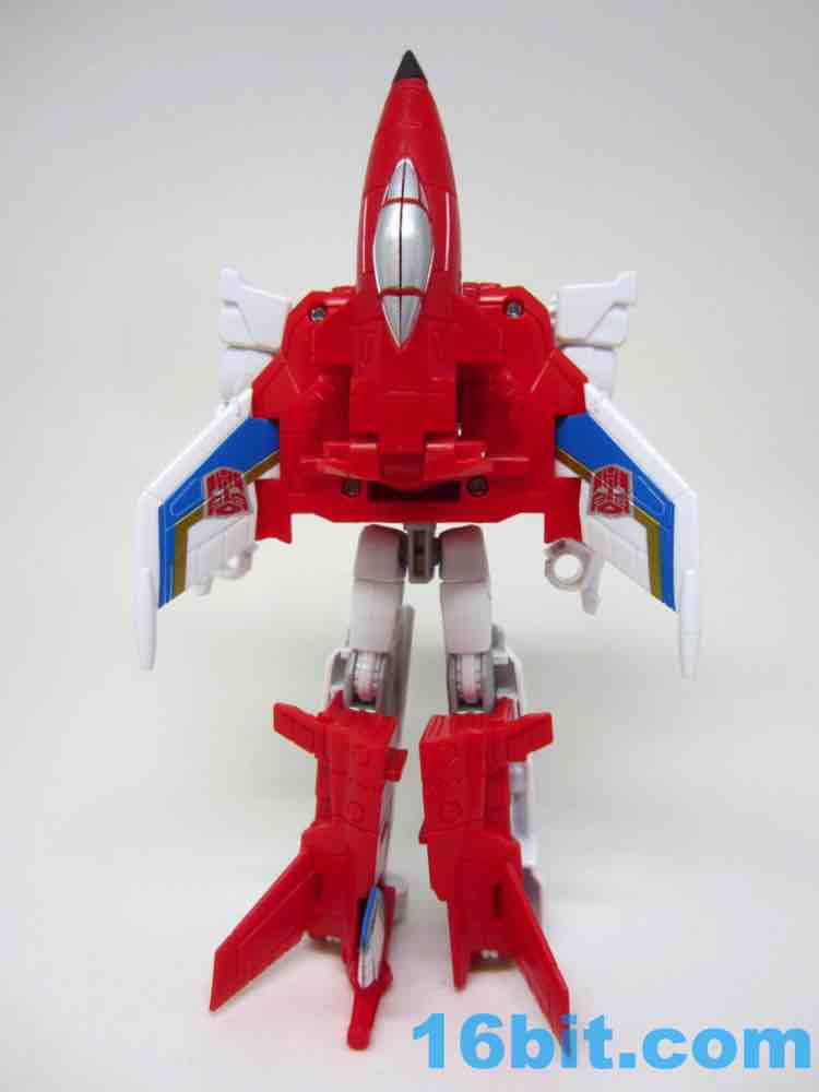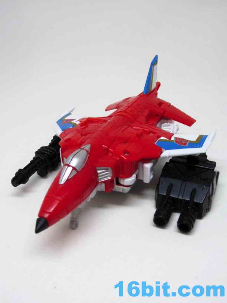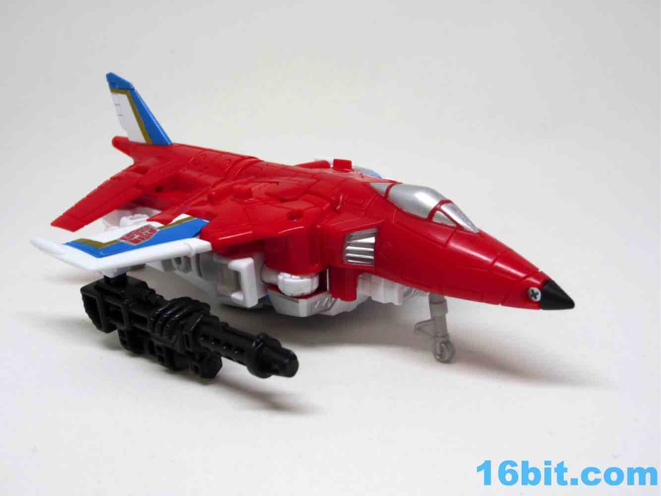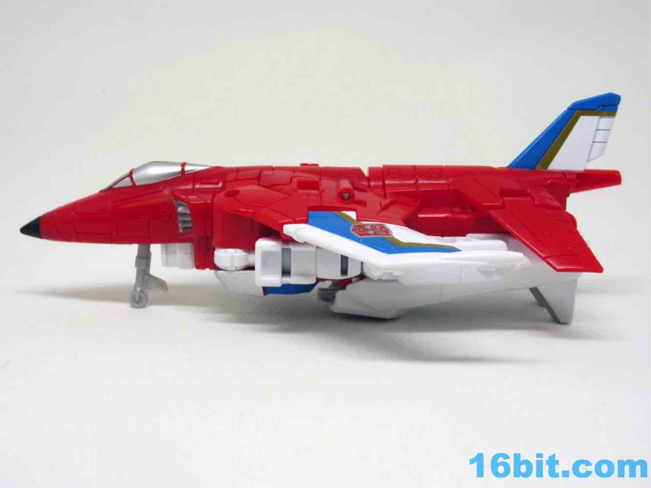 It's a plane! Transformation to jet is pretty much the same as Skydive. Pop open the legs and move them forward. Fold down the arms. Rotate the head. Get the nosecone up like a hat. Oh, and rotate down the landing gear if you want. It's fun. And now you probably won't see it in stores.