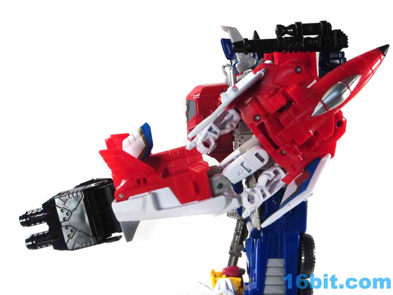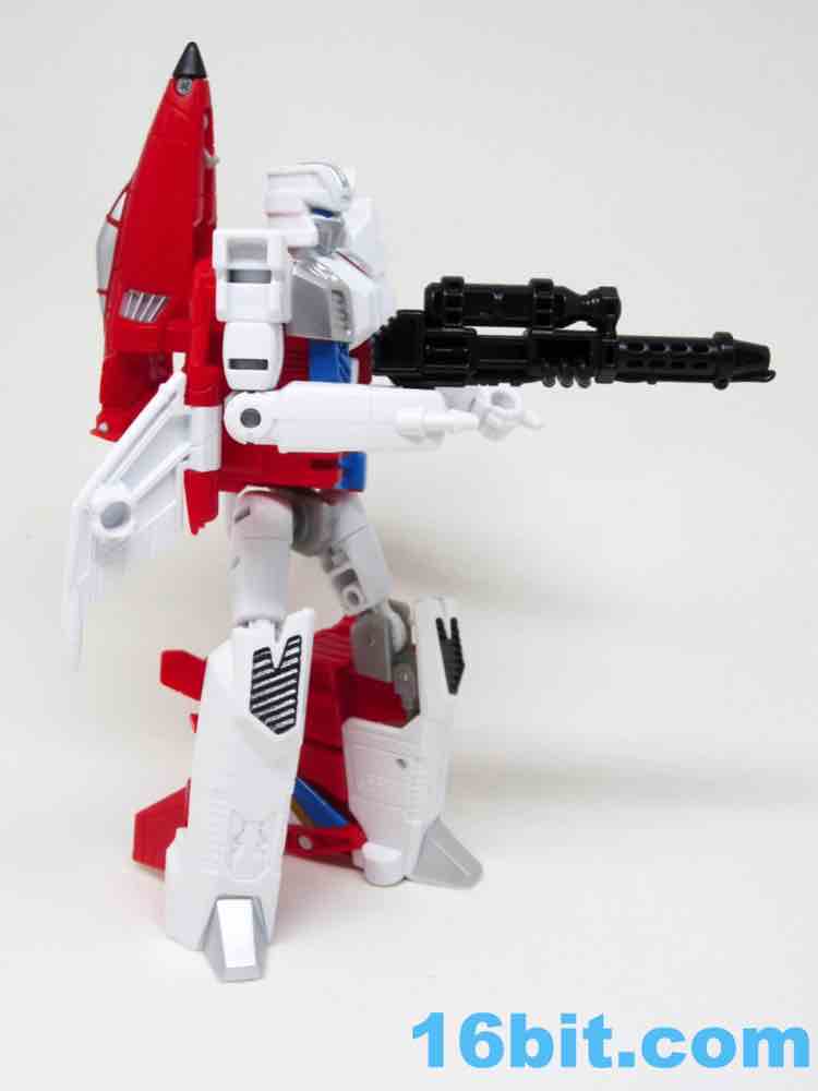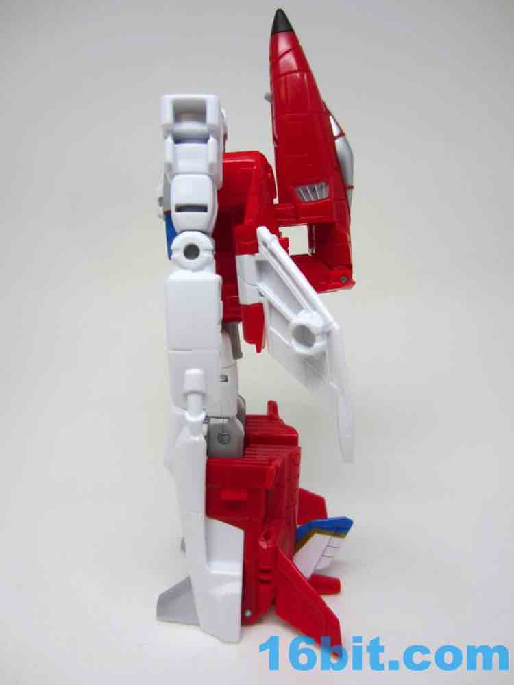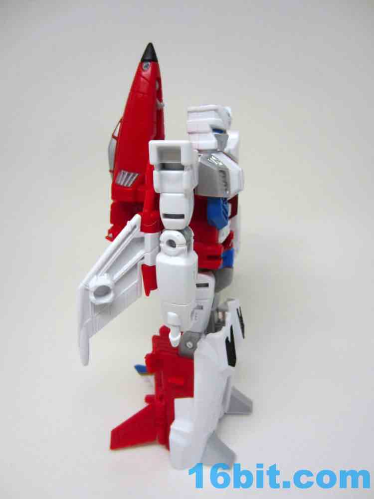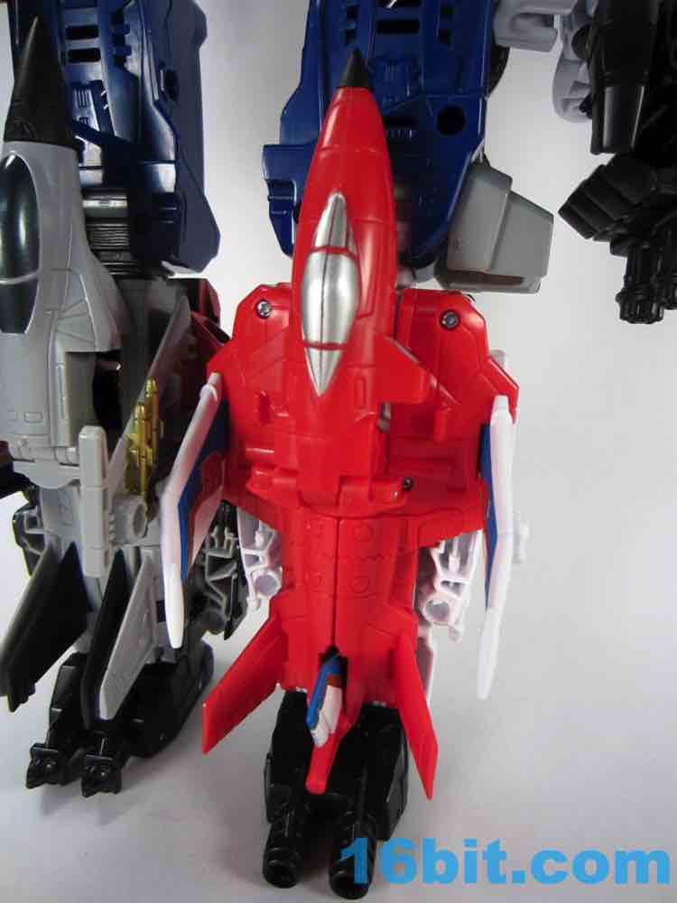 It's a plane! Transformation to jet is pretty much the same as Skydive. Pop open the legs and move them forward. Fold down the arms. Rotate the head. Get the nosecone up like a hat. Oh, and rotate down the landing gear if you want. It's fun. And now you probably won't see it in stores.