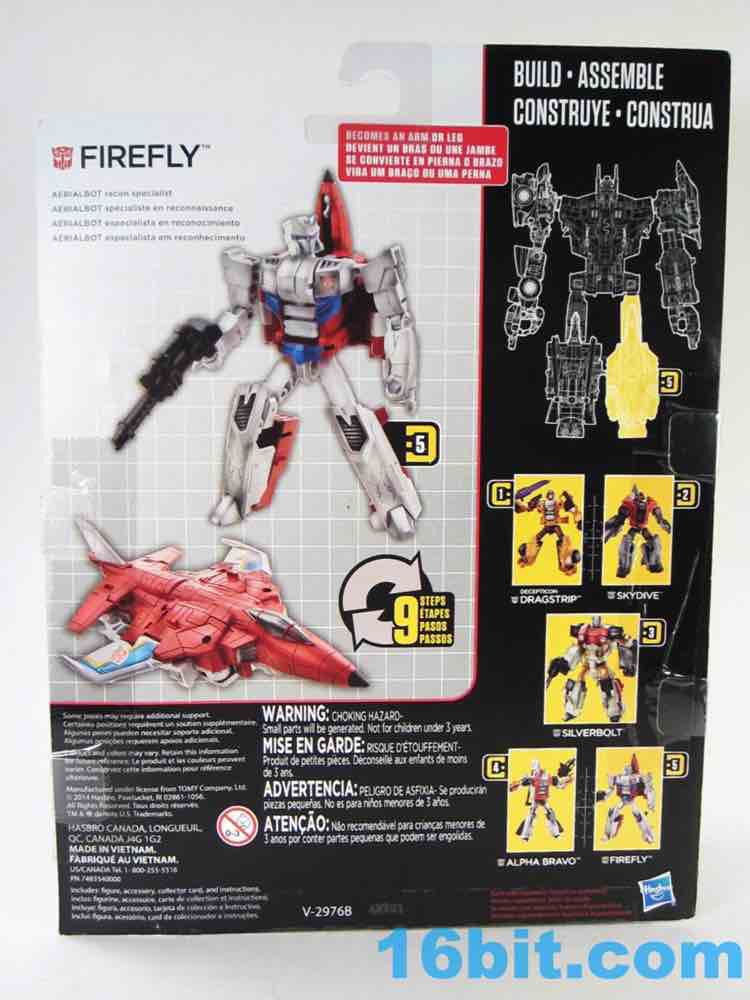 Item No.: Asst. B0974 No. B1174 Manufacturer:Hasbro Includes:Trading Card, gun, hand/foot/weapon Action Feature:Transforms from Robot to Plane to Hand to Foot Retail:$15.99 Availability: December 2014 Other: Also known as Fireflight, repainted and remolded many times now