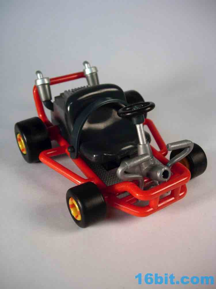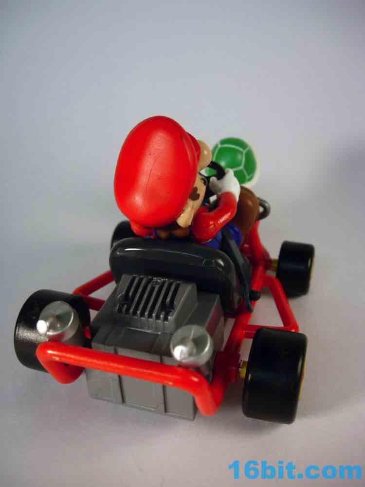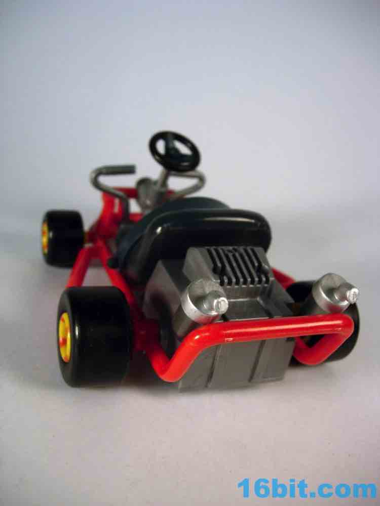 Toy Biz Video Game Super Stars Mario Kart 64 Mario Action FigureThe figure has no problems fitting in his fairly sizable Kart - it has wheels, an engine, and a pull-back motor that actually works pretty well. The shell launching mechanism ties in to it. Toy Biz did a nice job designing it with minimal paint applications, and a really sharp paint mask on the Koopa shell itself. It's worth noting that the shell is basically a rocket with a shell tip, though, so it launches like most spring-loaded rockets other contemporary toys sported back in the day. This probably prevents it being too much of a choke hazard. Of note, the wheels are yellow with red stripes - this kind of added detail is pretty uncommon.