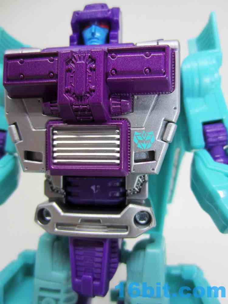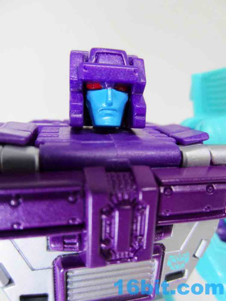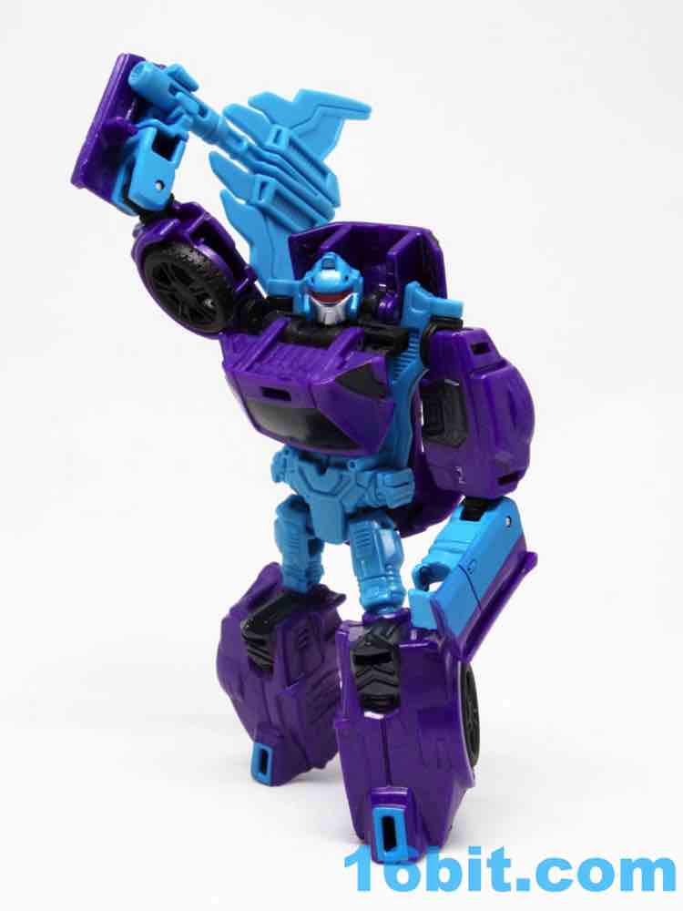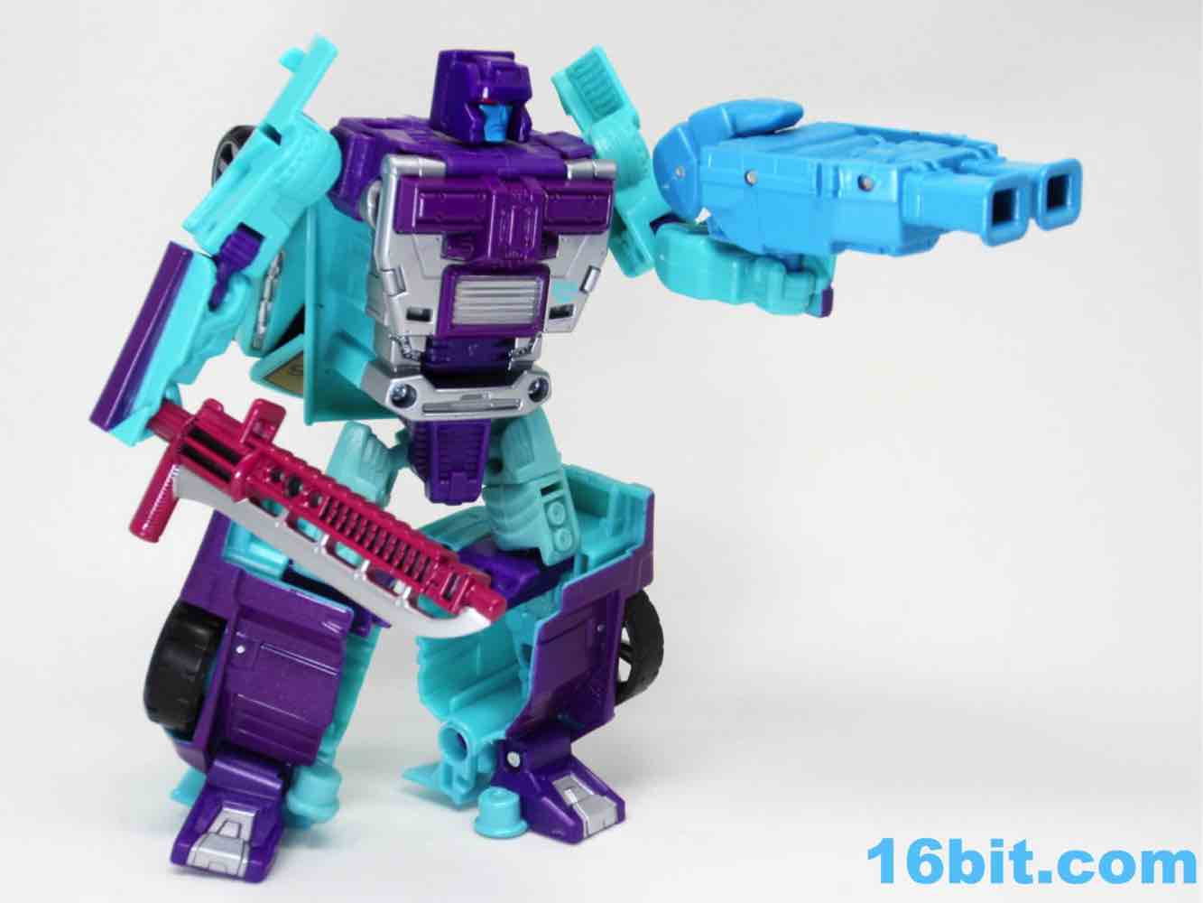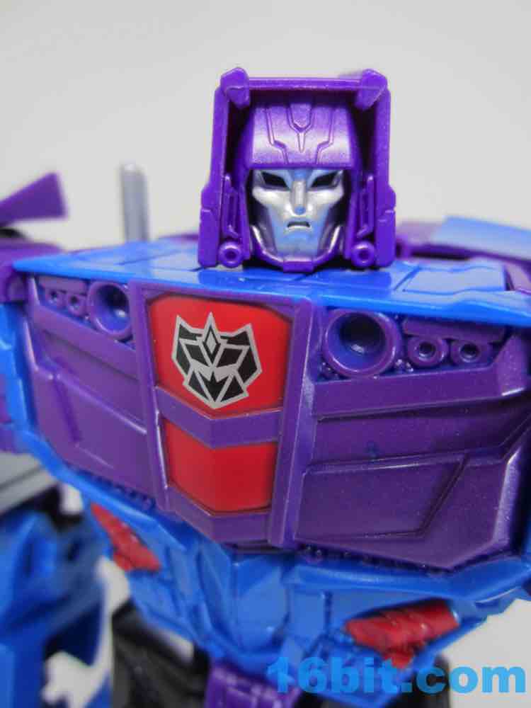 Starting small is Blackjack, who has no proper transforming analog. This time around he's purple with blue accents and a gorgeous silver face mask on his head. The red eyes pop nicely, and a bright blue G2 Decepticon symbol on his right shoulder looks wonderful. An even bigger one appears on his hood, giving this figure a pretty wonderful look. I mean, it's everything you could want in a fake G2 update short of chrome or the word "DECEPTICON" written on his person somewhere. Sadly, this feature was left out across the board. Hasbro was going for ca. 1994 Ugly, but didn't want to go all the way.