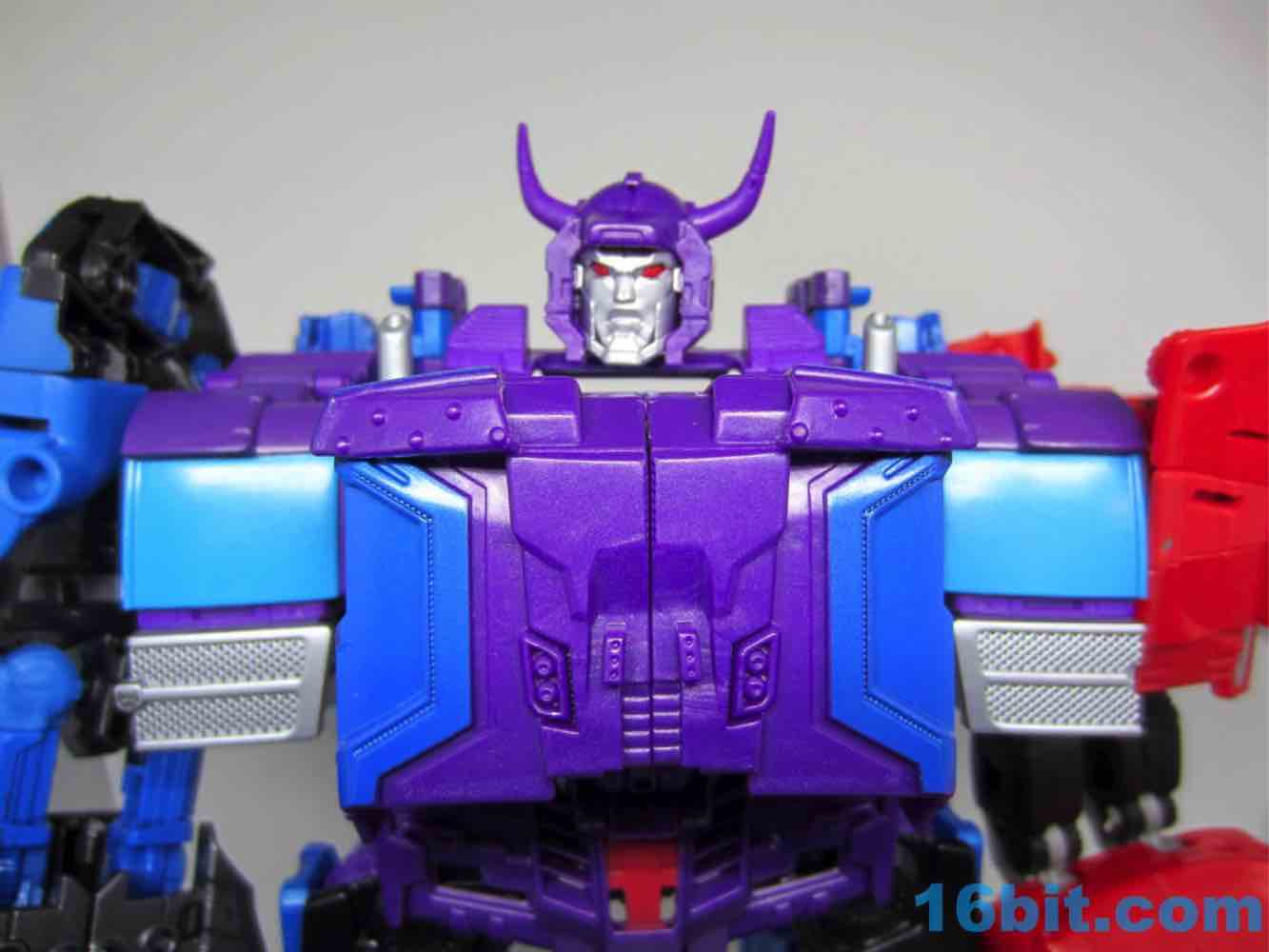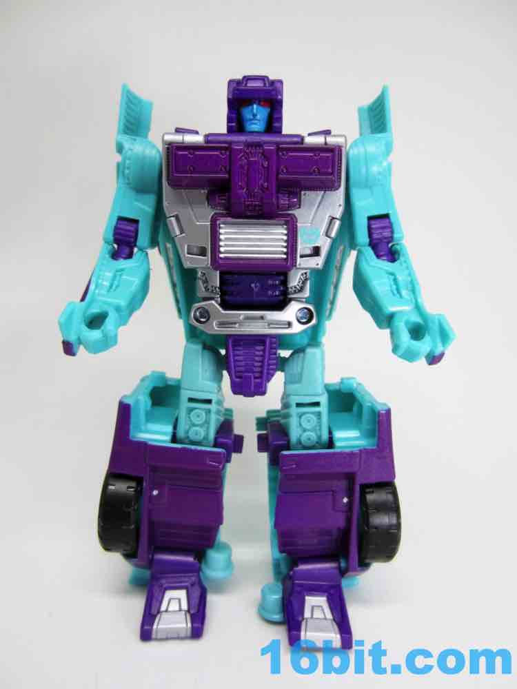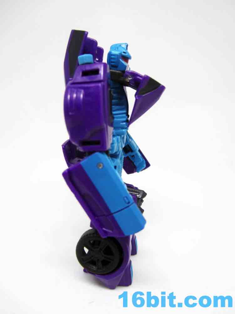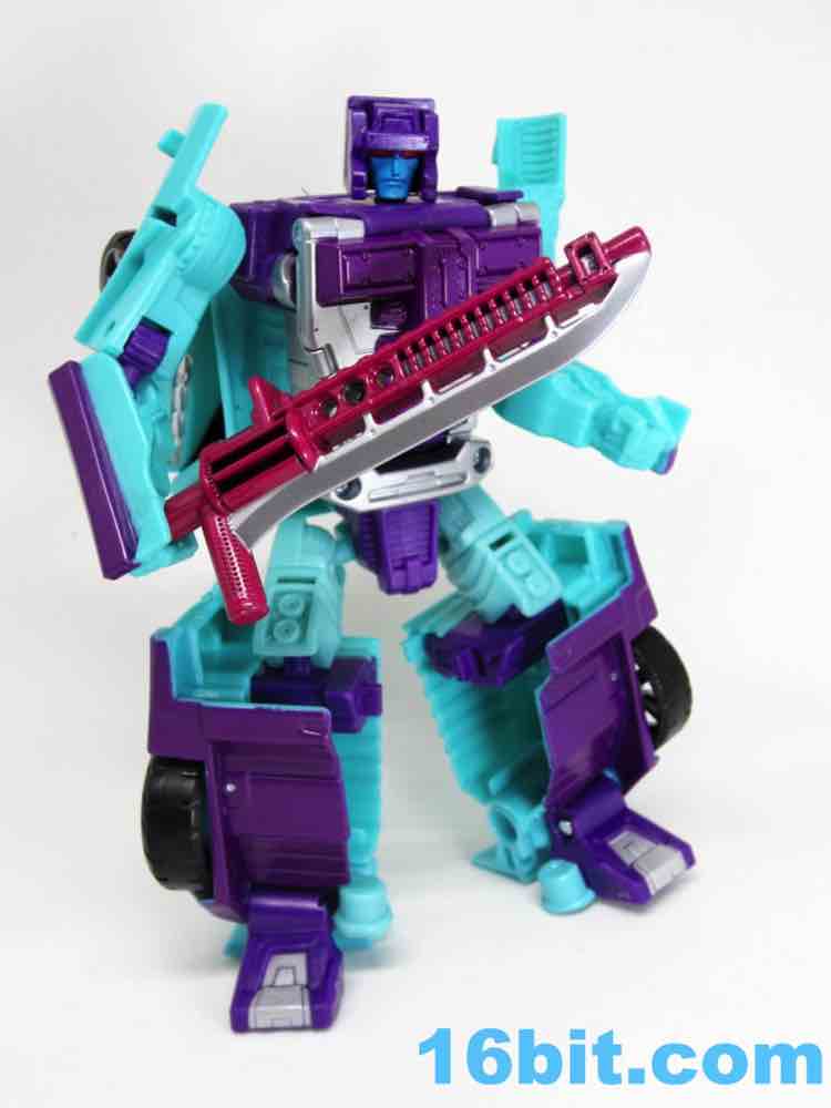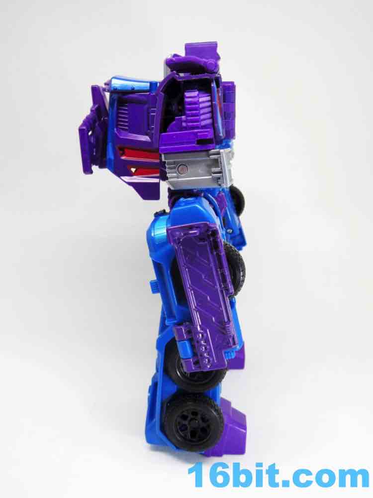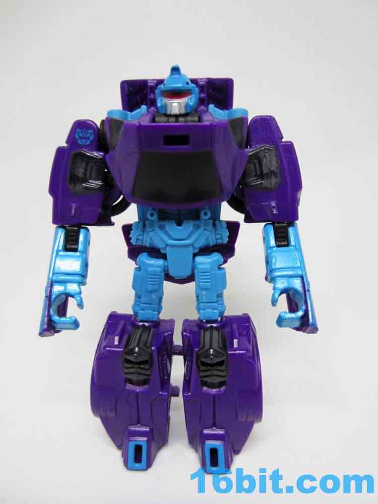 Starting small is Blackjack, who has no proper transforming analog. This time around he's purple with blue accents and a gorgeous silver face mask on his head. The red eyes pop nicely, and a bright blue G2 Decepticon symbol on his right shoulder looks wonderful. An even bigger one appears on his hood, giving this figure a pretty wonderful look. I mean, it's everything you could want in a fake G2 update short of chrome or the word "DECEPTICON" written on his person somewhere. Sadly, this feature was left out across the board. Hasbro was going for ca. 1994 Ugly, but didn't want to go all the way.