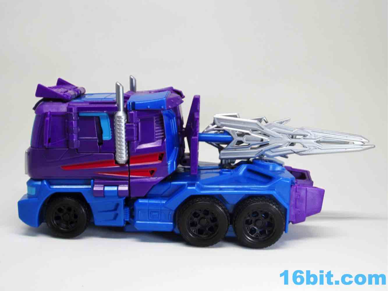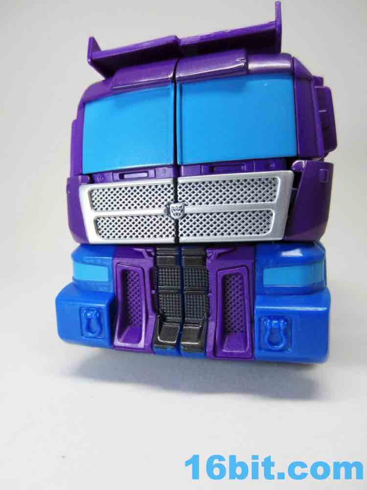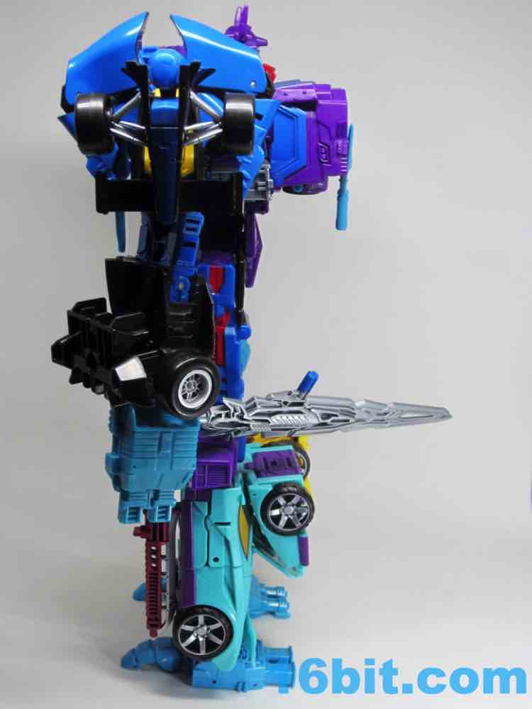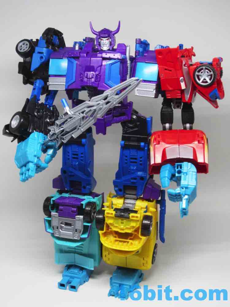 Aside from the aforementioned QC quibbles, it fits together well in Menasor mode as a giant, colorful death robot. He holds the sword nicely, Blackjack fits fairly securely to the chest, and unlike the G1 Menasor all the hands and feet are the same color. Last year's Breakdown had a hand/foot piece that was a different shade of purple than the rest. If you have the regular version, rest assured that this one is slightly better - all of the joints feel a little tighter, and everything fits together just a little more nicely. Granted, you may stumble on challenges with the individual robot modes as I'm fairly sure nobody took into account the effect paint has on a form fit. Paint is, of course, the enemy when it comes to this kind of toys. At a hair under 12-inches high, this is a worthwhile toy just to leave combined on your shelf. It will also make your retinas burn.
