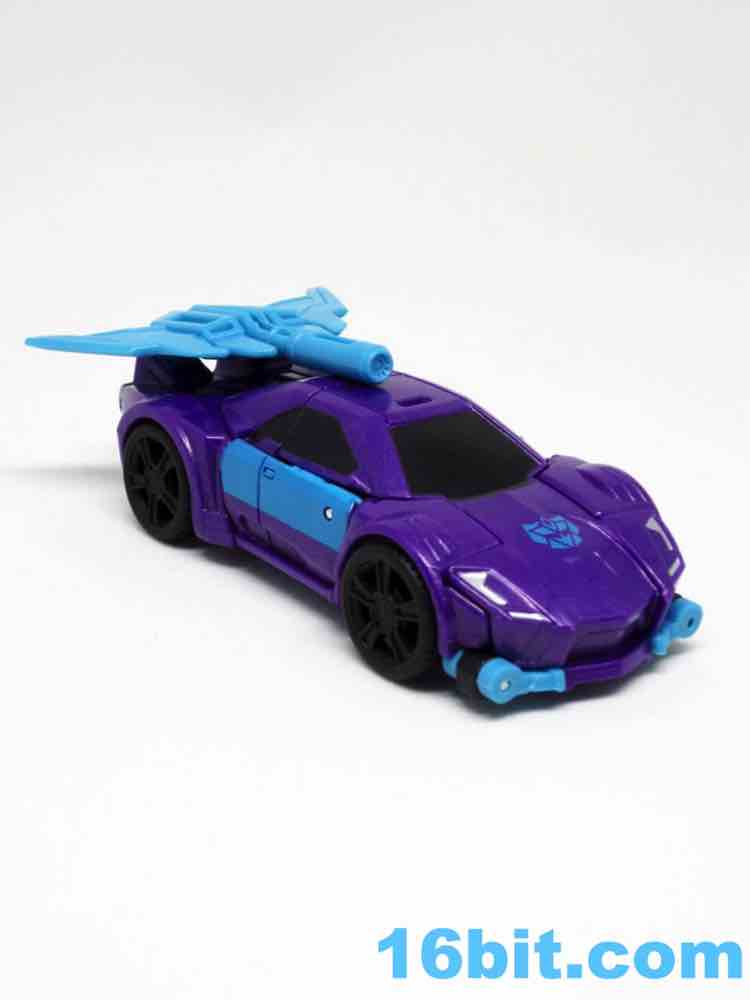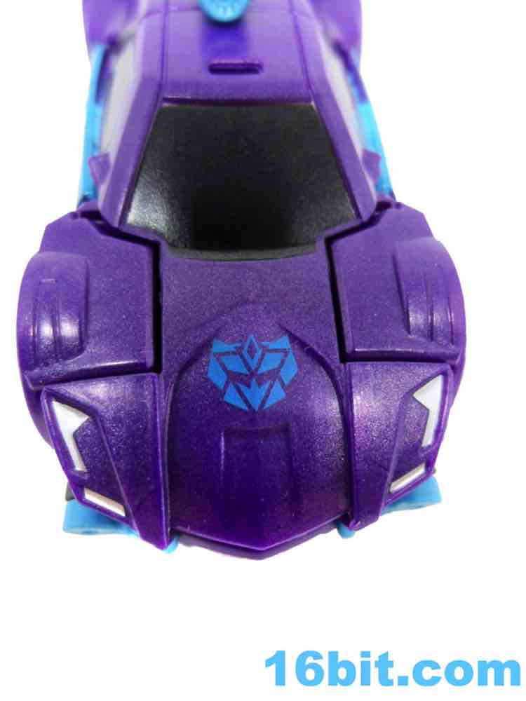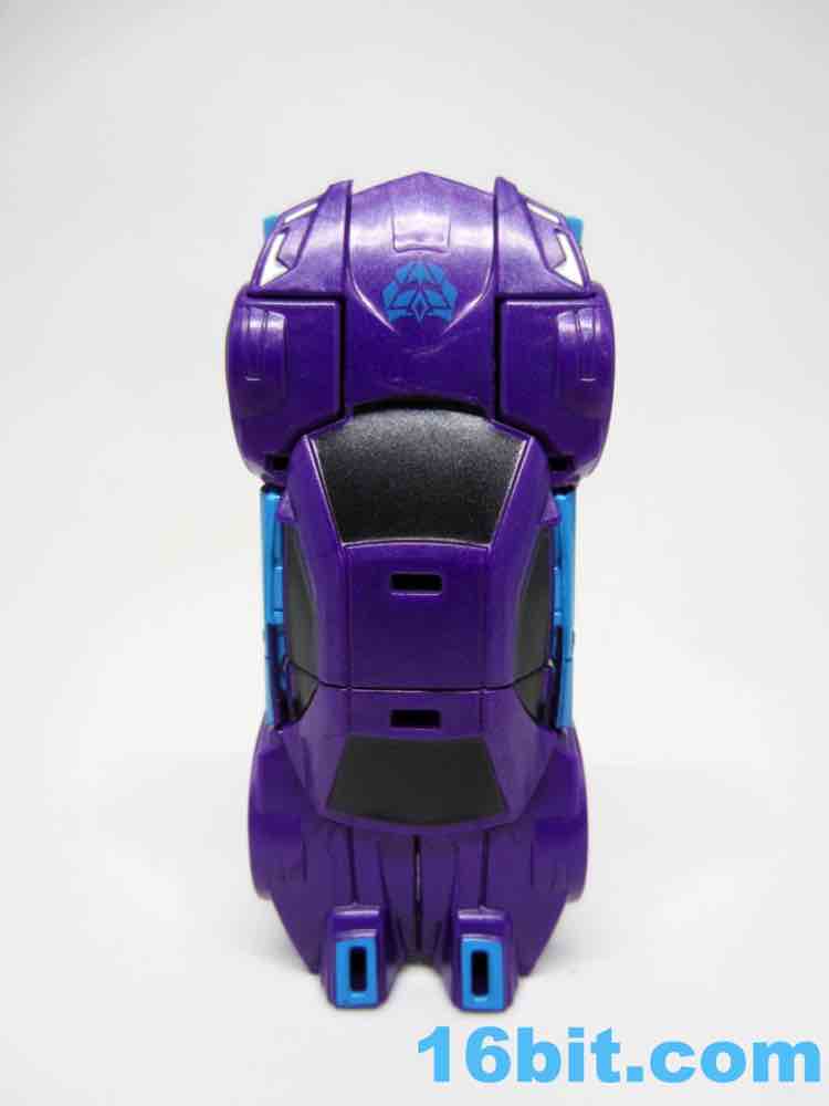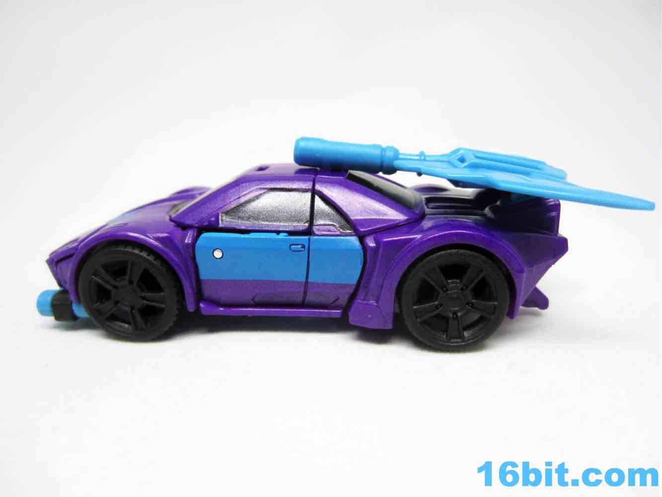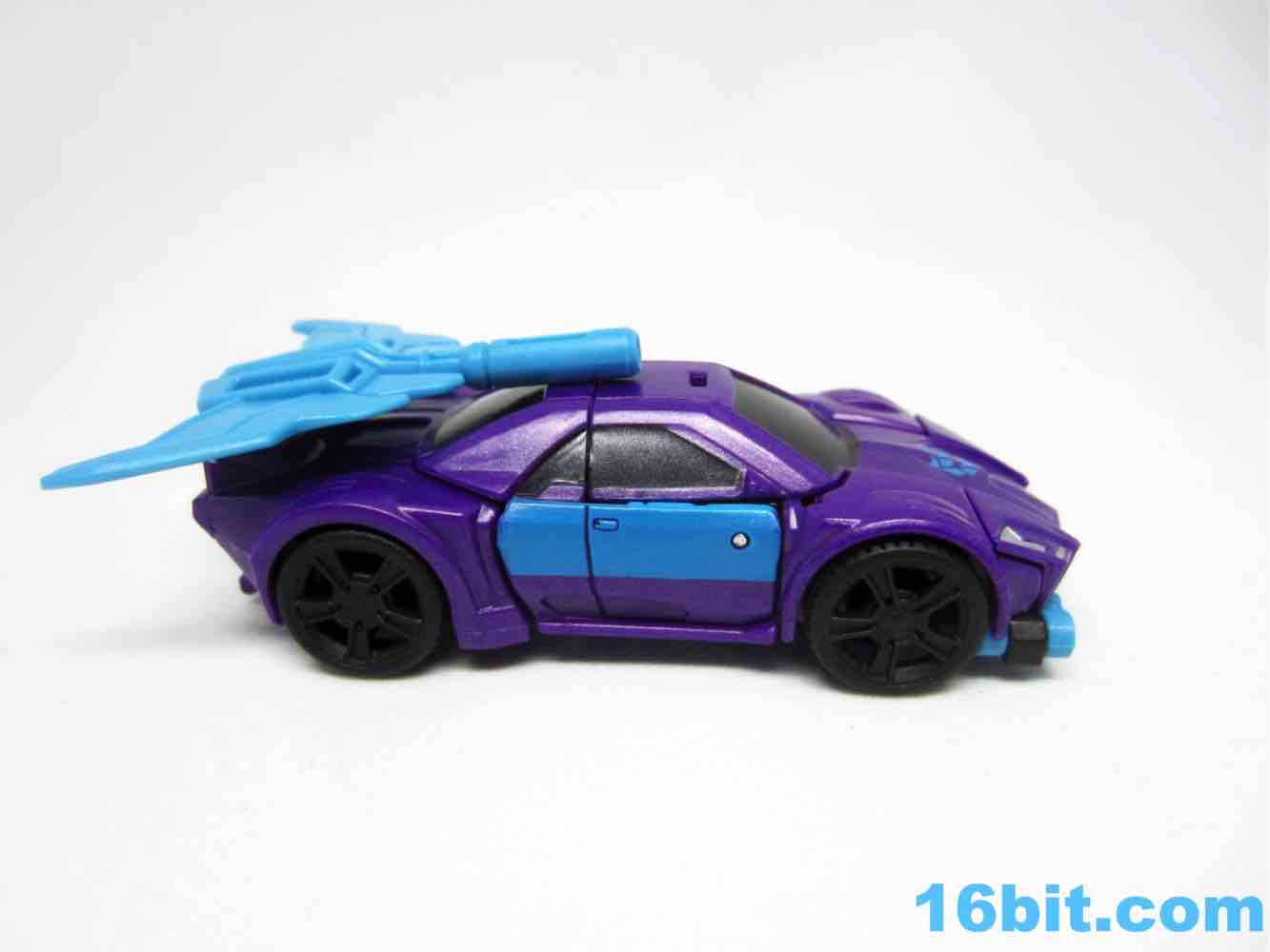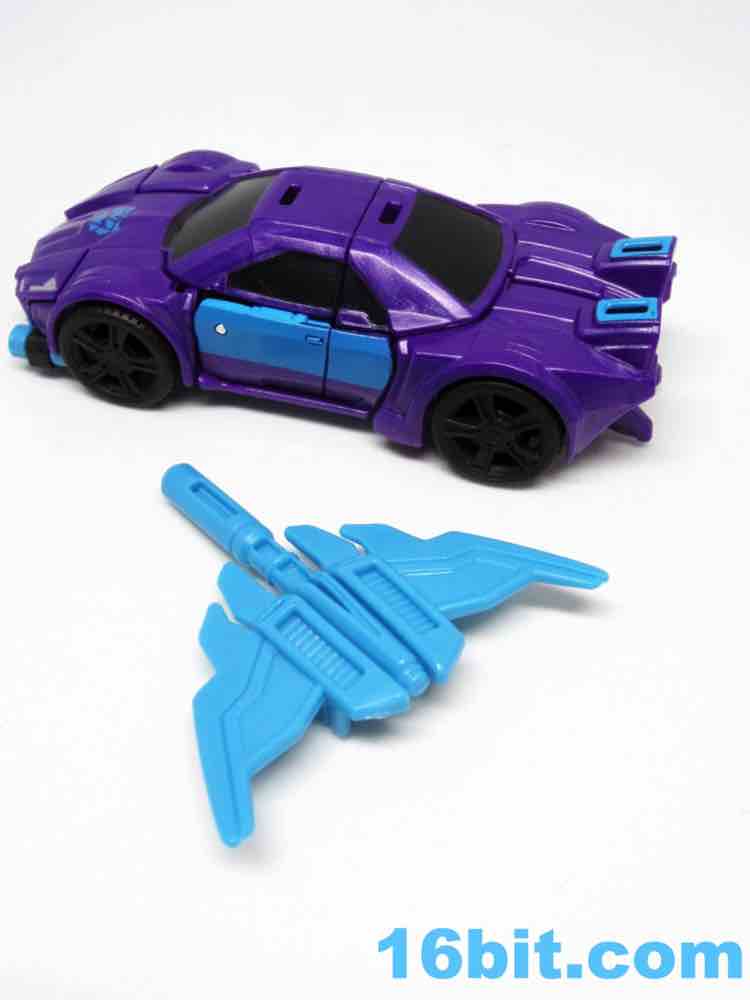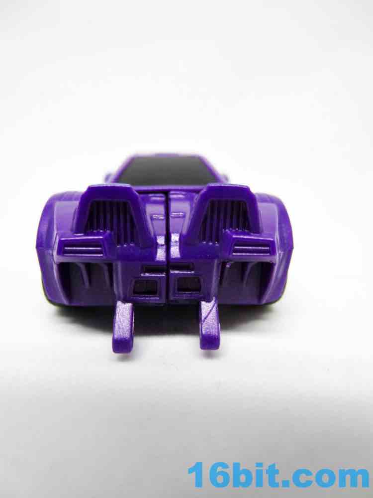 The first figure I plucked out of the box was Brake-Neck, and update of last year's shared online exclusive G1 deco Brake-Neck [FOTD #1218]. This figure pays tribute to the G2 Wildrider you never got, and does a decent job giving you something new and arguably different. Unlike Breakdown, this figure actually has a wild pattern on its roof, but it's pretty small and you won't see much of it in his robot mode. Now given a purple face rather than a red one, the brightly-colored robot has a swell chest pattern with G2 Decepticon symbol. More interesting, though, are a few details on the car mode like a fading stripe tampo on the doors and beautiful painted windows. Also painted is his pipe weapon, molded in a color I can't see because the lovely people at Hasbro decided to give it a metallic candy blue paint job. It's pretty gorgeous up close, and the same weapon (and hand/foot/gun) are included with the next figure in the set.