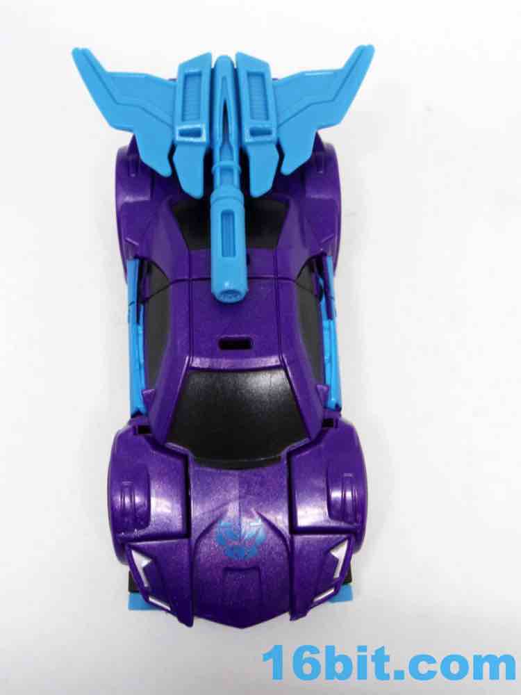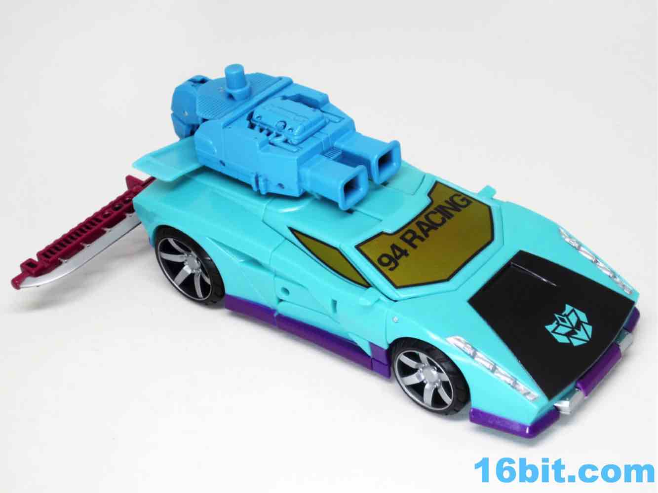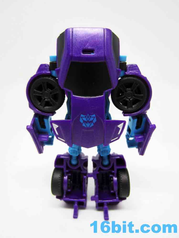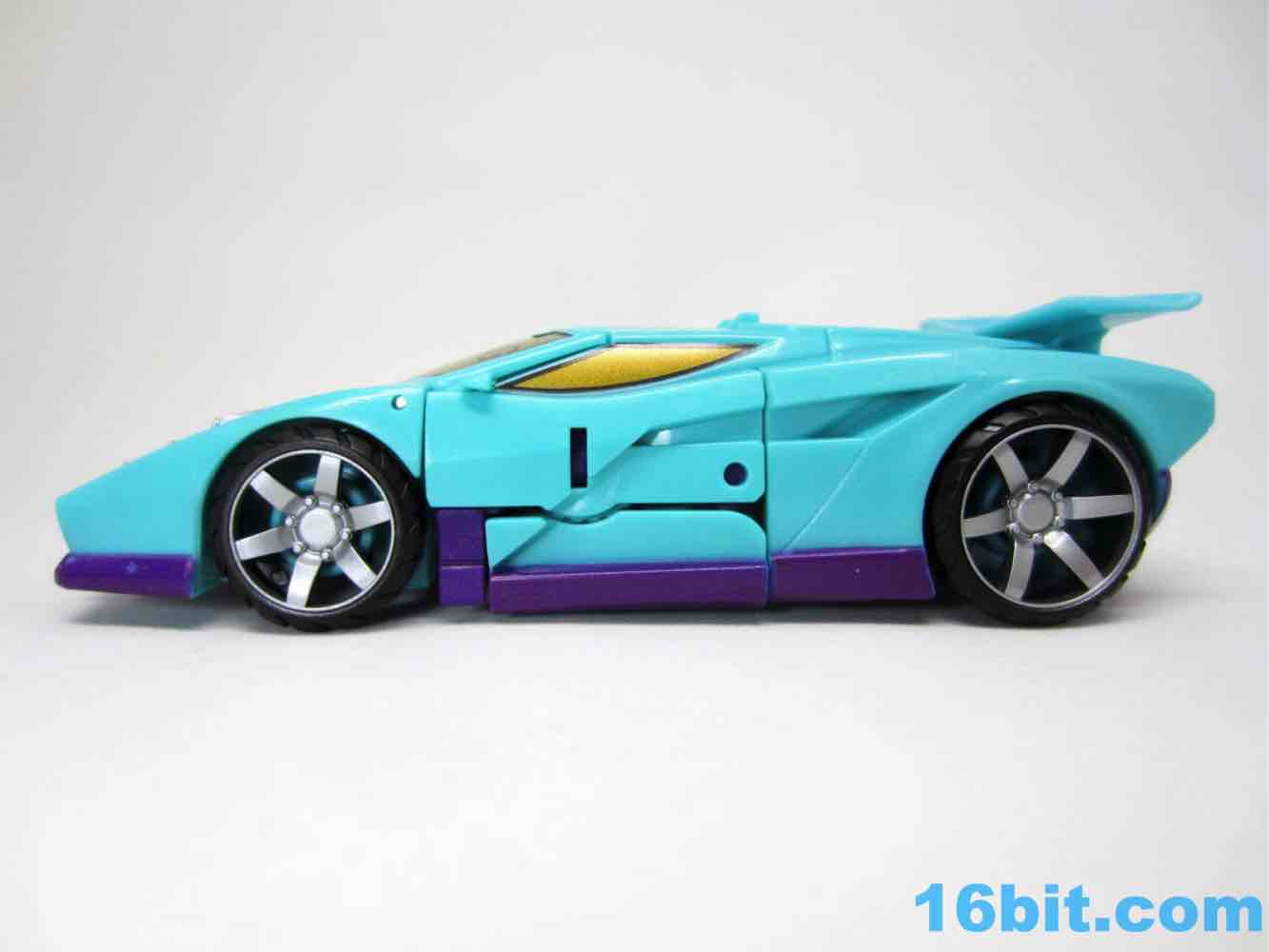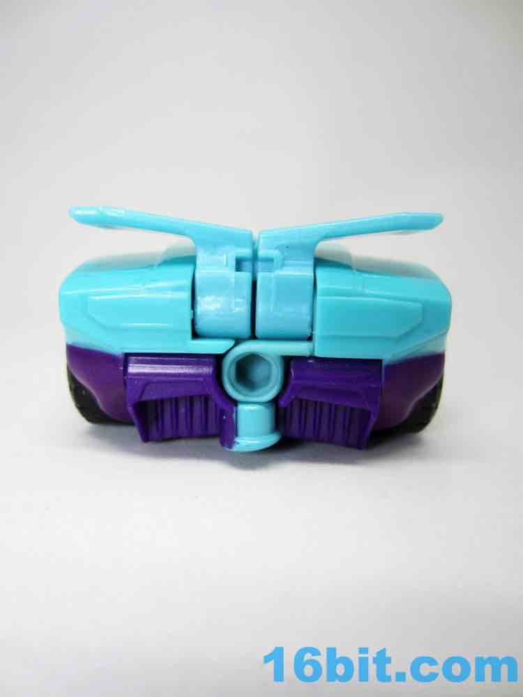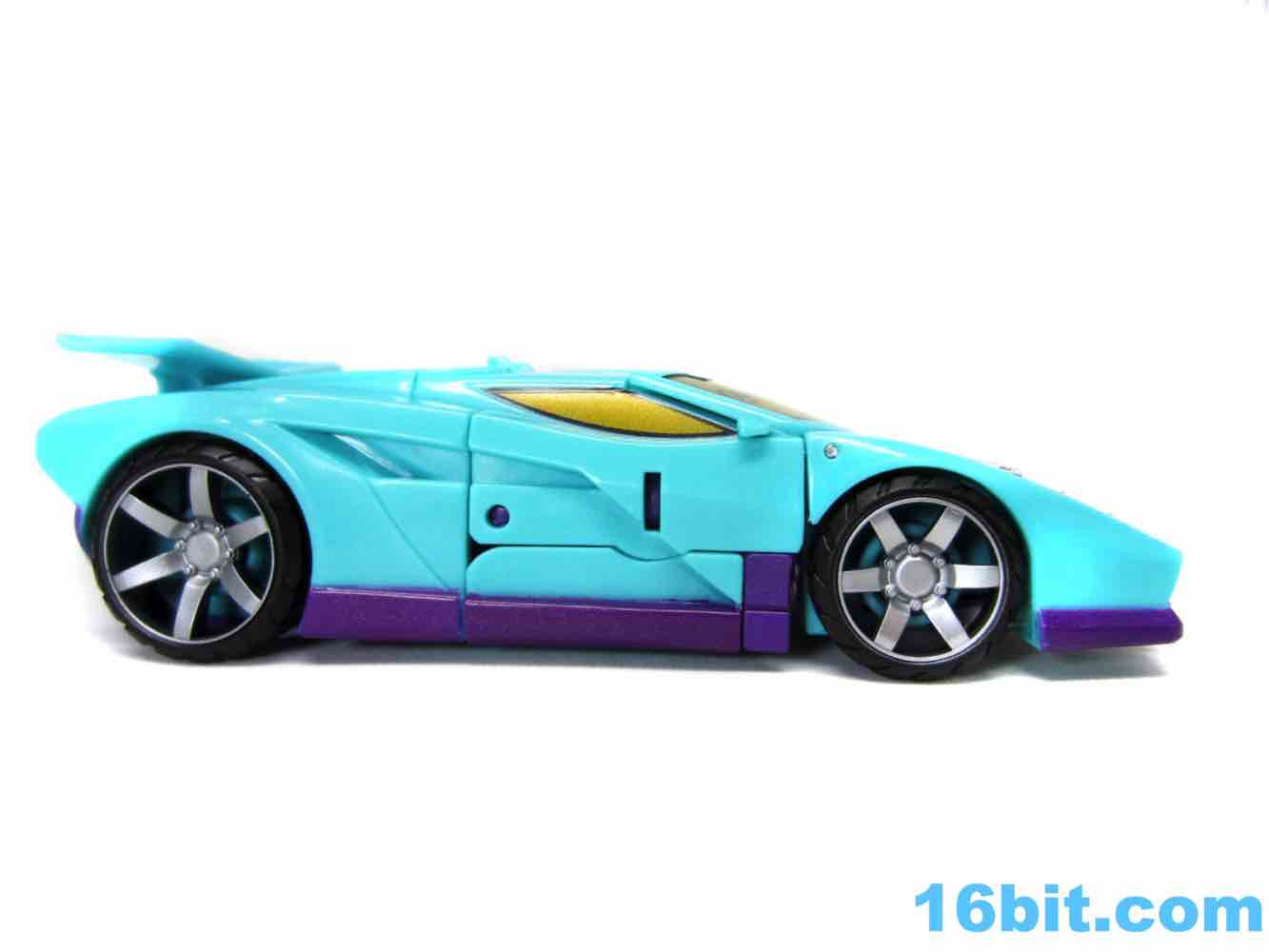 The first figure I plucked out of the box was Brake-Neck, and update of last year's shared online exclusive G1 deco Brake-Neck [FOTD #1218]. This figure pays tribute to the G2 Wildrider you never got, and does a decent job giving you something new and arguably different. Unlike Breakdown, this figure actually has a wild pattern on its roof, but it's pretty small and you won't see much of it in his robot mode. Now given a purple face rather than a red one, the brightly-colored robot has a swell chest pattern with G2 Decepticon symbol. More interesting, though, are a few details on the car mode like a fading stripe tampo on the doors and beautiful painted windows. Also painted is his pipe weapon, molded in a color I can't see because the lovely people at Hasbro decided to give it a metallic candy blue paint job. It's pretty gorgeous up close, and the same weapon (and hand/foot/gun) are included with the next figure in the set.
