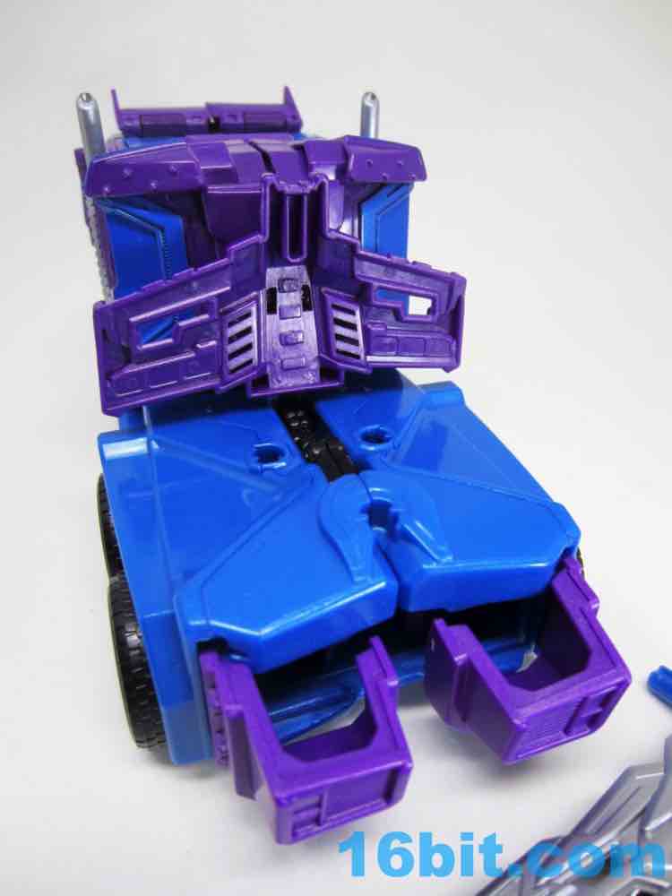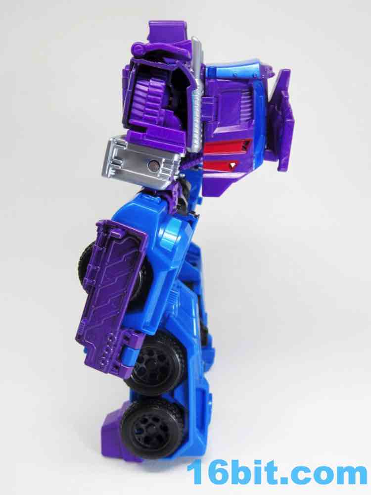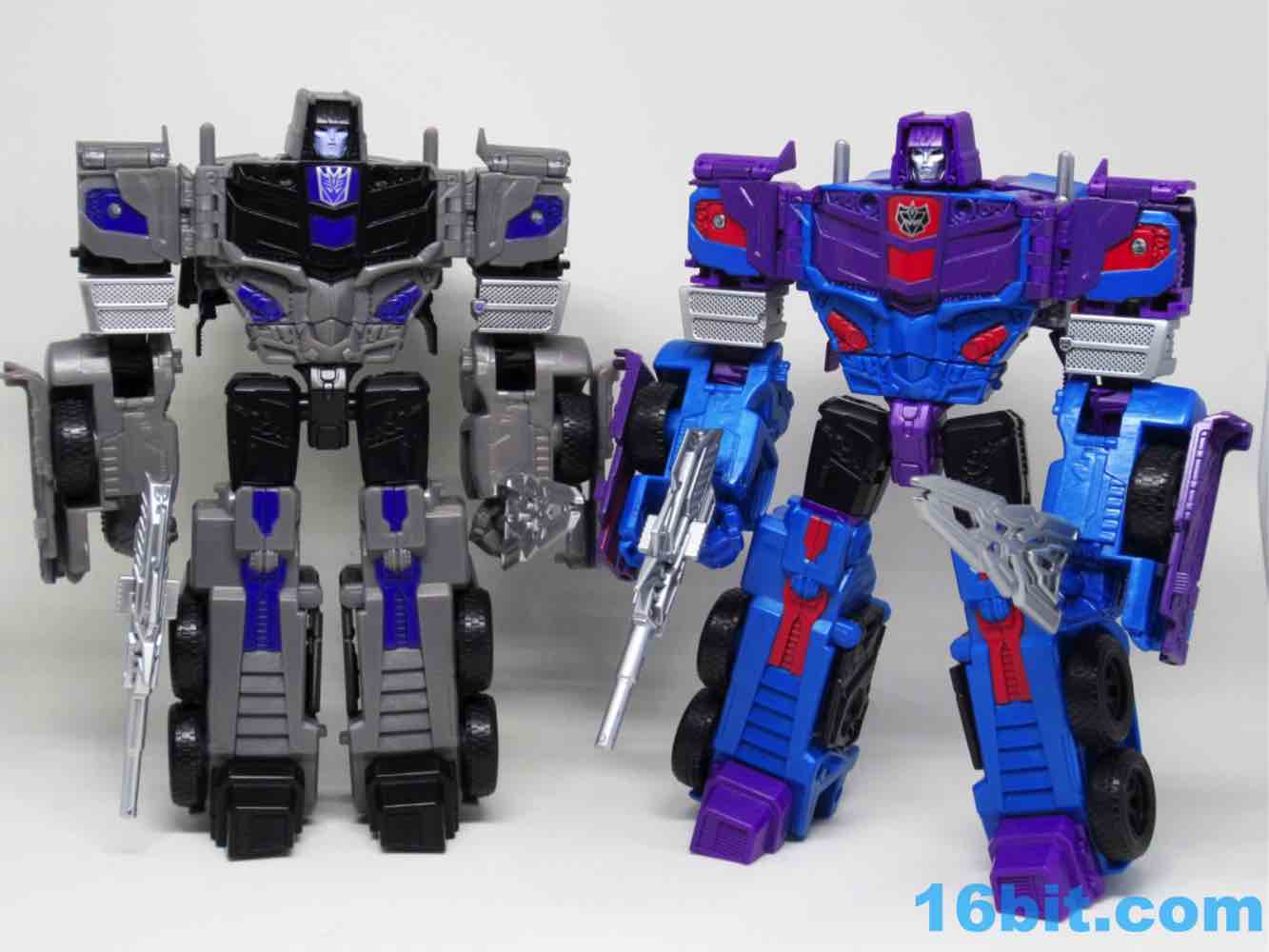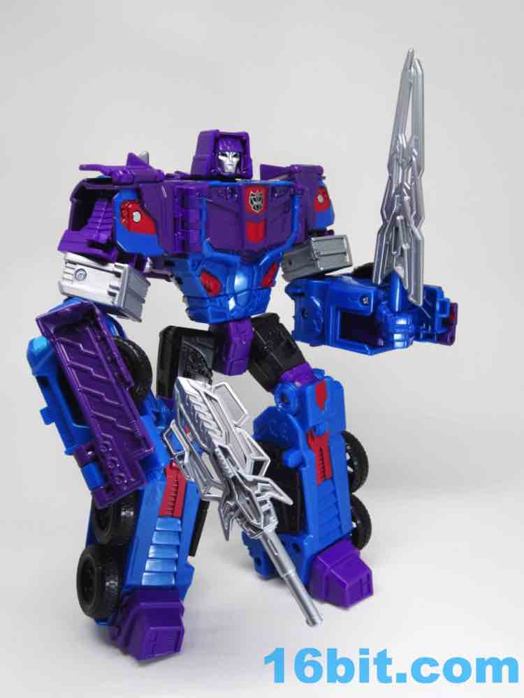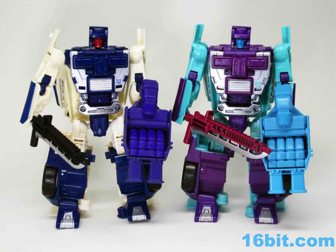 The biggest figure in the set is Motormaster, and he absolutely evokes the spirit of the rarely-seen original. As far as I know a fully-stickered G2 1994 sample has rarely - if not never - been seen, so I would say the blue and purple meet expectations with the red spot color looking cool, but not necessarily authentic. (Or, for that matter, inauthentic.) A black G2 tampo on his chest looks wonderful with a silver outline, which is sort of out of line with how those symbols looked in the day but I'd be lying if I said it didn't make me smile. What may be the smallest G2 Decepticon sigil ever appears on the left arm, just above the elbow - it's on the truck grille in vehicle mode. His rifle and sword combine to make a giant, silver sword and that's how the original toy's weapon looked. However, the original toy had a non-combining rifle too, an that was a different color. Ah well. Still - it's impressive, and pretty. Much like the individually packaged G1-deco toy, the wheels are unpainted. I do not expect this will bother anyone too much, because it's not like you have a G2 Motormaster sitting on your shelf to compare this to unless you're like one guy.