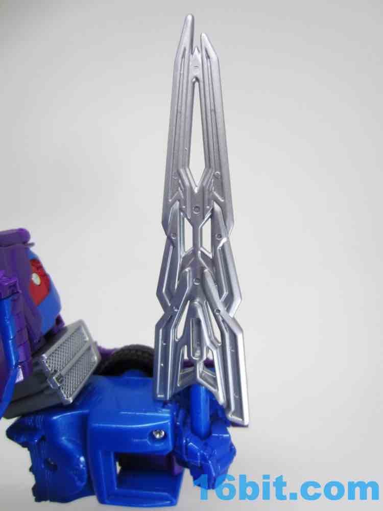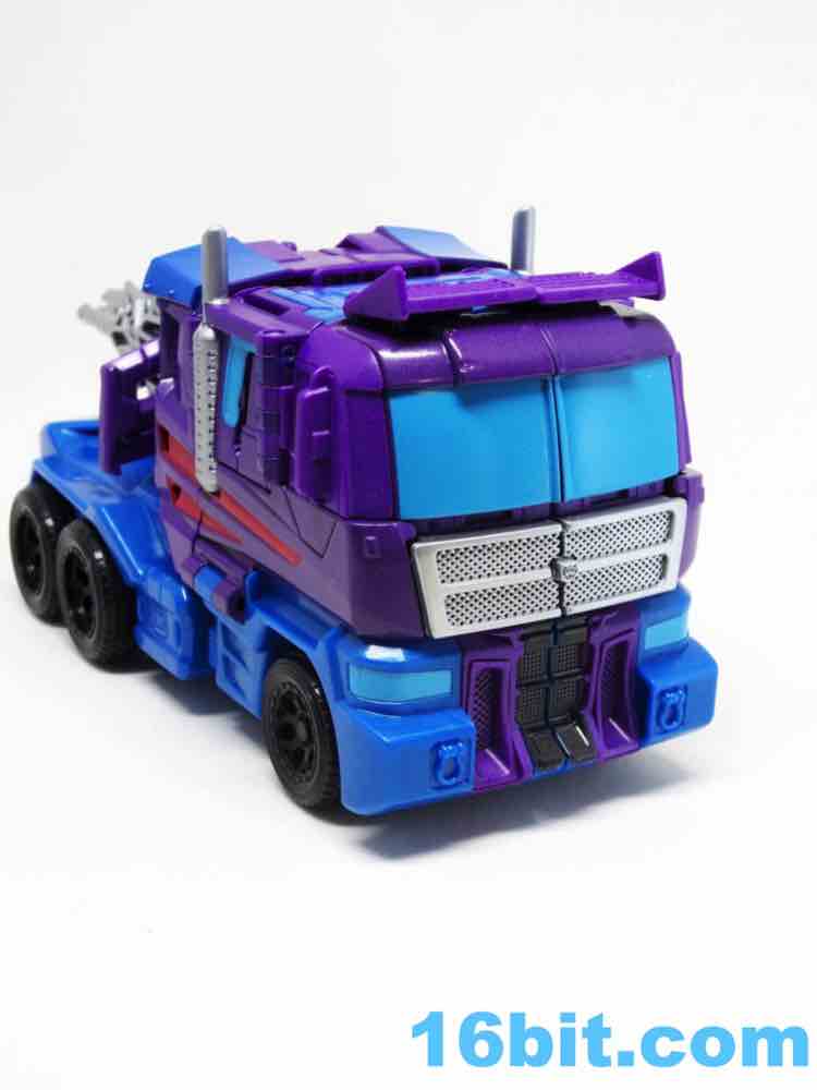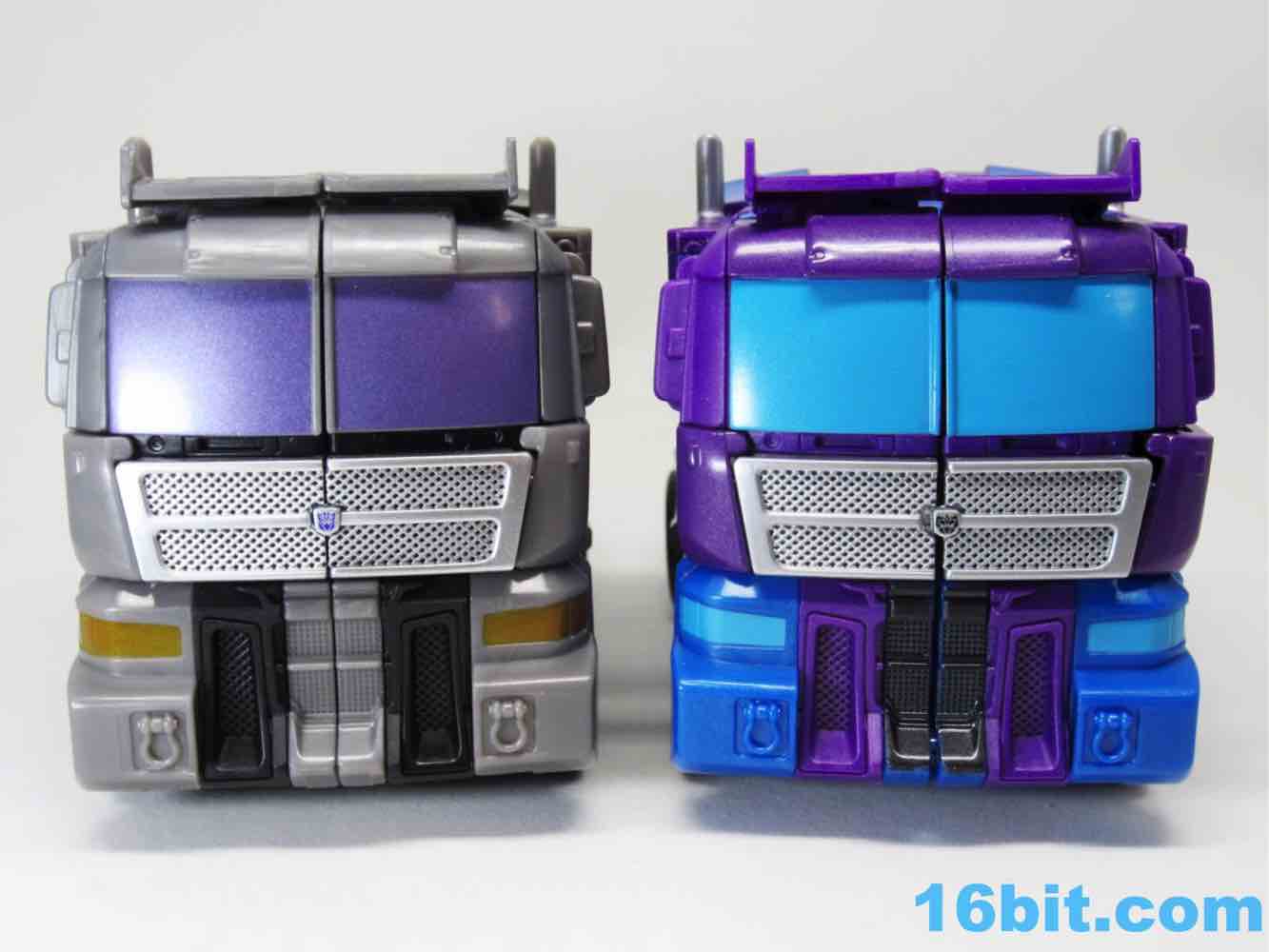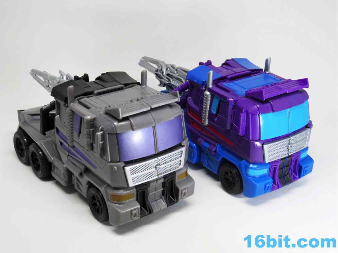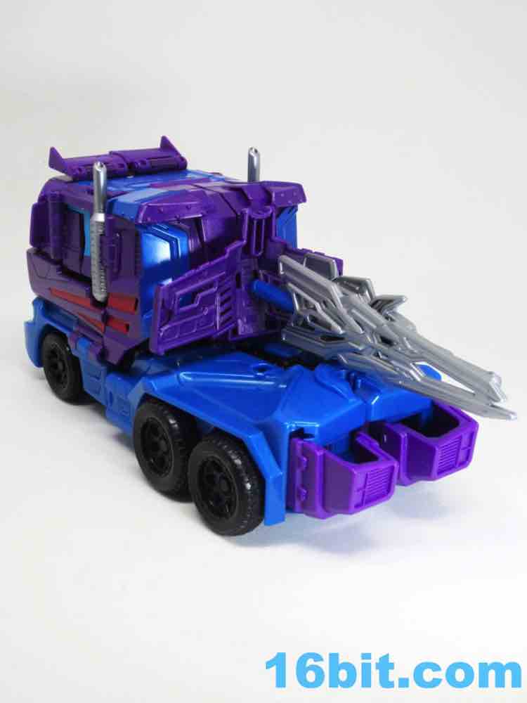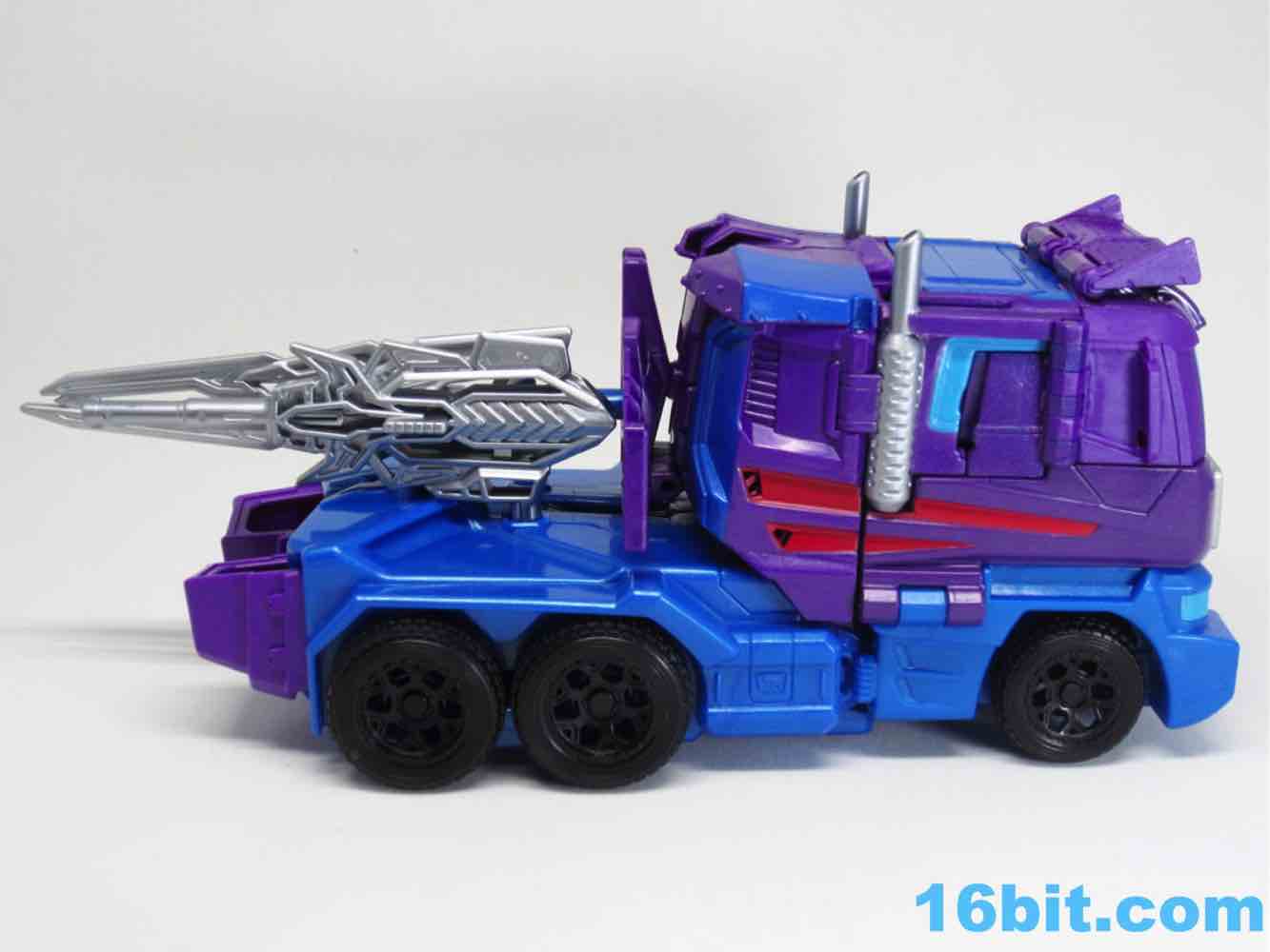 The biggest figure in the set is Motormaster, and he absolutely evokes the spirit of the rarely-seen original. As far as I know a fully-stickered G2 1994 sample has rarely - if not never - been seen, so I would say the blue and purple meet expectations with the red spot color looking cool, but not necessarily authentic. (Or, for that matter, inauthentic.) A black G2 tampo on his chest looks wonderful with a silver outline, which is sort of out of line with how those symbols looked in the day but I'd be lying if I said it didn't make me smile. What may be the smallest G2 Decepticon sigil ever appears on the left arm, just above the elbow - it's on the truck grille in vehicle mode. His rifle and sword combine to make a giant, silver sword and that's how the original toy's weapon looked. However, the original toy had a non-combining rifle too, an that was a different color. Ah well. Still - it's impressive, and pretty. Much like the individually packaged G1-deco toy, the wheels are unpainted. I do not expect this will bother anyone too much, because it's not like you have a G2 Motormaster sitting on your shelf to compare this to unless you're like one guy.
