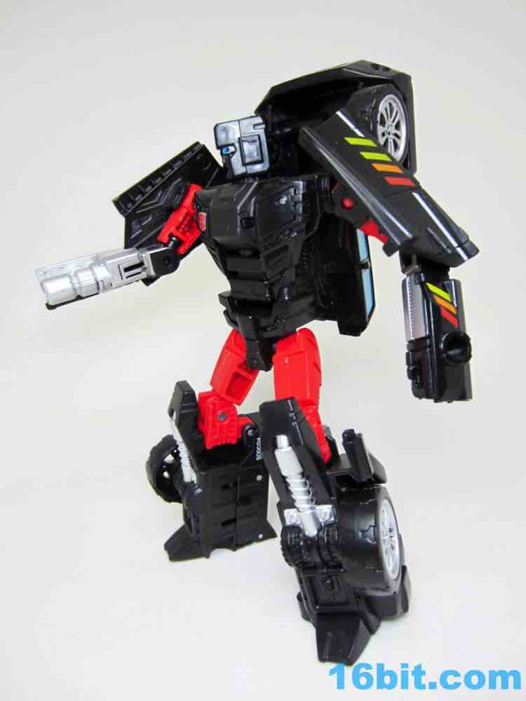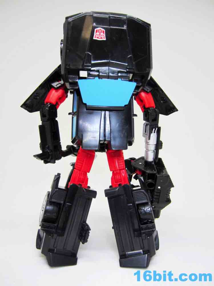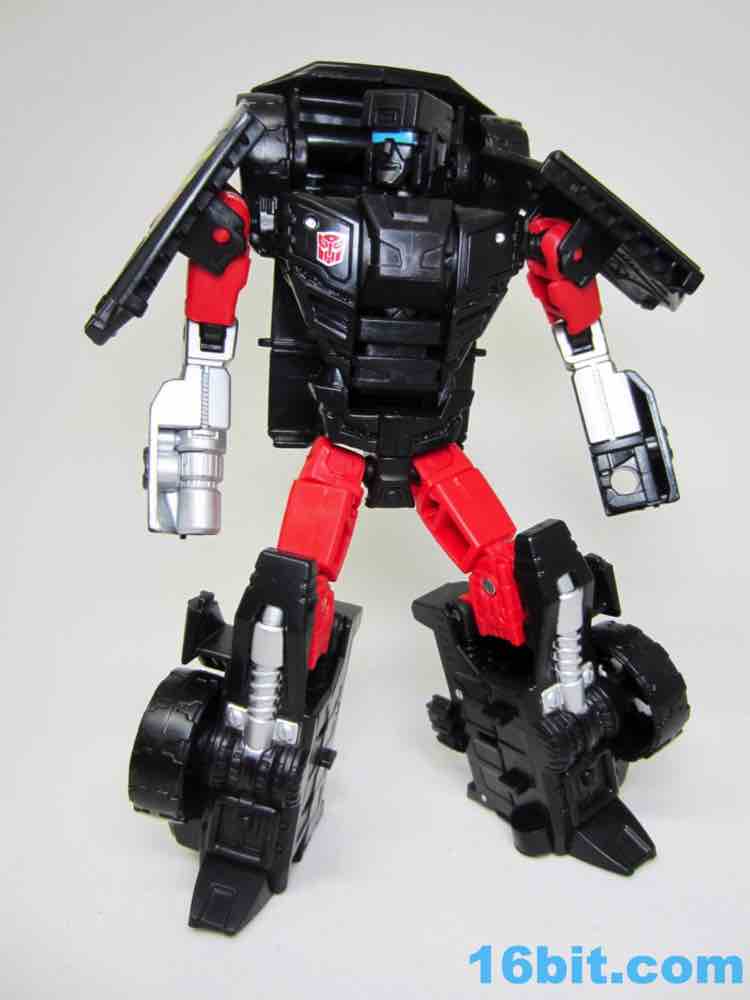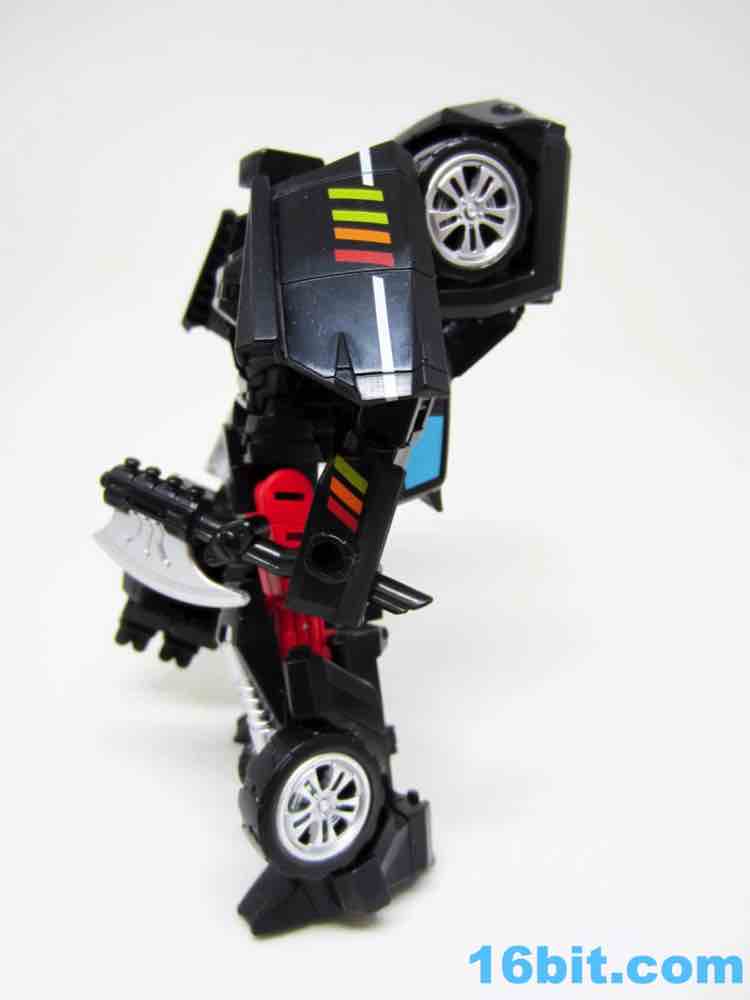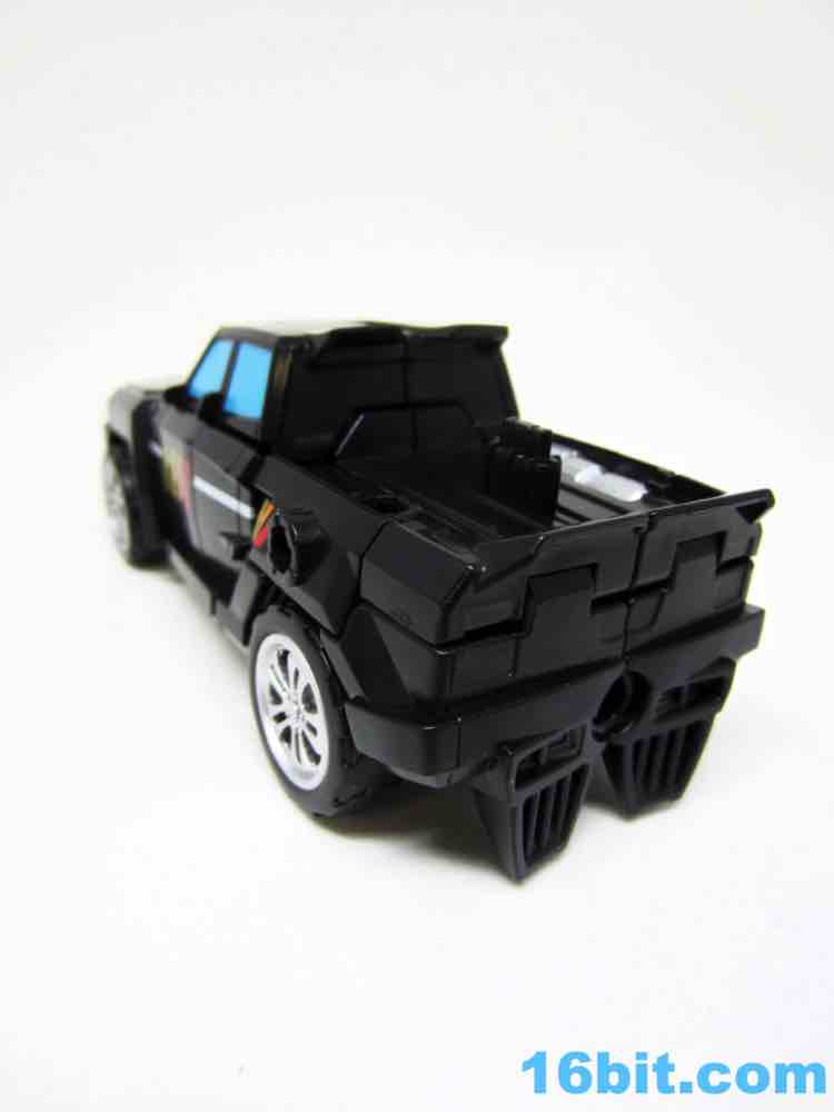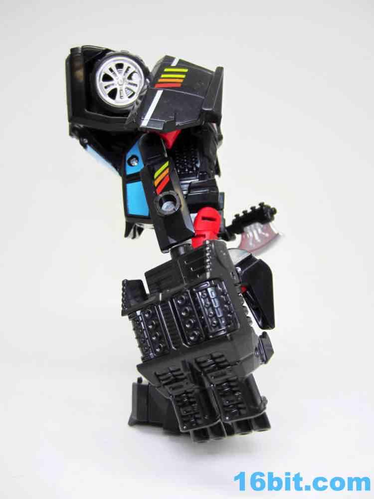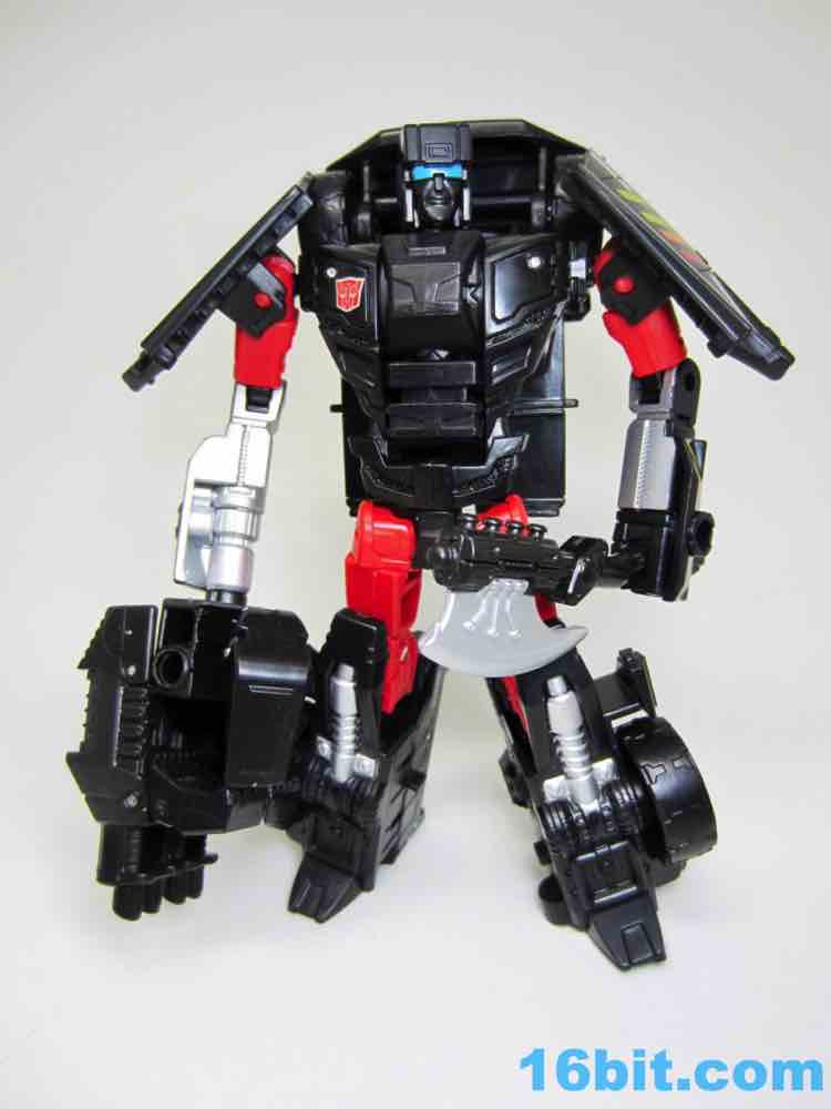 While not exactly the same as Ironhide [FOTD #1,311] and Offroad [FOTD #1,193], they all function pretty much the same. Articulation is unchanged, the transformation is identical, he's the same height, and really all you have to note is the new head and arms and deco. The right arm is 5mm compatible, but the included axe accessory is a little loose - you can cram his combiner hand in there, though, and that's pretty cool. The left hand functions as most hands do, while everything else is par for the course. There's plenty of black and red, while the color from the truck shell is largely pushed to the side. The blue windows are also hidden in this mode, but at least you get the really cool all-black head as seen on the original TV show. He even has the blue visor - it's nice. The whole lighting rig hat, though, is gone.