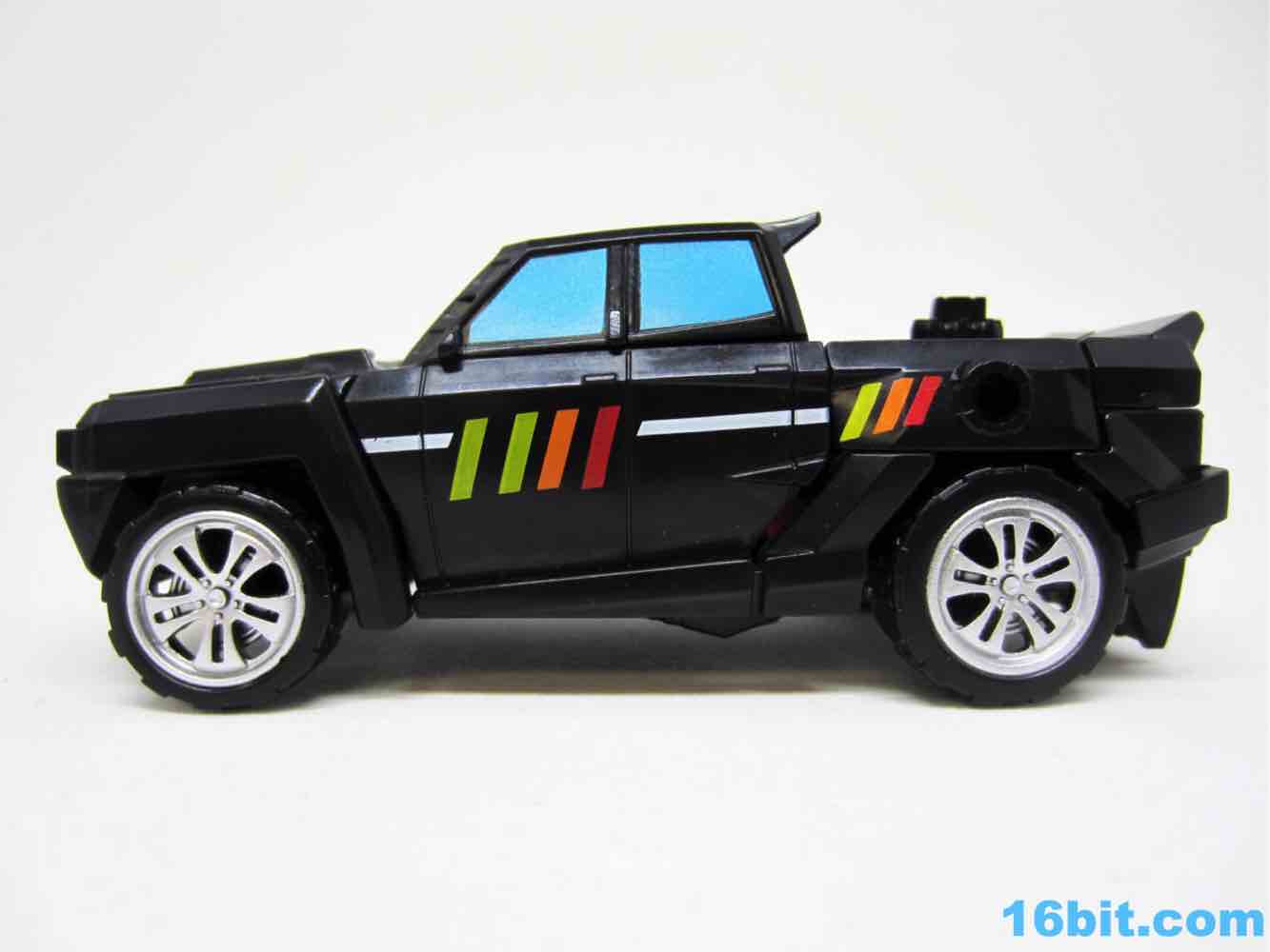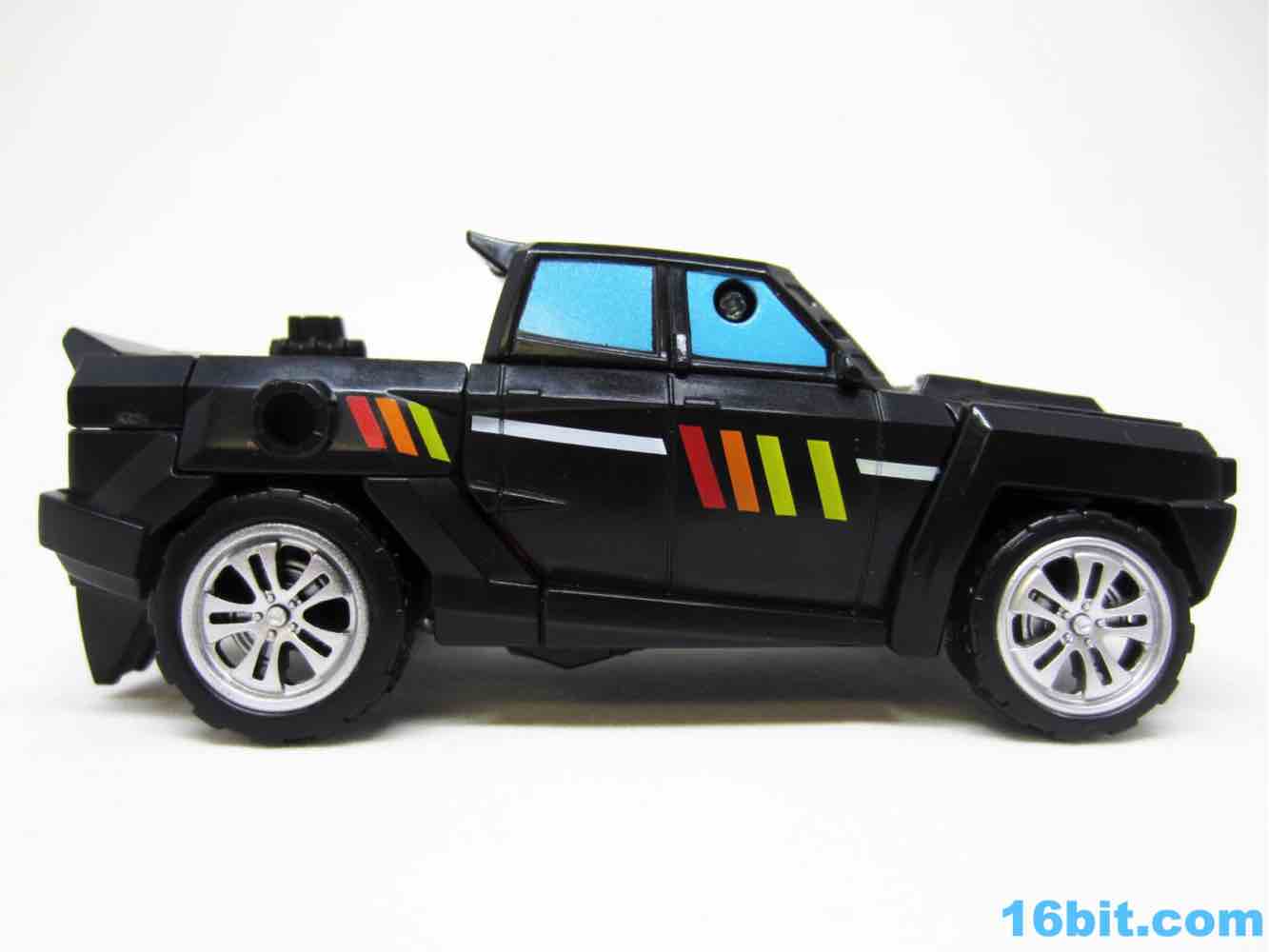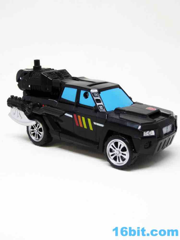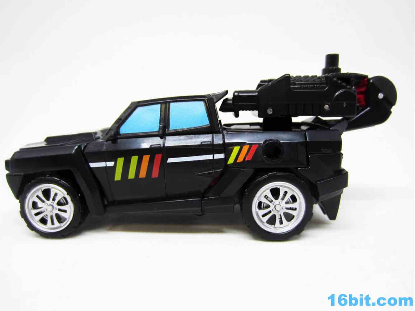Transformation is nothing you haven't seen before. The truck isn't really either - it just adds black paint and Trailbreaker deco marks, sans camper lid. It's nice, with all of the gentle lack of innovation the word "nice" conveys. It has a nice silver-bordered Autobrand, some stripes, and you can see his gun hand mounted in the truck bed. You can even mount the gun hand on a post on the back, giving it a silhouette that's closer to the camper-esque original. It's not an exact update of the original, but it's not like they didn't reissue the original or do a couple of other toys named Trailcutter you could buy, anyway.