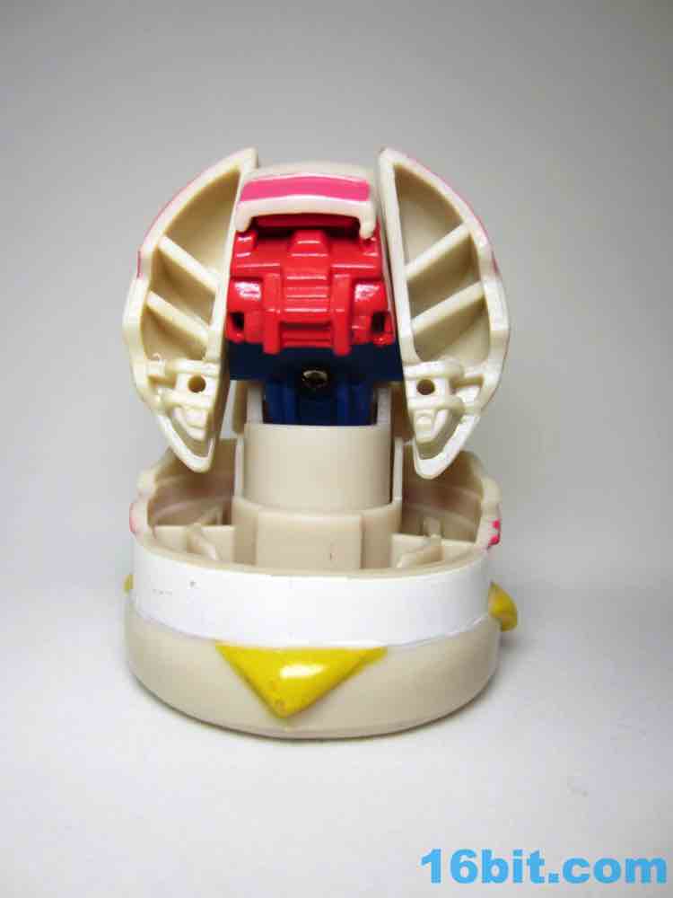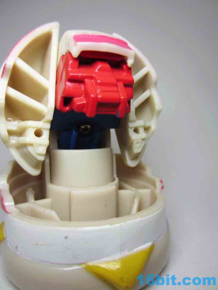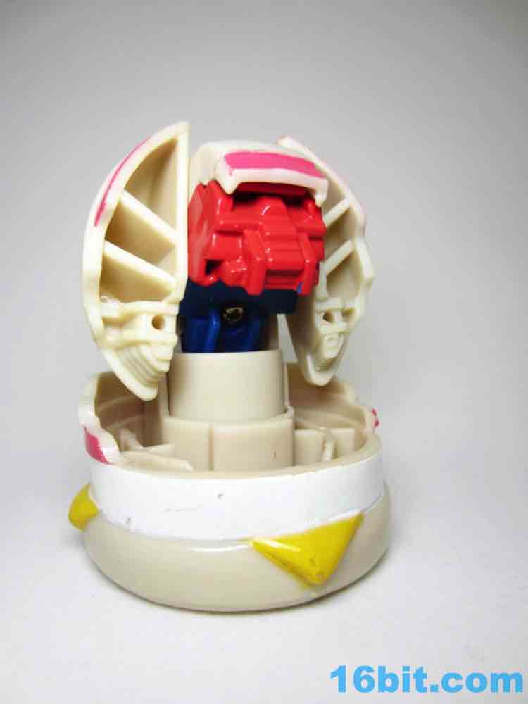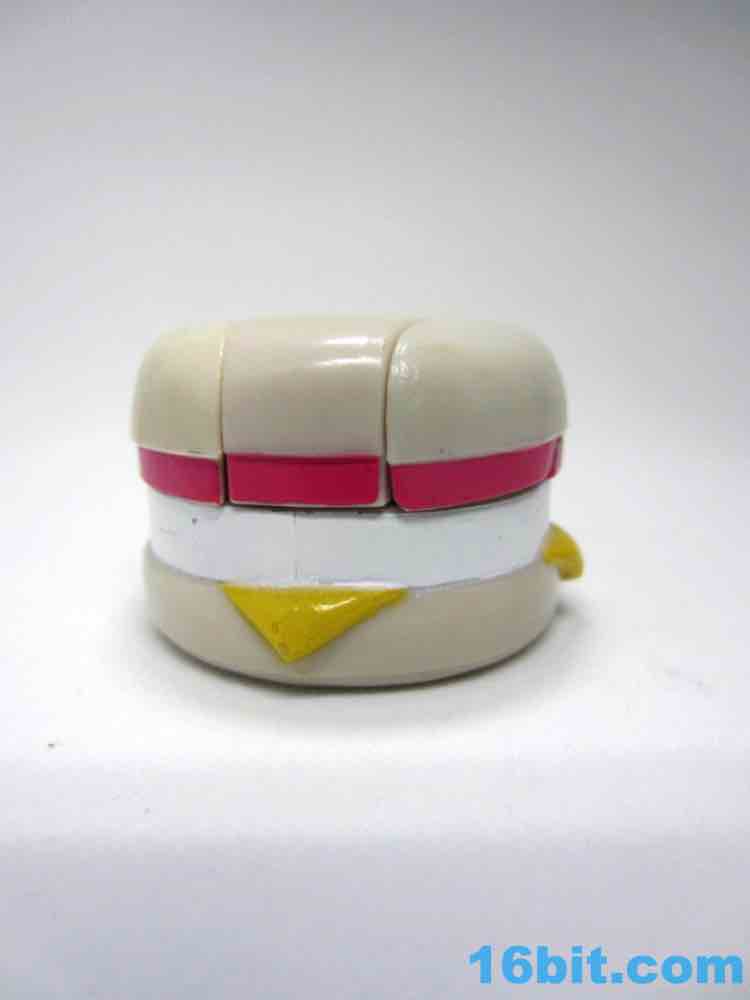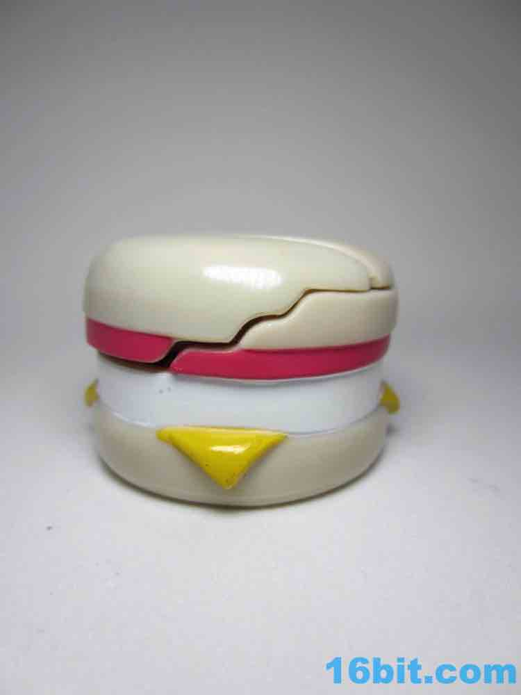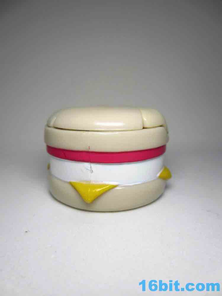 Transformation is actually sort of clever, especially for the era. The robot can come out when you press up in a small hole in the bottom of the food mode - the top of the bun separates, and you can lift it up and rotate the arms out. It's simple, and it's not a particularly great and fun toy but there are some good elements to it.
