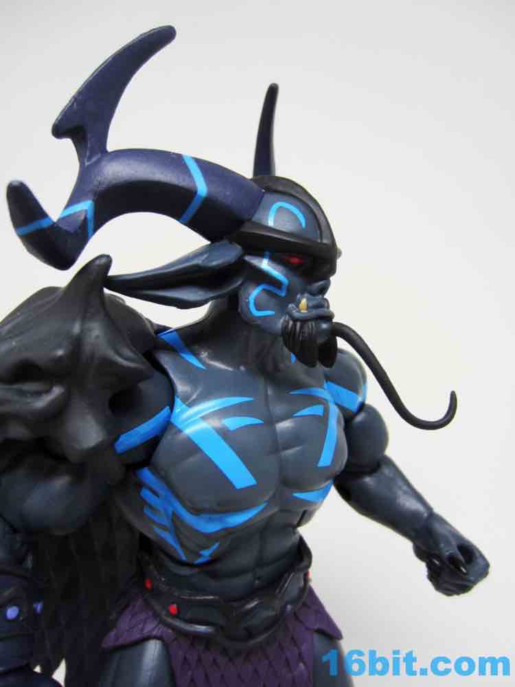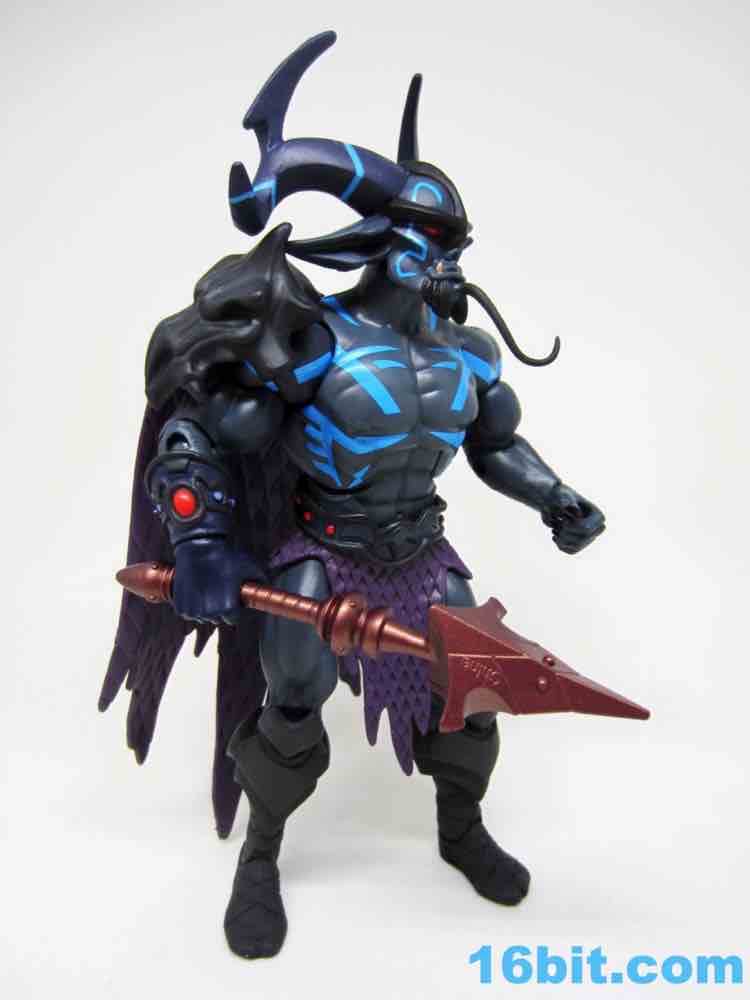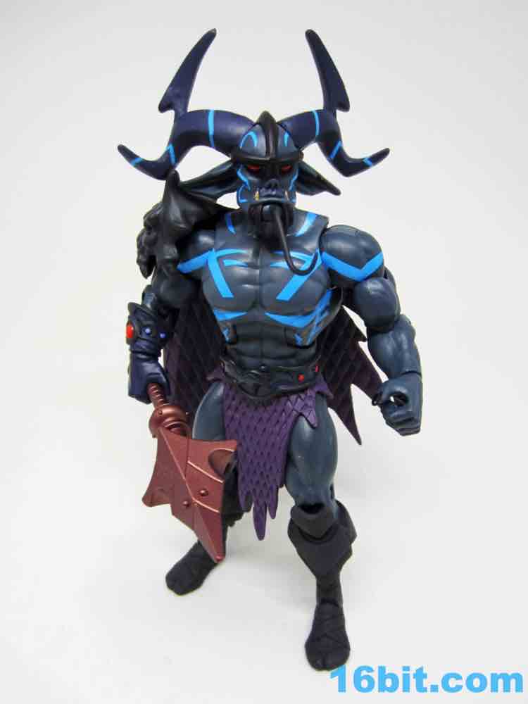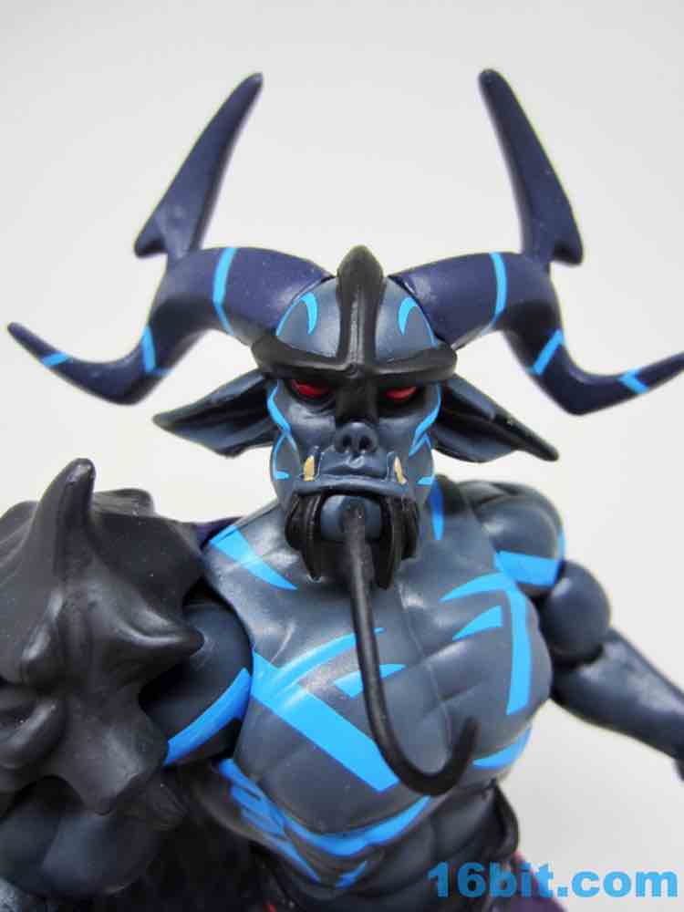 The dark grey buck has some blue markings, a new loincloth, new boots, and a new cape that's installed in a retooled right shoulder. it's quite a nice fit. The head is huge, covered in horns and numerous pointy bits. Between the color, fangs, and pointy ears, he looks significantly different than anything else on my Matty shelves.