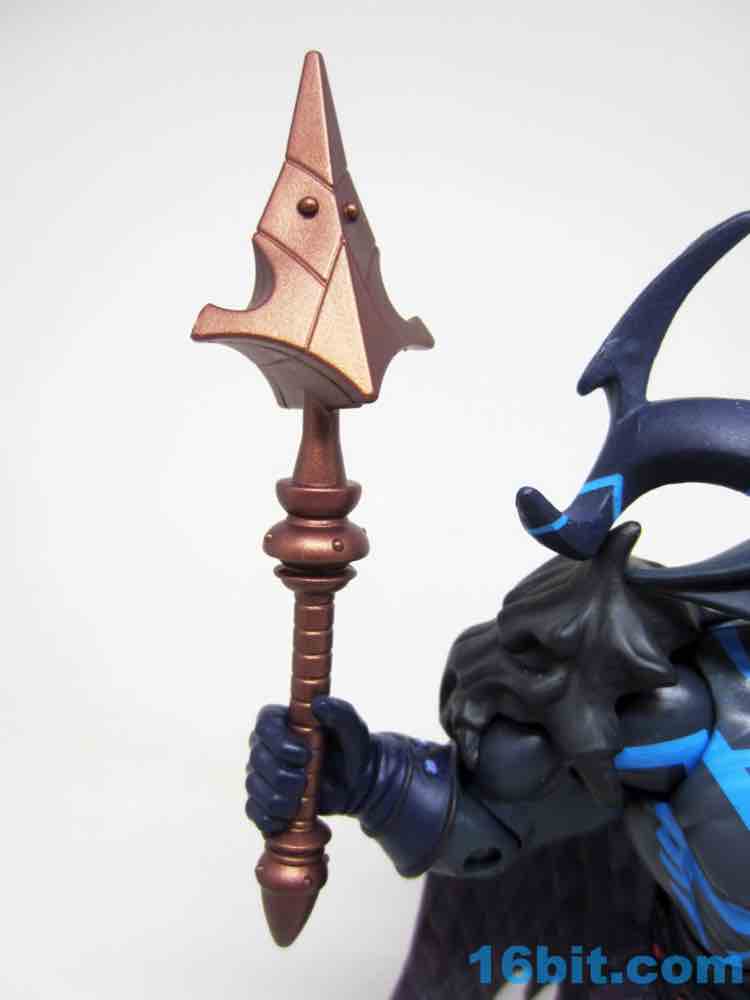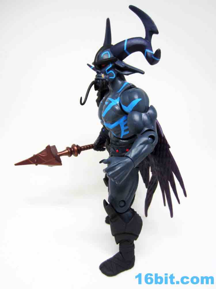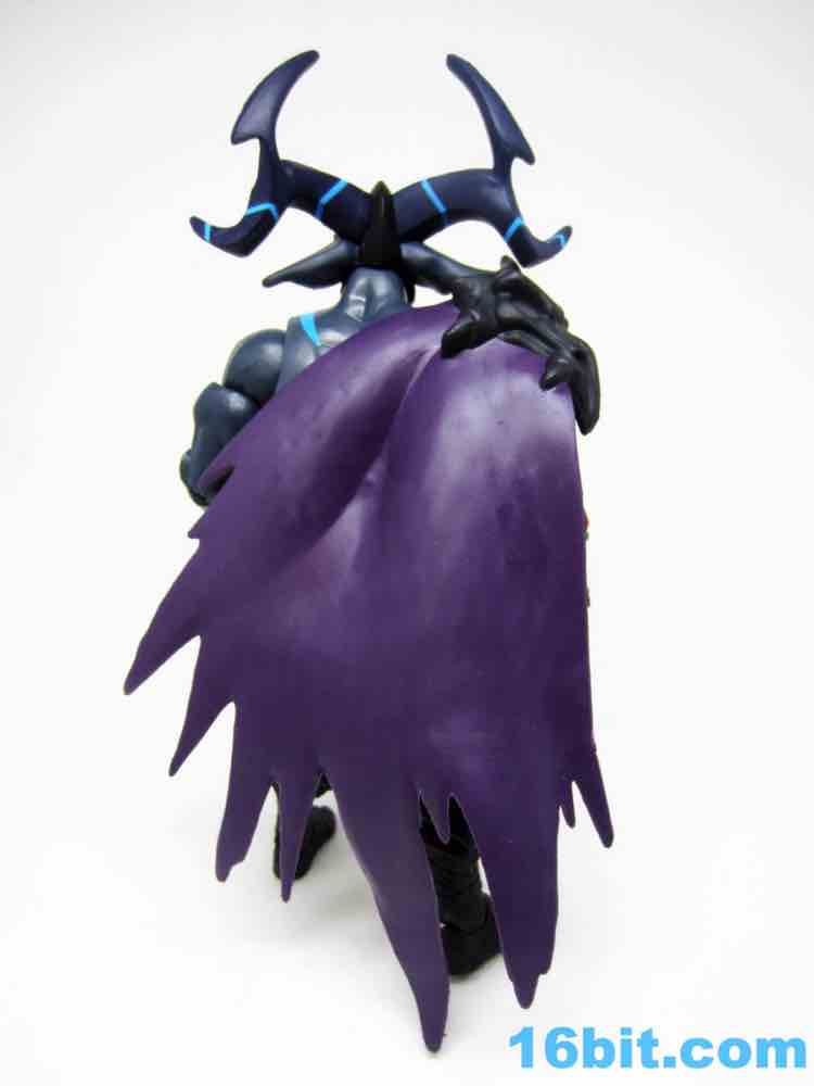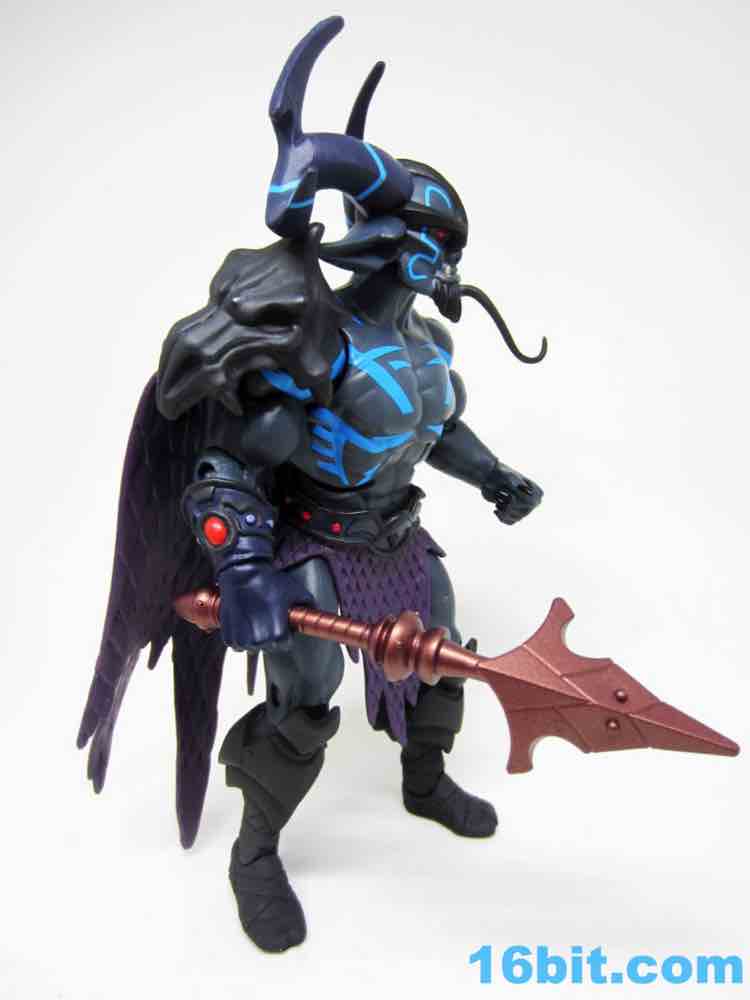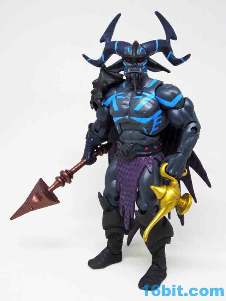 The dark grey buck has some blue markings, a new loincloth, new boots, and a new cape that's installed in a retooled right shoulder. it's quite a nice fit. The head is huge, covered in horns and numerous pointy bits. Between the color, fangs, and pointy ears, he looks significantly different than anything else on my Matty shelves.