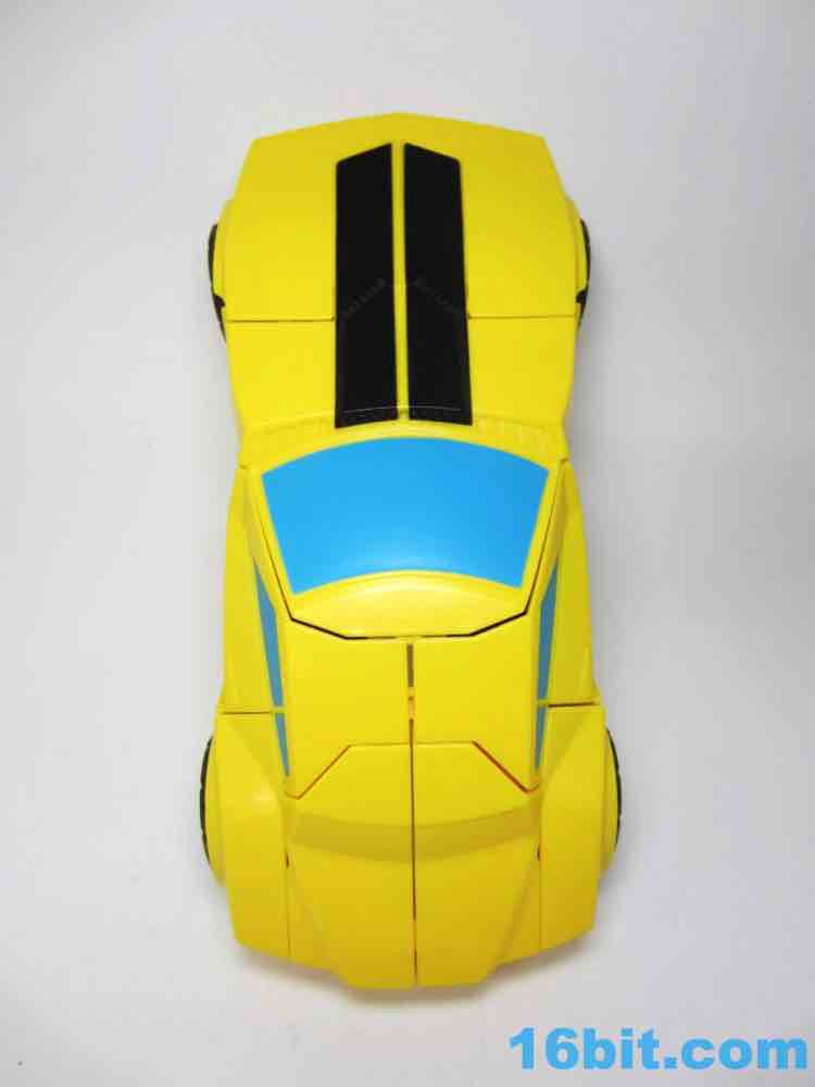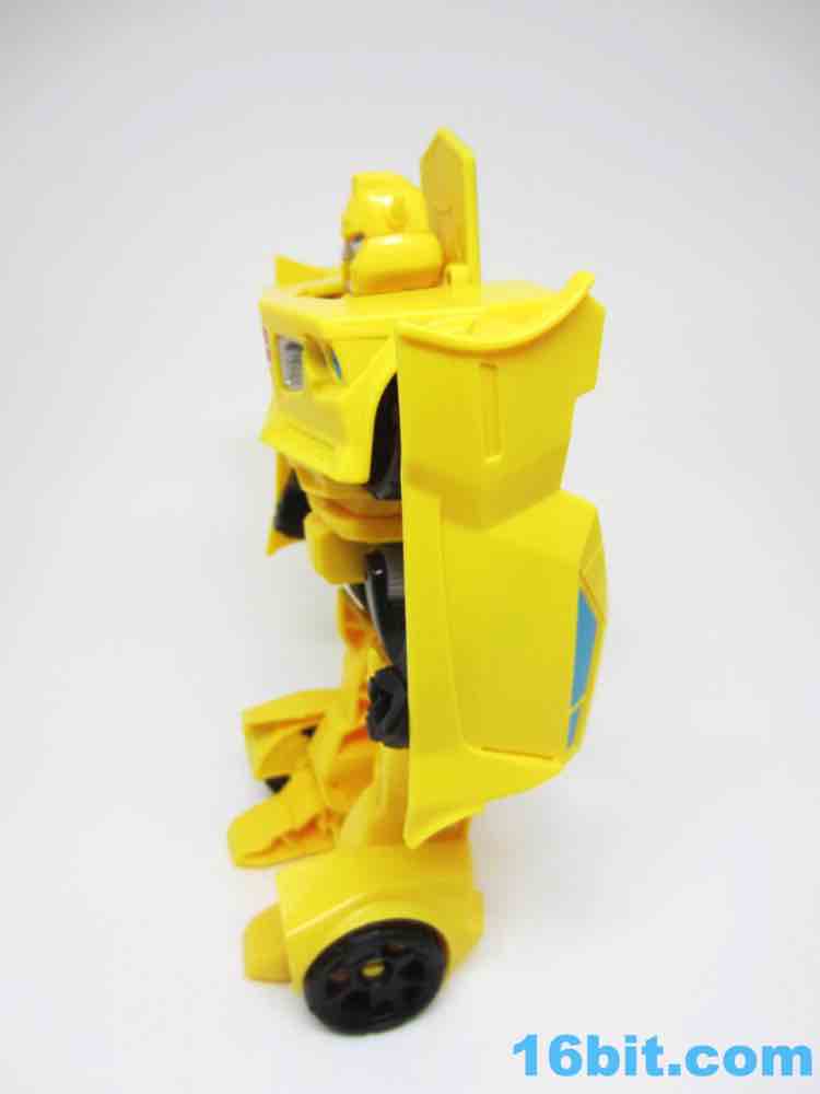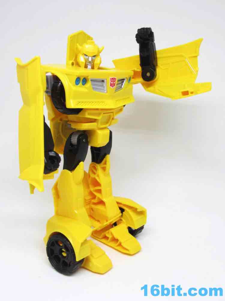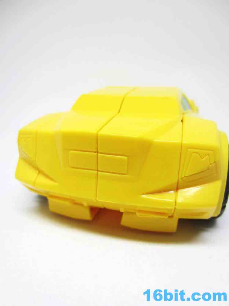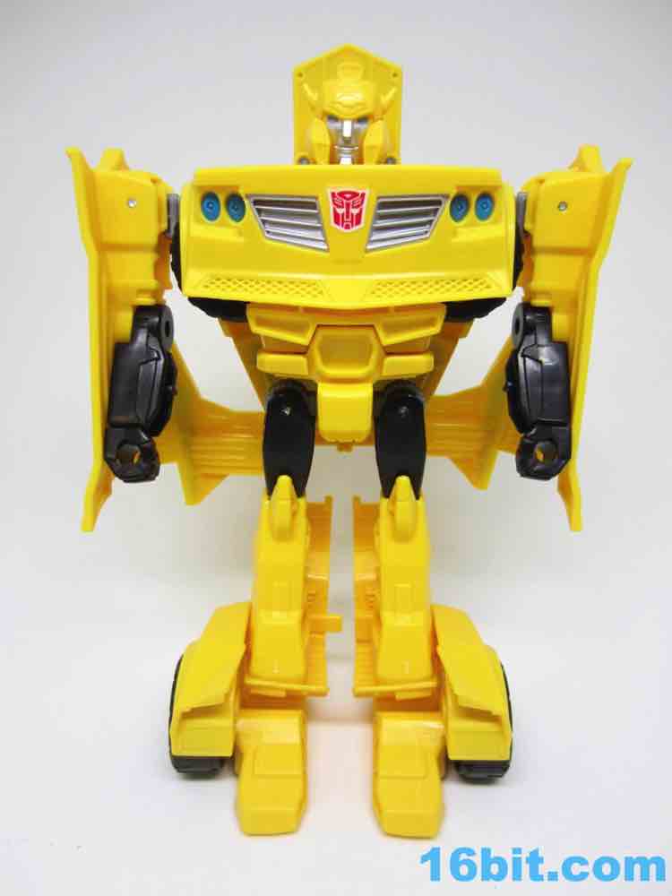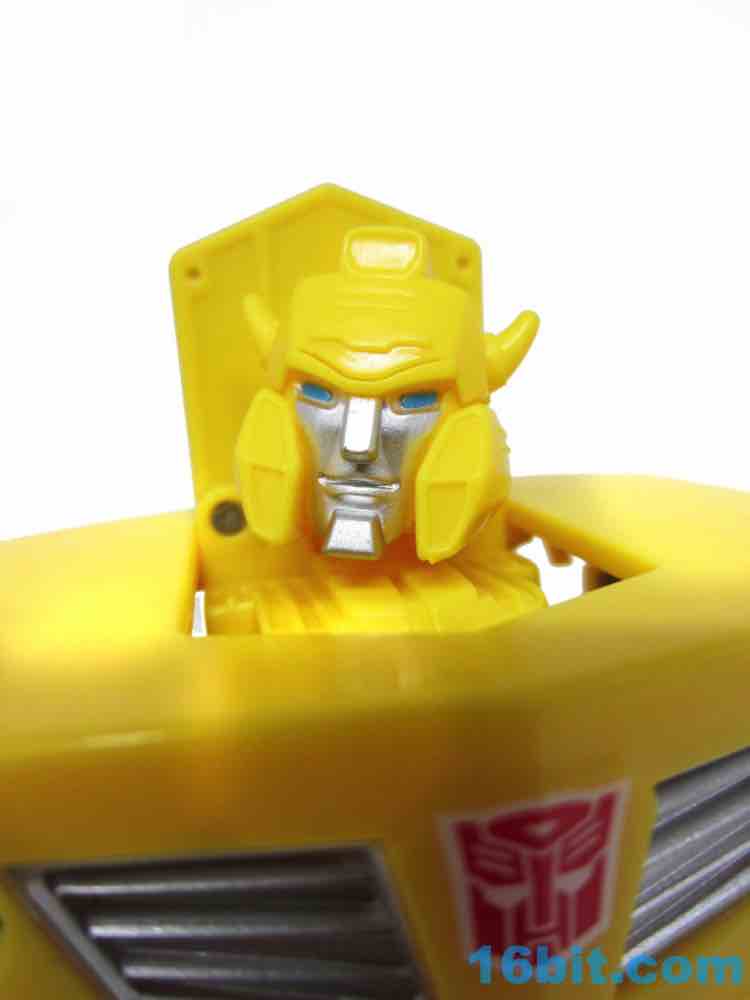 As a roughly 7-inch tall robot, Bumblebee comes boxed in his Cybertronian form and has no weapons. For all intents and purposes, this is a toy that looks like someone at Hasbro tasked their design teams to come up with a big, cheap transforming toy not unlike the Titan Hero Series 12-inch figures. Those are the ones derisively referred to by collectors as "shampoo bottles" and have been quite a hit with kids - and this toy is about as good as those. Bumblebee has universal hip joints as well as shoulders, plus bending elbows. The neck turns, but there are no knees. Ankles come courtesy of the fact they need to move for transformation, and the figure seems to stand around just fine. The 5mm fists can fit various Mini-Cons or BMOGs or whatever, with the toy offering little extraneous detailing. You've got an Autobot ornament on his chest, blue headlights, and a silver grille - most of the figure is just his plastic colors. Bee's head is a little skinnier and snarkier than other incarnations, leaving fans with a more (for lack of a better word) edgy take on the typically cute character. Granted his blue painted eyes and silver face are still pretty adorable. You even get the horns!