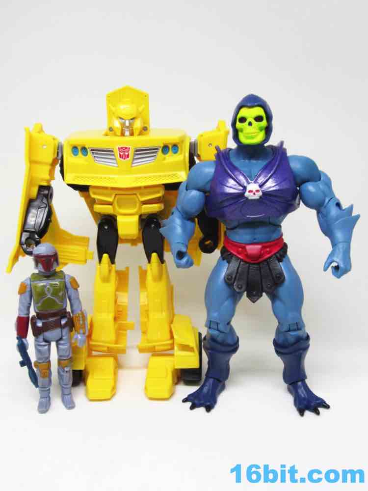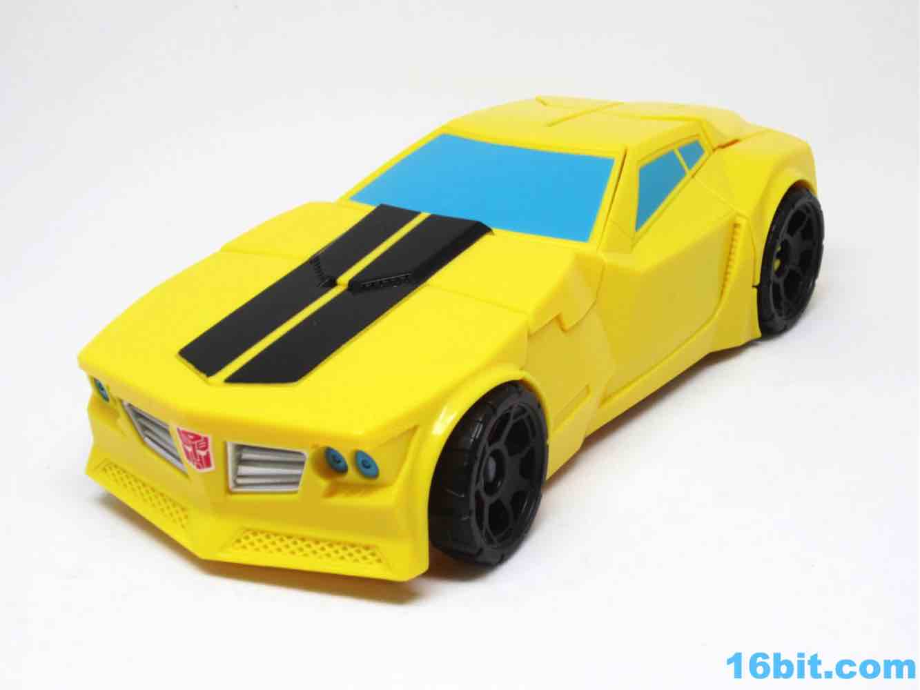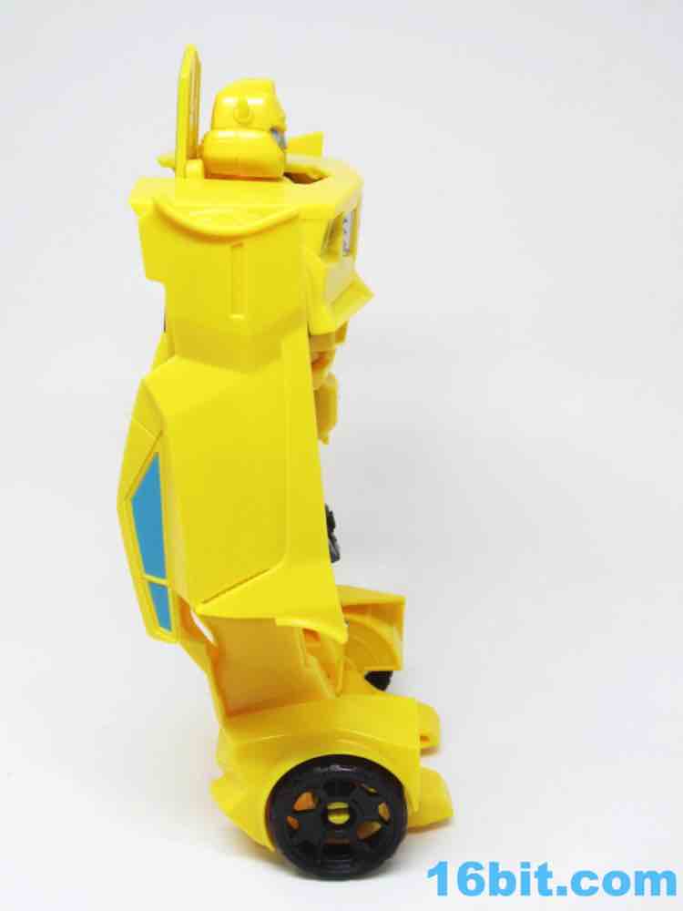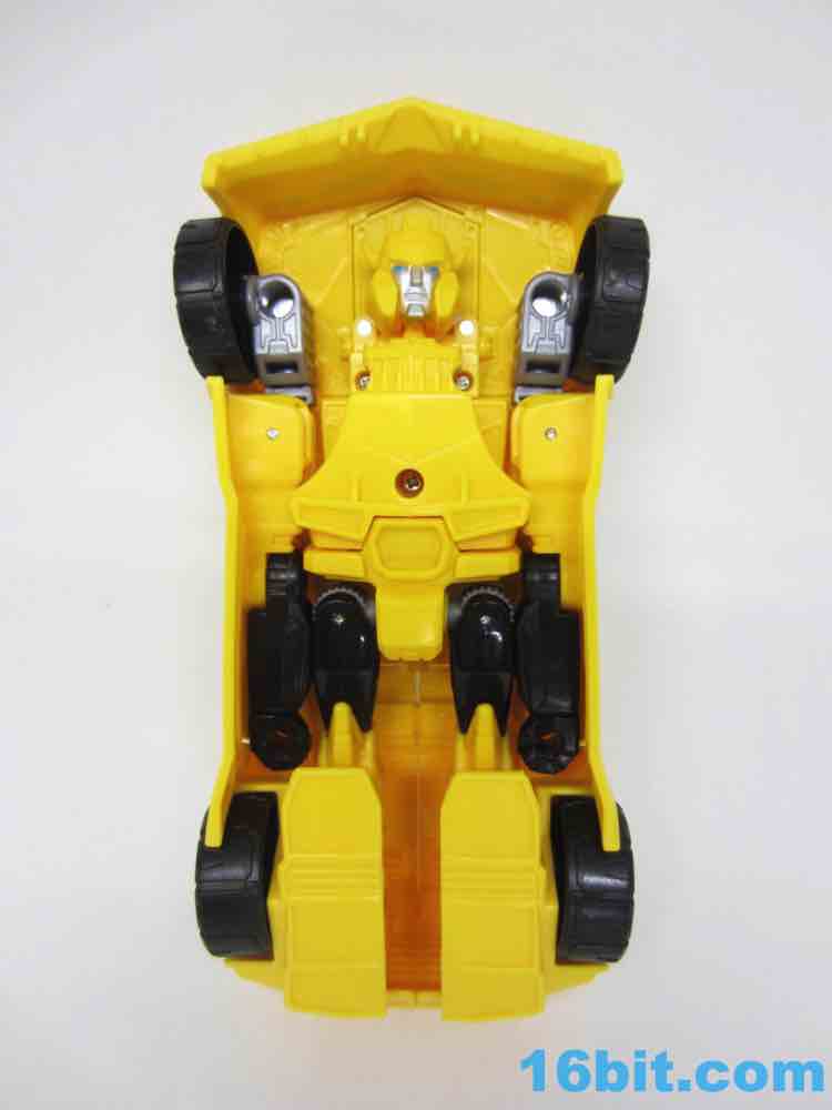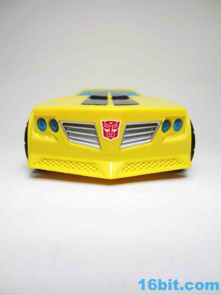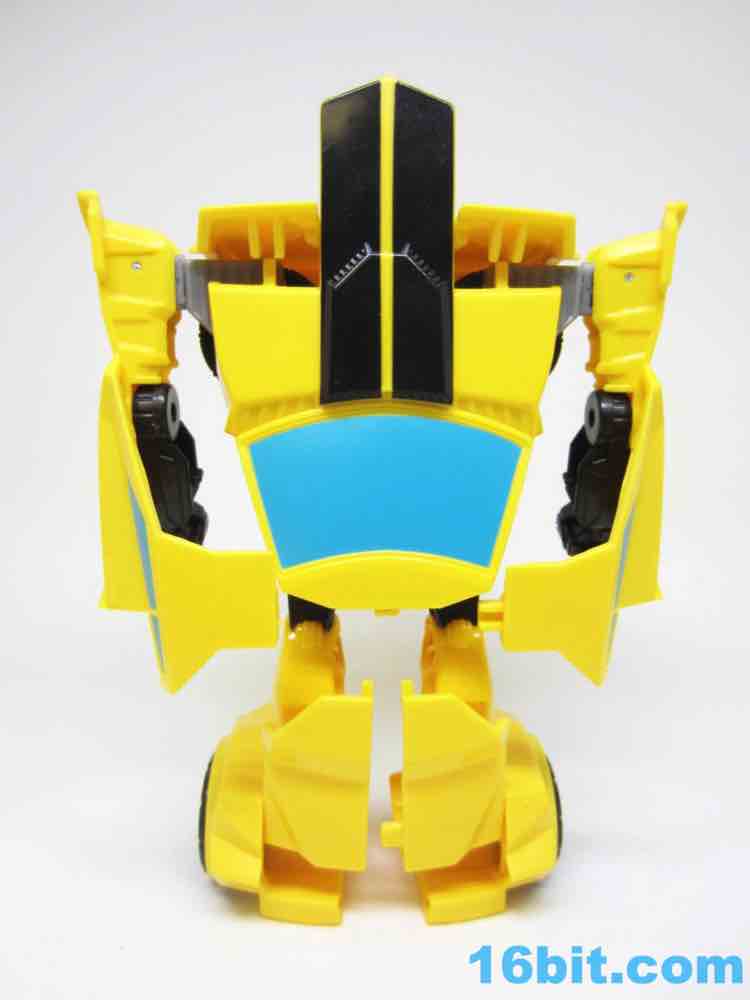 As a roughly 7-inch tall robot, Bumblebee comes boxed in his Cybertronian form and has no weapons. For all intents and purposes, this is a toy that looks like someone at Hasbro tasked their design teams to come up with a big, cheap transforming toy not unlike the Titan Hero Series 12-inch figures. Those are the ones derisively referred to by collectors as "shampoo bottles" and have been quite a hit with kids - and this toy is about as good as those. Bumblebee has universal hip joints as well as shoulders, plus bending elbows. The neck turns, but there are no knees. Ankles come courtesy of the fact they need to move for transformation, and the figure seems to stand around just fine. The 5mm fists can fit various Mini-Cons or BMOGs or whatever, with the toy offering little extraneous detailing. You've got an Autobot ornament on his chest, blue headlights, and a silver grille - most of the figure is just his plastic colors. Bee's head is a little skinnier and snarkier than other incarnations, leaving fans with a more (for lack of a better word) edgy take on the typically cute character. Granted his blue painted eyes and silver face are still pretty adorable. You even get the horns!