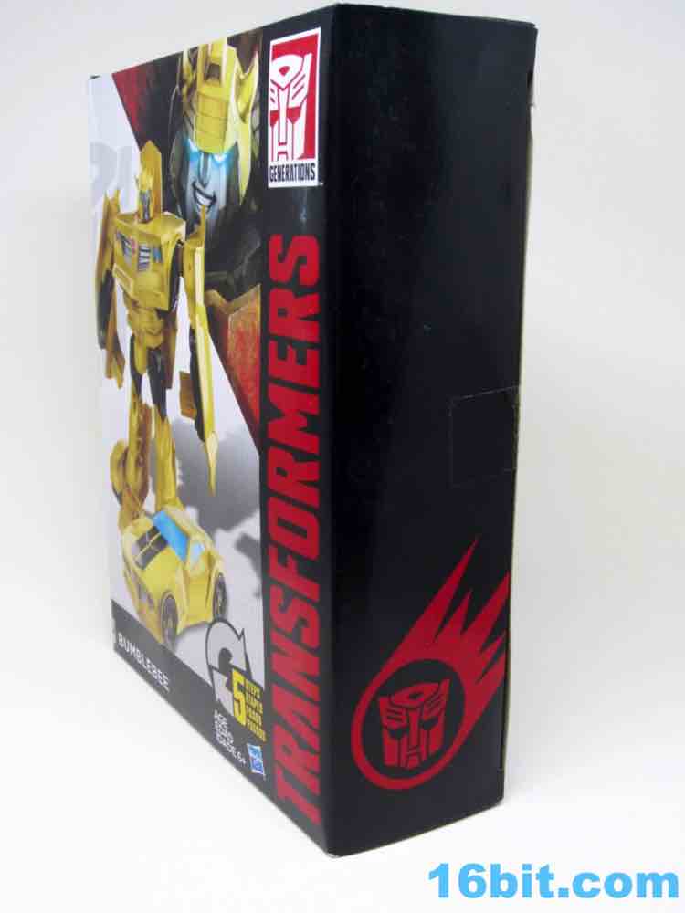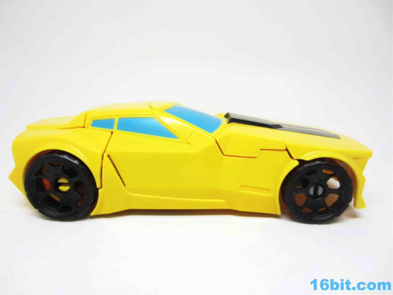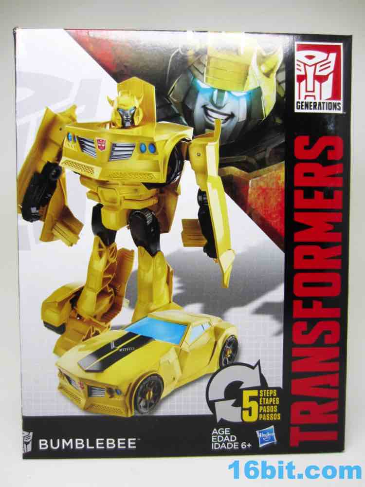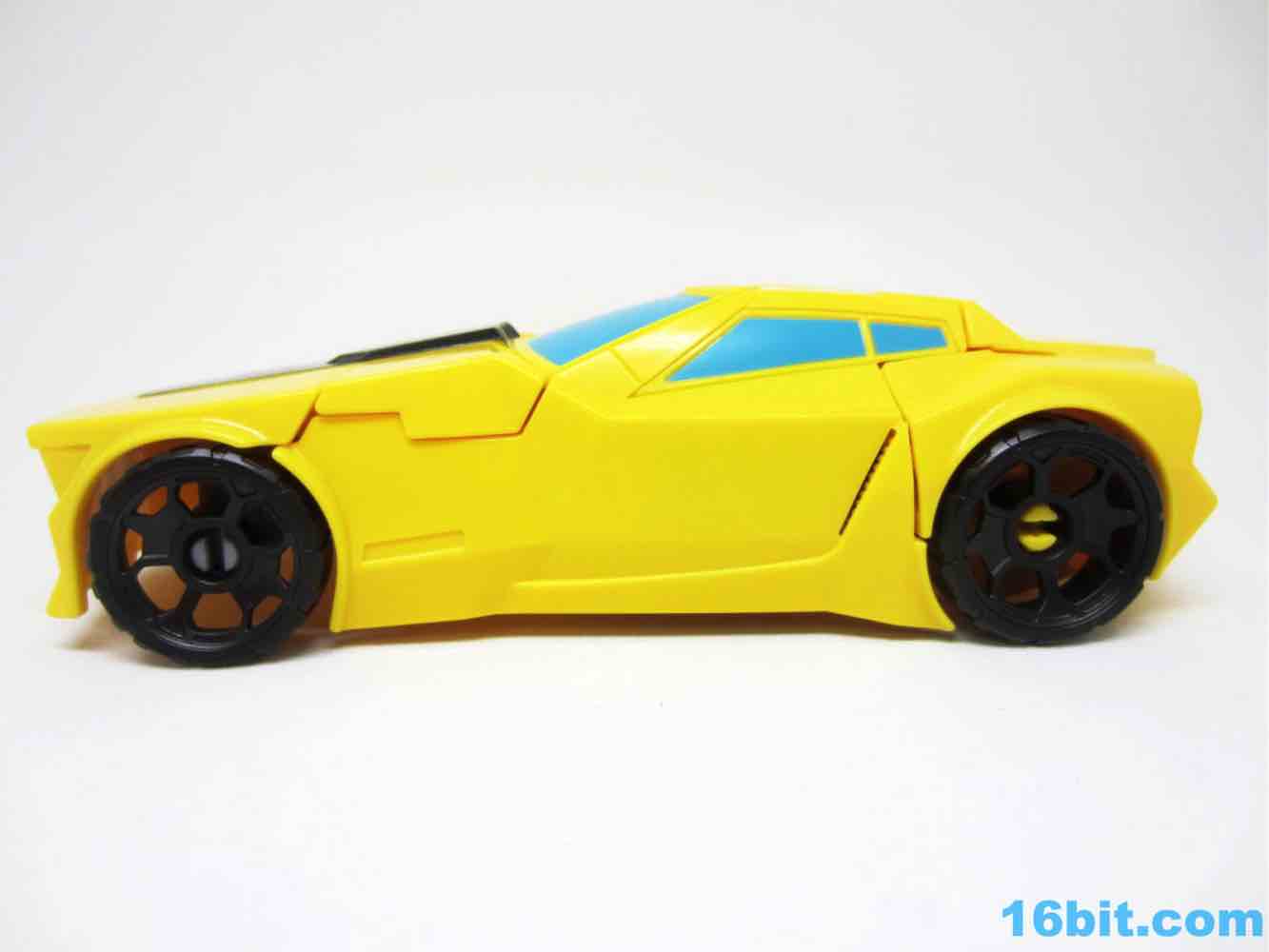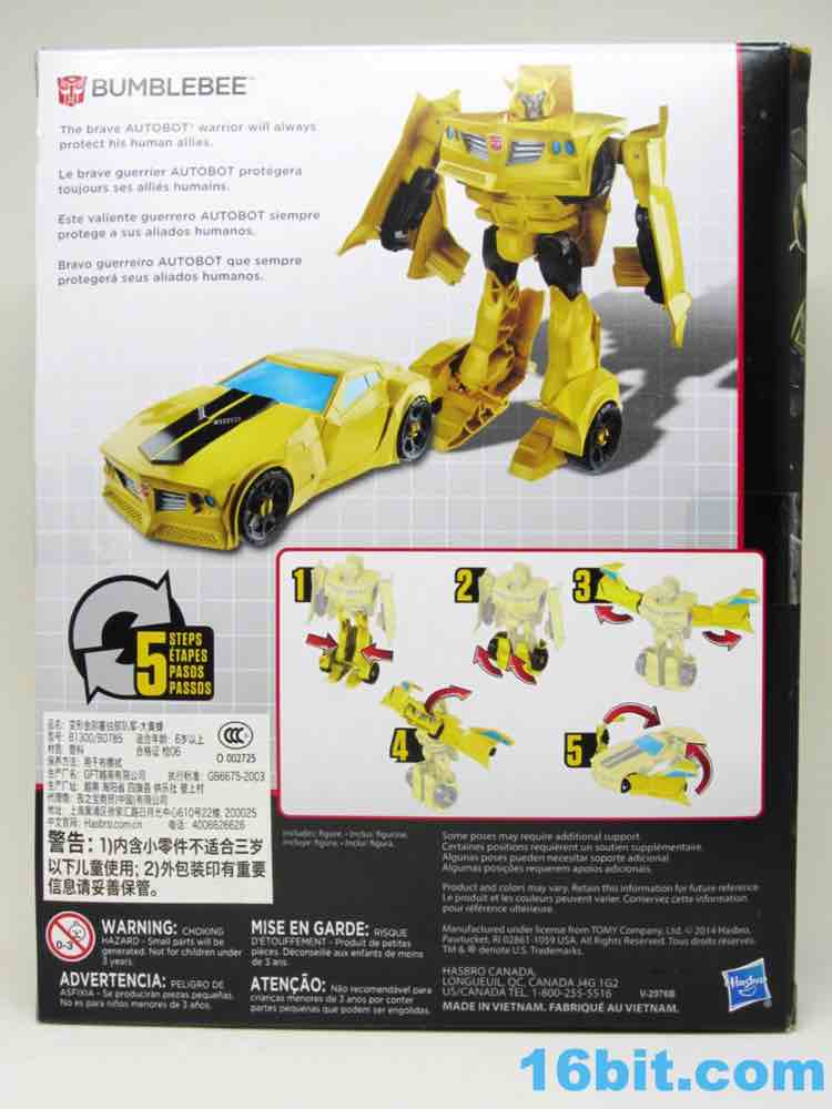 As a roughly 7-inch tall robot, Bumblebee comes boxed in his Cybertronian form and has no weapons. For all intents and purposes, this is a toy that looks like someone at Hasbro tasked their design teams to come up with a big, cheap transforming toy not unlike the Titan Hero Series 12-inch figures. Those are the ones derisively referred to by collectors as "shampoo bottles" and have been quite a hit with kids - and this toy is about as good as those. Bumblebee has universal hip joints as well as shoulders, plus bending elbows. The neck turns, but there are no knees. Ankles come courtesy of the fact they need to move for transformation, and the figure seems to stand around just fine. The 5mm fists can fit various Mini-Cons or BMOGs or whatever, with the toy offering little extraneous detailing. You've got an Autobot ornament on his chest, blue headlights, and a silver grille - most of the figure is just his plastic colors. Bee's head is a little skinnier and snarkier than other incarnations, leaving fans with a more (for lack of a better word) edgy take on the typically cute character. Granted his blue painted eyes and silver face are still pretty adorable. You even get the horns!