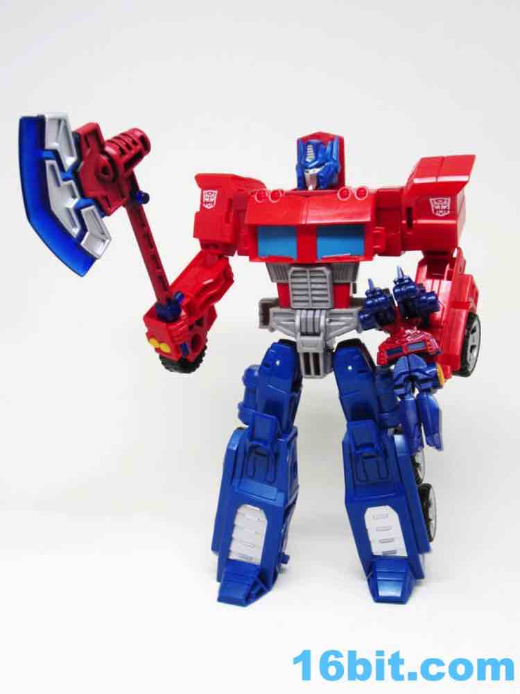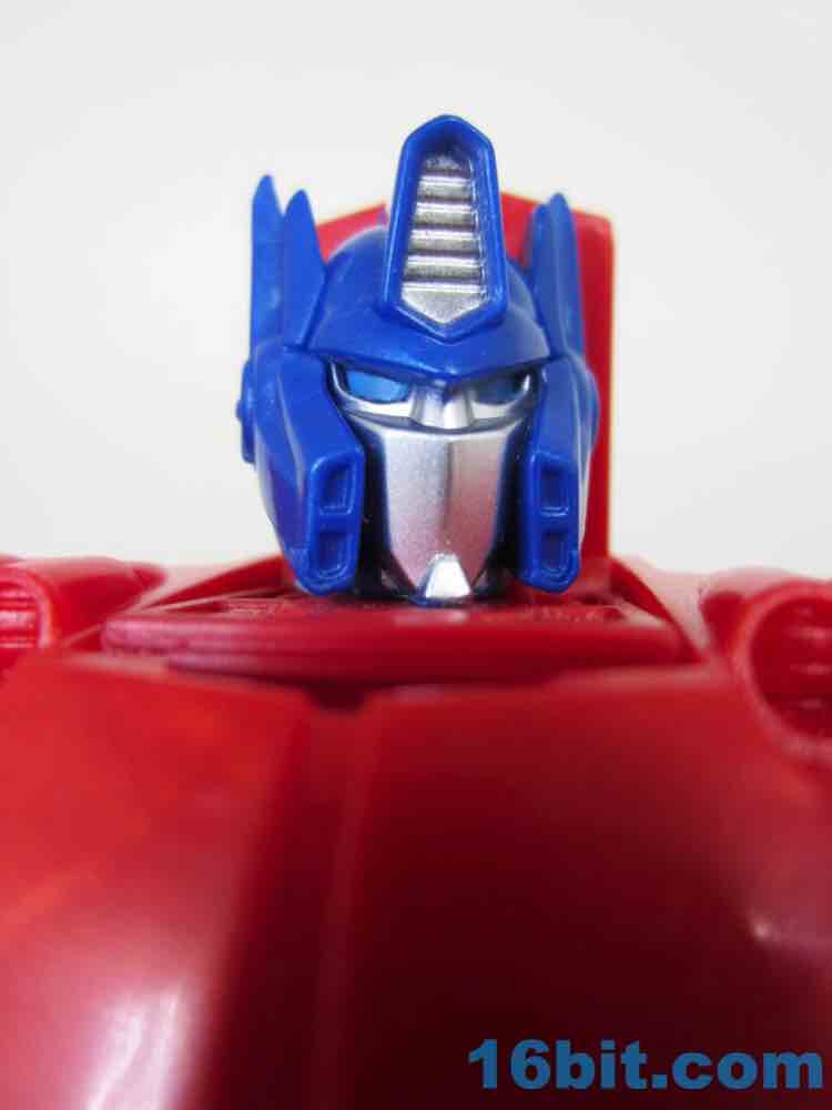 I'm really loving this toy - but remember, it's a toy. It's not a Masterpiece Edition collectible, so you'll note it's missing some of the niceties you've seen on other toys like yellow spatula crotches or blue fists. Optimus has unpainted red hands and the various shades of red plastic don't exactly match - the area under Prime's head and in between his arms and body are actually a little darker. It doesn't bother me a great deal, but it's obvious that the goal of this toy was not to produce the most attractive robot ever made. There are no smokestacks, there isn't much paint, but there is a wonderful head sculpt with a great little "beard" at the bottom and bright blue painted eyes. Just by looking at this figure you can see influences from a number of character models, all of which could probably come across more clearly if Hasbro added some more paint to this figure. Heck, a customizer could probably do a good job with it if they were more widely available and as cheap as Hasbro intended for them to be. As it is, it's just a fun toy - there are no knee joints, but for those of you with extra accessories you're going to have a good time.