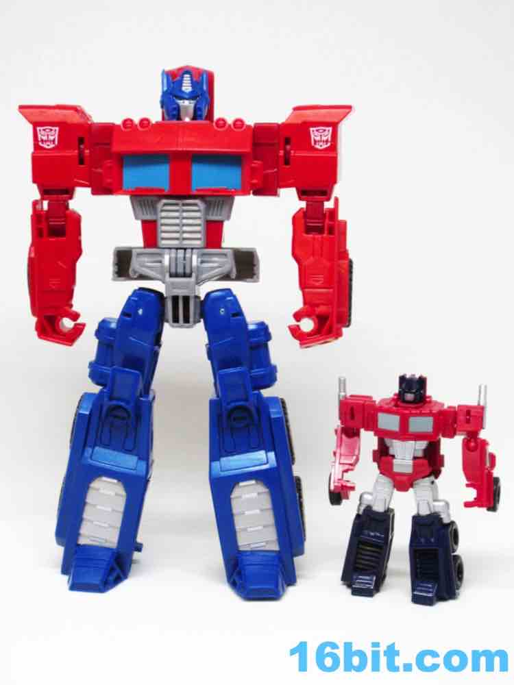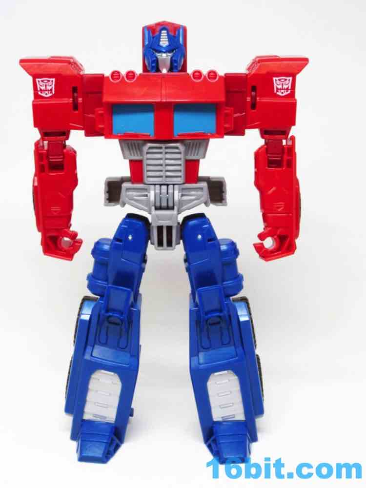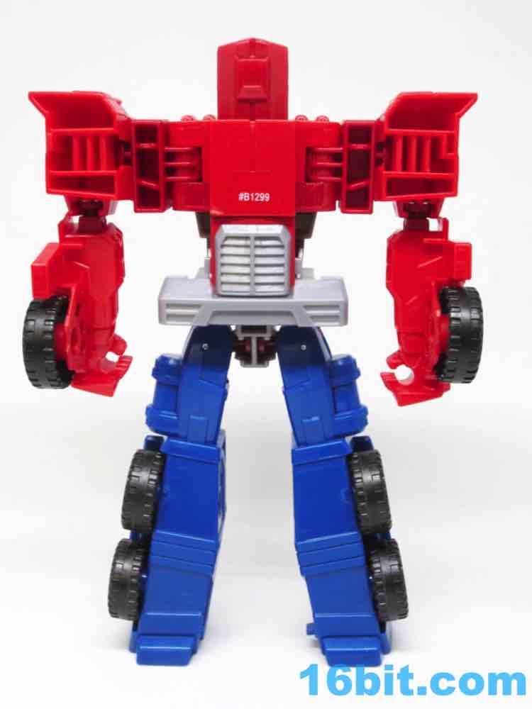 As a 7-inch tall robot, this figure is engineered similarly to Reveal the Shield Optimus Prime [FOTD #324], a tiny $5 Legends-class toy with personality to spare. It was retooled and repackaged a few times, and may even still be at Family Dollar, Big Lots, or Dollar General stores near you as you read this. Both toys have articulated waists, swivel necks, bending elbows, moving hips, and rotating shoulders. This larger Cyber Battalion version requires biceps since the whole ball-jointed elbow thing doesn't quite work when toys get big, so you'll be happy to know it actually has more articulation. He also still has red fists and no gun - you'll need to steal one from another toy.