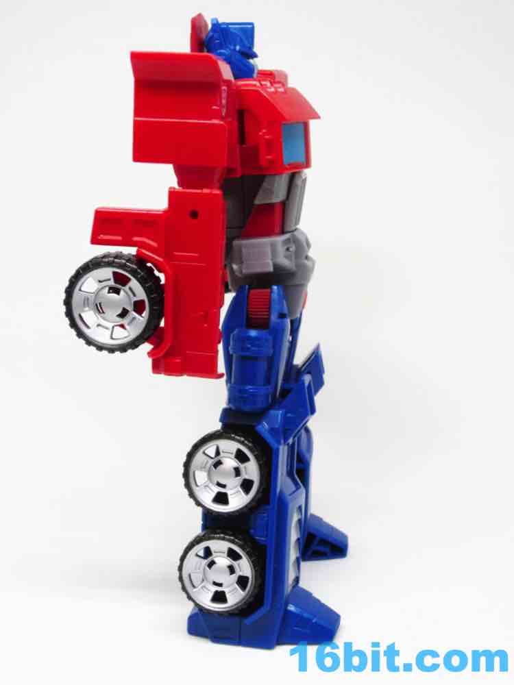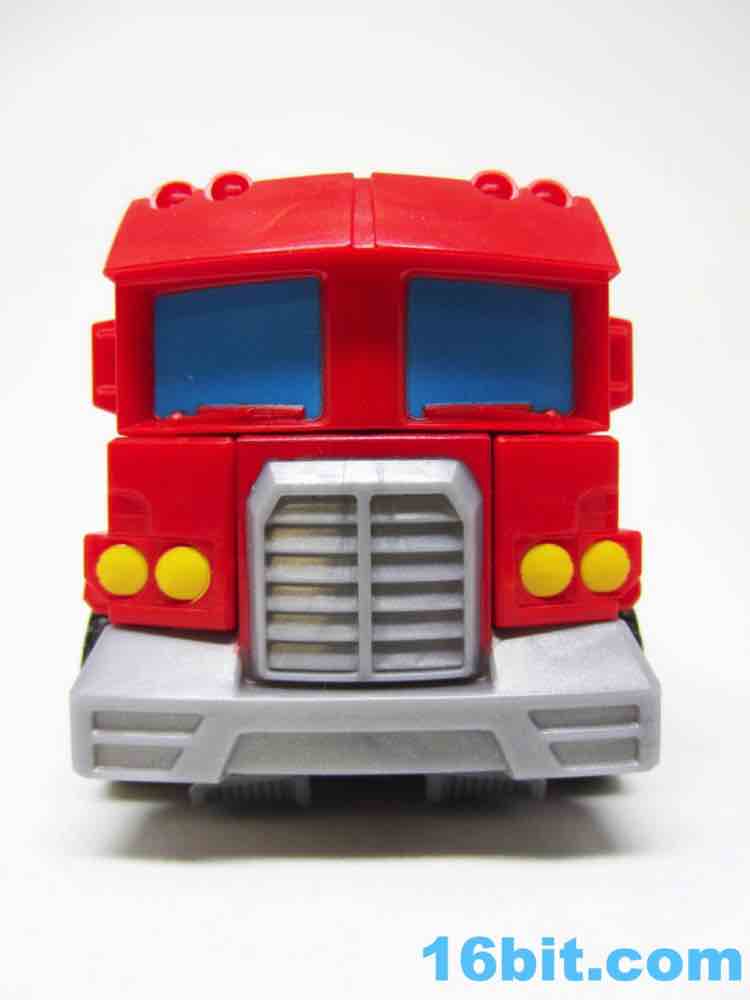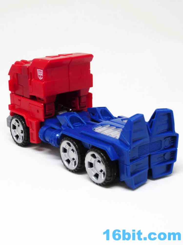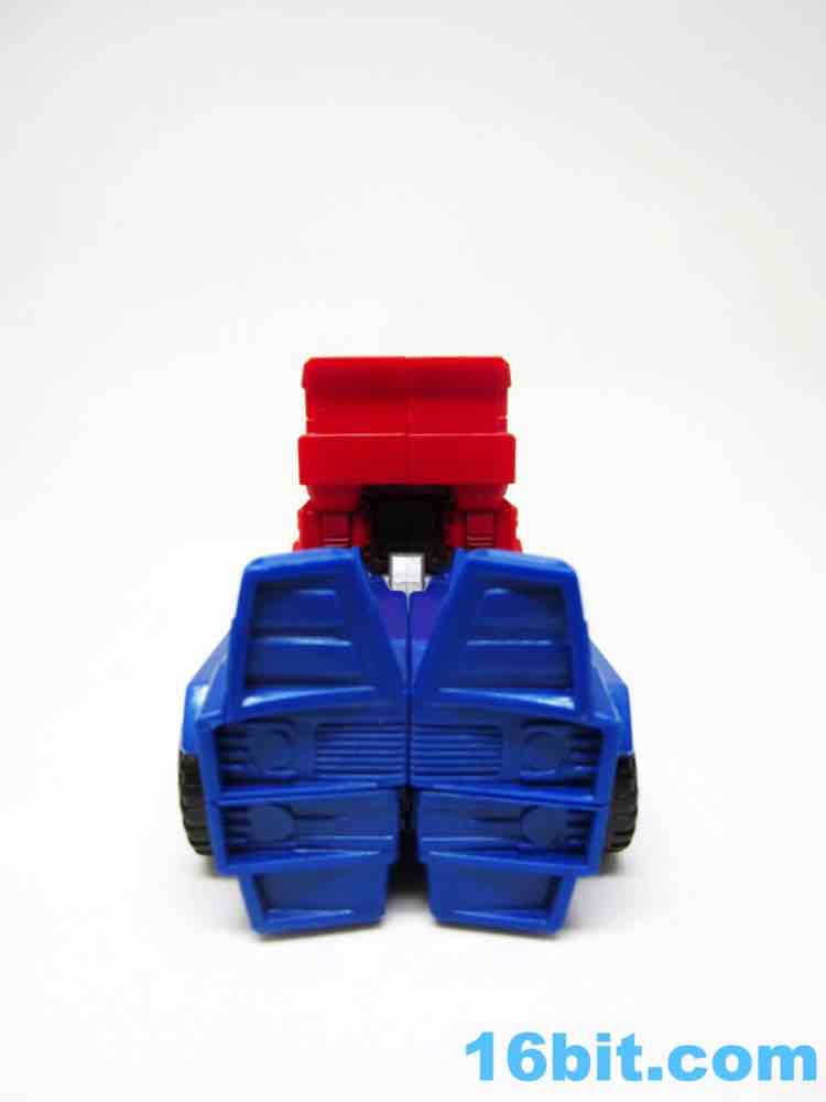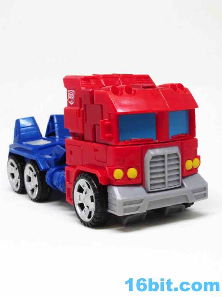 The truck lacks any sort of a hitch for the trailer that doesn't exist, so what you have here is a charming cab with painted blue windows. And yellow headlights. Also silver hubcaps. The truck does look more or less like you would expect, but it's impossible to look at a flat-nose cab Optimus toy and not go "so where's the trailer?" It's a fairly decent looking vehicle, but the "legs" are a little loose on the cab - they can peg in place, but you have to position them just-so and it may not be obvious that the slots and tabs actually exist when you first play with it. I'm not overly fond with how it holds together, but you can also bypass the whole floppy leg truck thing by just picking it up by the blue parts of the vehicle.