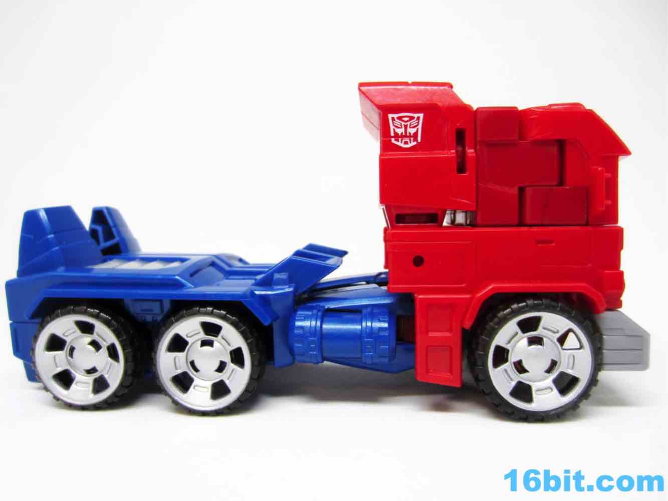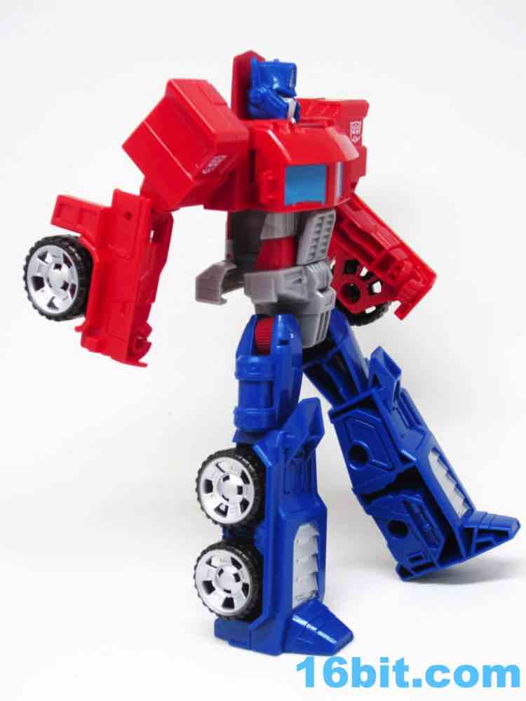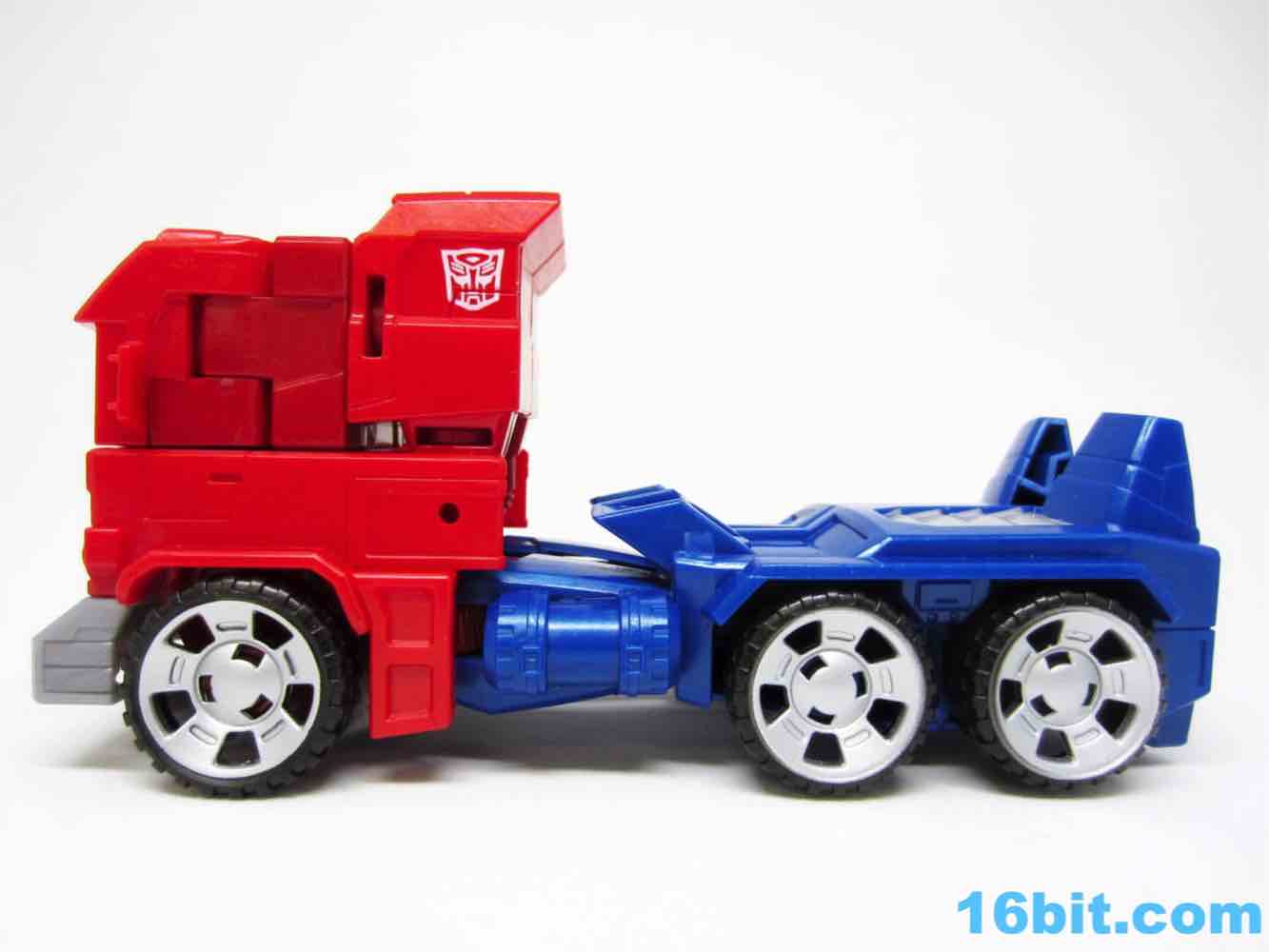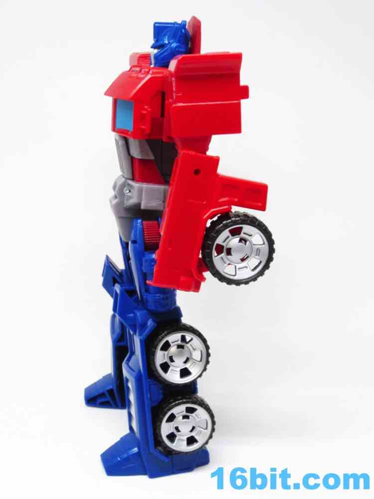 The truck lacks any sort of a hitch for the trailer that doesn't exist, so what you have here is a charming cab with painted blue windows. And yellow headlights. Also silver hubcaps. The truck does look more or less like you would expect, but it's impossible to look at a flat-nose cab Optimus toy and not go "so where's the trailer?" It's a fairly decent looking vehicle, but the "legs" are a little loose on the cab - they can peg in place, but you have to position them just-so and it may not be obvious that the slots and tabs actually exist when you first play with it. I'm not overly fond with how it holds together, but you can also bypass the whole floppy leg truck thing by just picking it up by the blue parts of the vehicle.