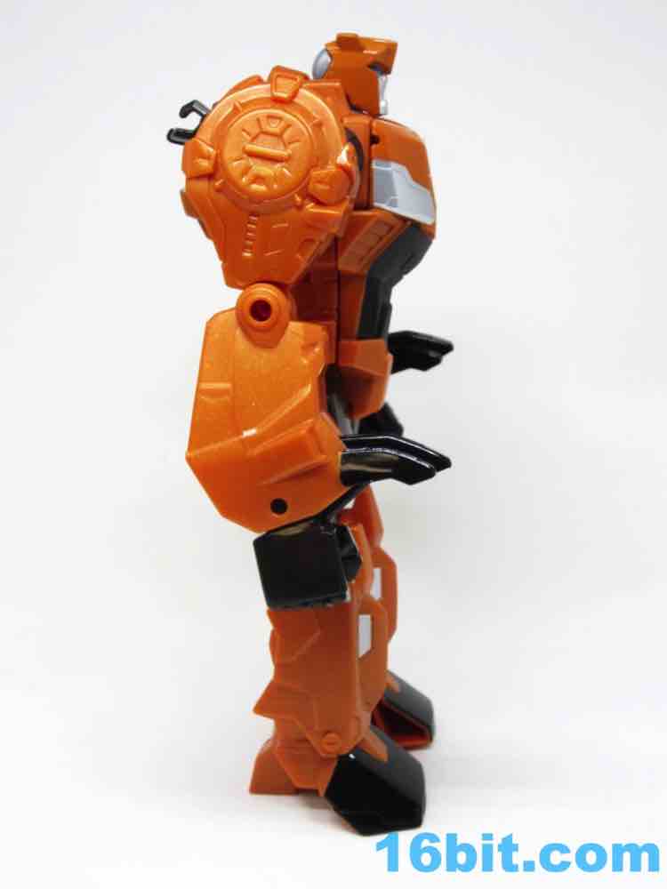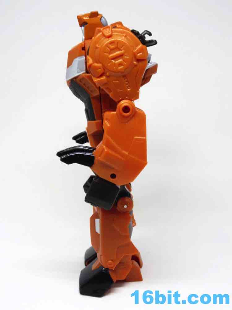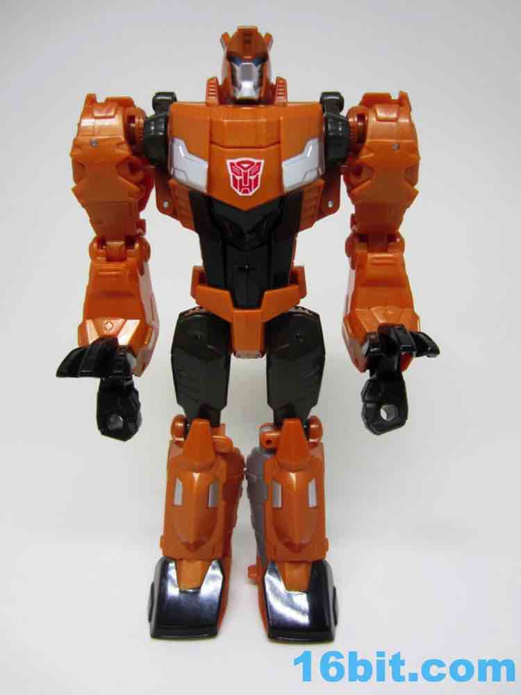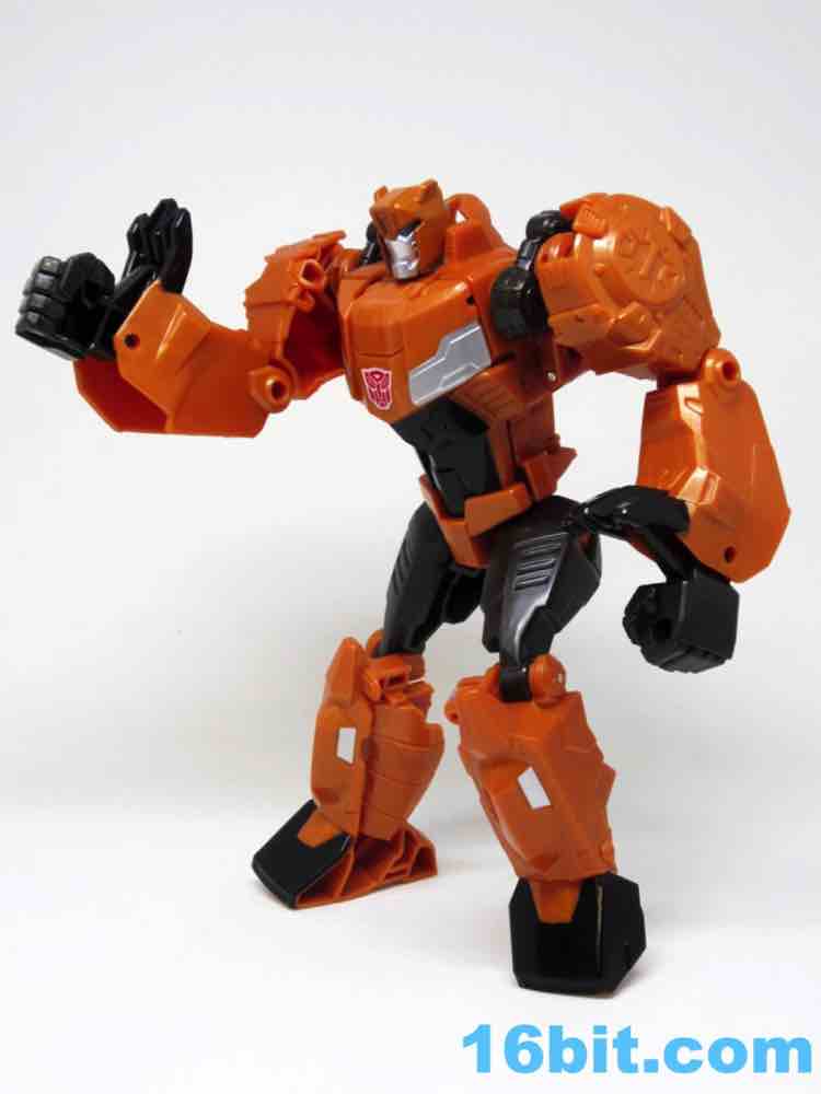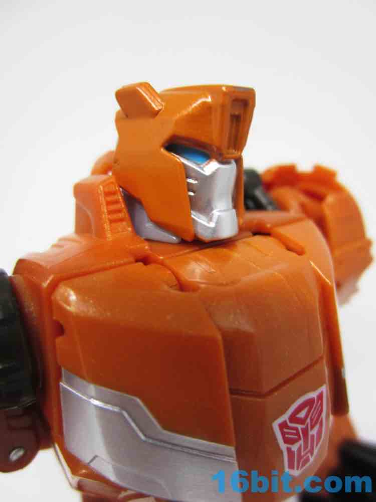 The 7-inch tall robot is one of the better ones in terms of articulation - you get knees, elbows, hips, shoulders, and a neck. The only other figure in this line with knees is Megatron, so if articulation is your barometer of greatness I suppose that this may be your shining gem. He stands nicely and has beefy arms, plus loads of sculpted panels that don't have a lot of paint on them. There's so much orangeish brown here that it does a pretty good job disguising the fact that you could probably paint this toy up in grey and gold and end up with something that would look appropriately vintage. He could use a sword or a gun, but at least he has a decent head with bright blue eyes and a painted helmet. The face mask ain't bad either, it also has a chin. I wouldn't have expected a chin on a face plate.
