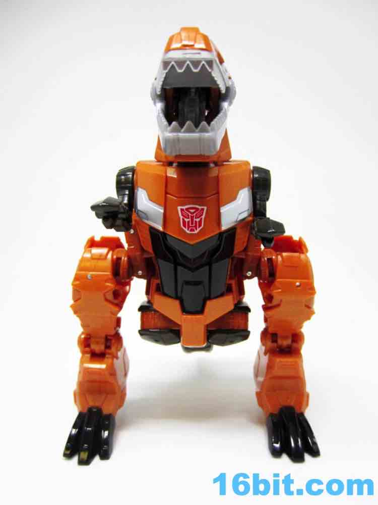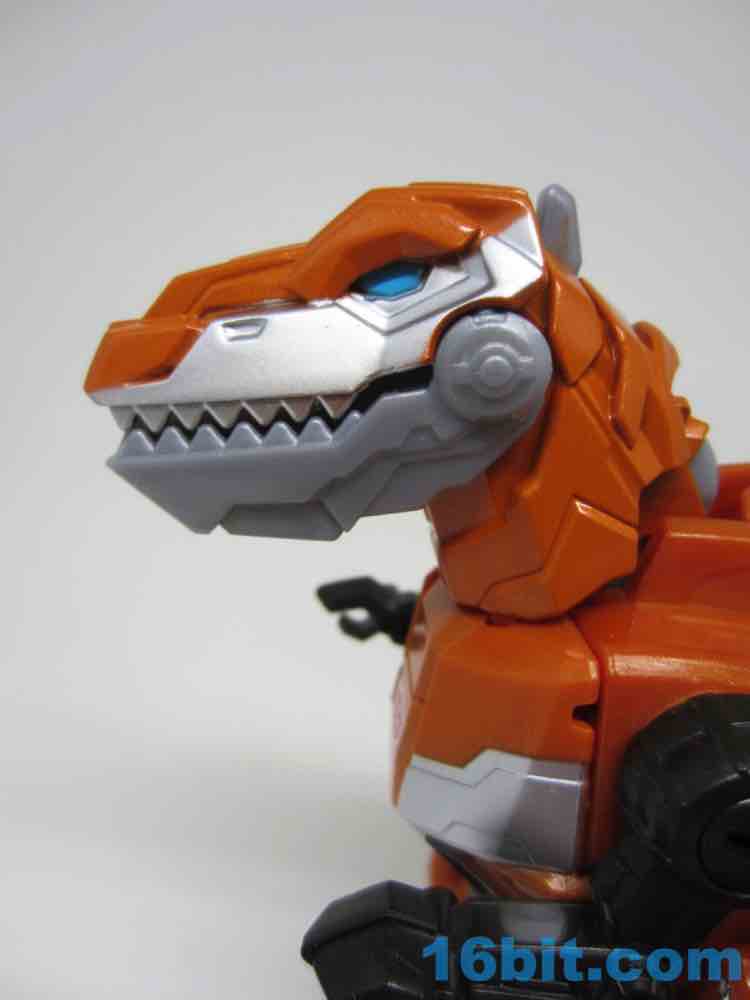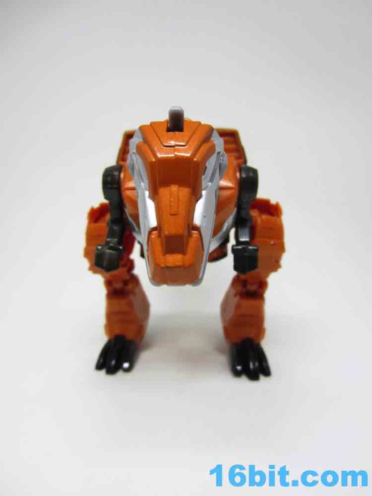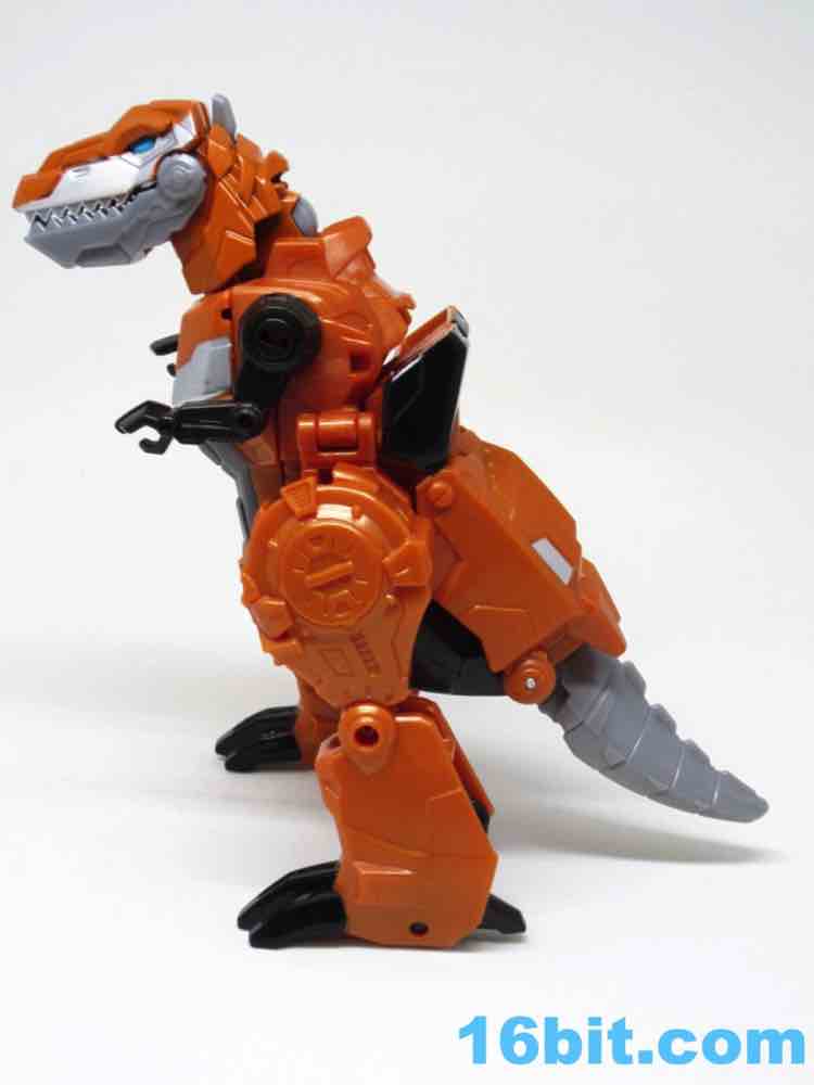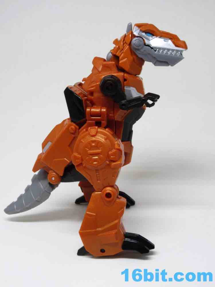 Transformation is based on Robots in Disguise Grimlock - the tail folds out of his leg, the T-Rex head folds out of the chest and over the robot head, the arms become legs, and the legs become a tail. This is easy to do - it's a 6-step toy.