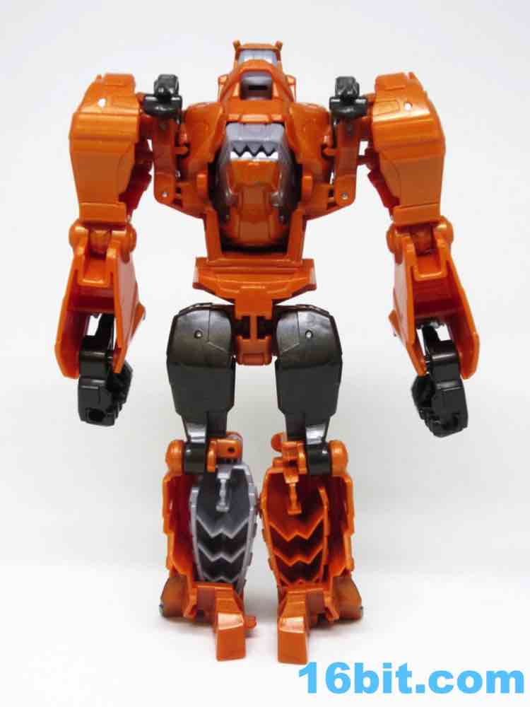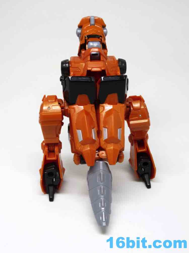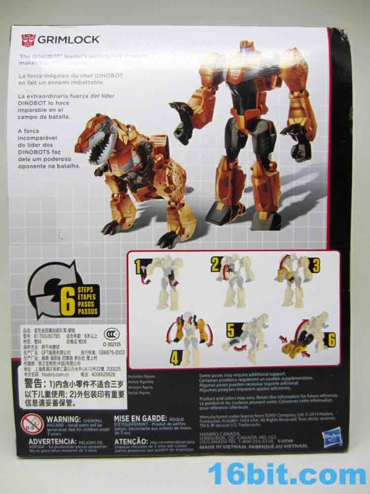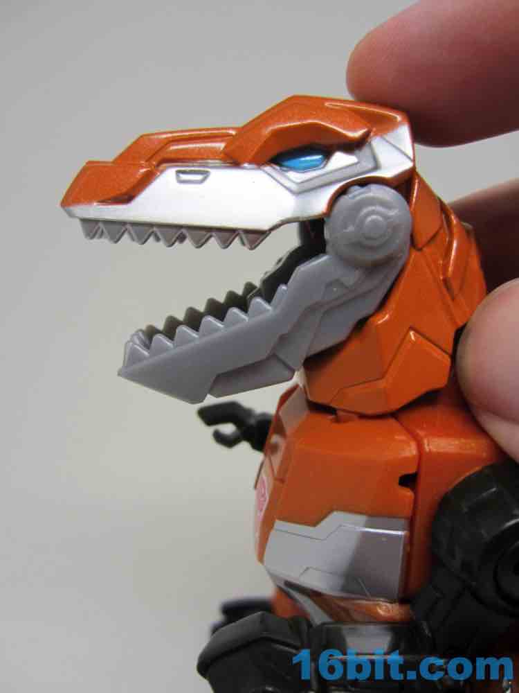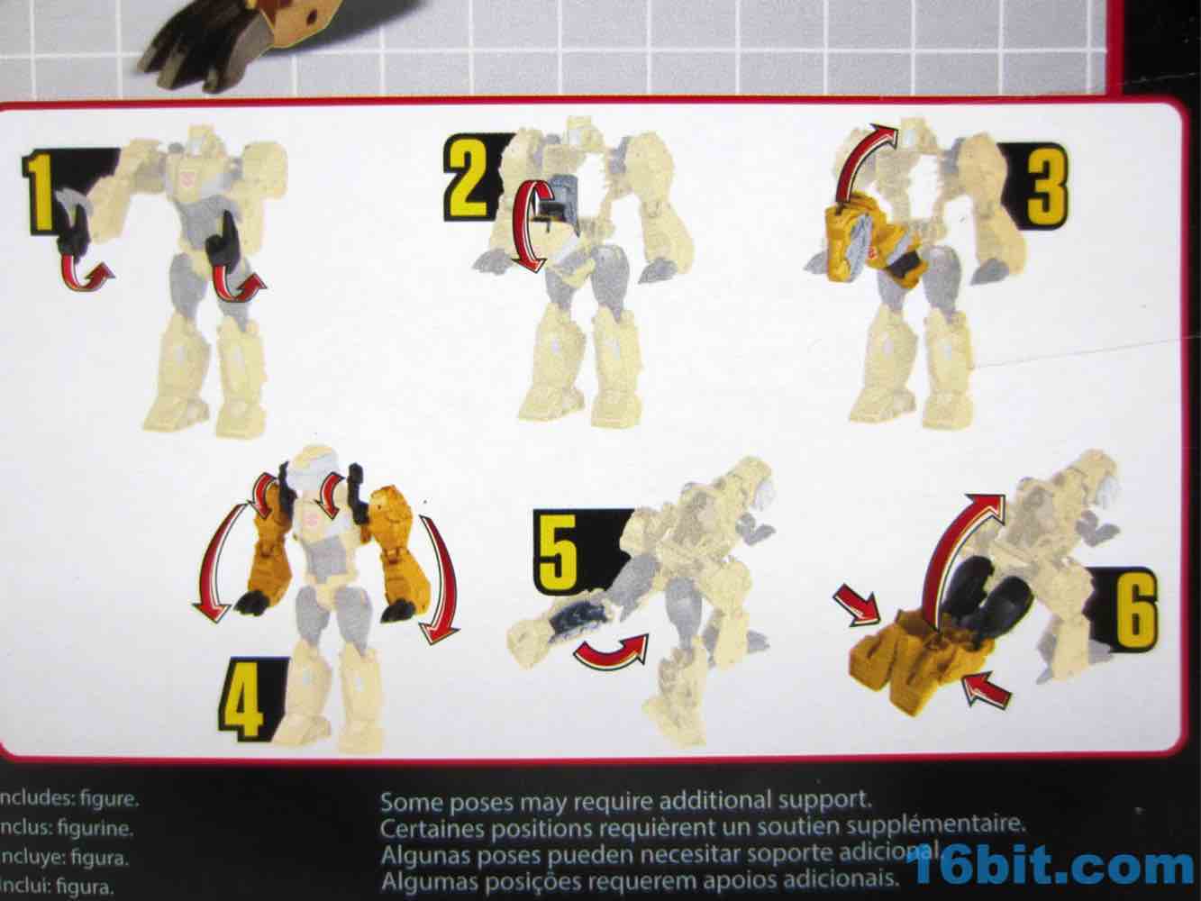 Transformation is based on Robots in Disguise Grimlock - the tail folds out of his leg, the T-Rex head folds out of the chest and over the robot head, the arms become legs, and the legs become a tail. This is easy to do - it's a 6-step toy.