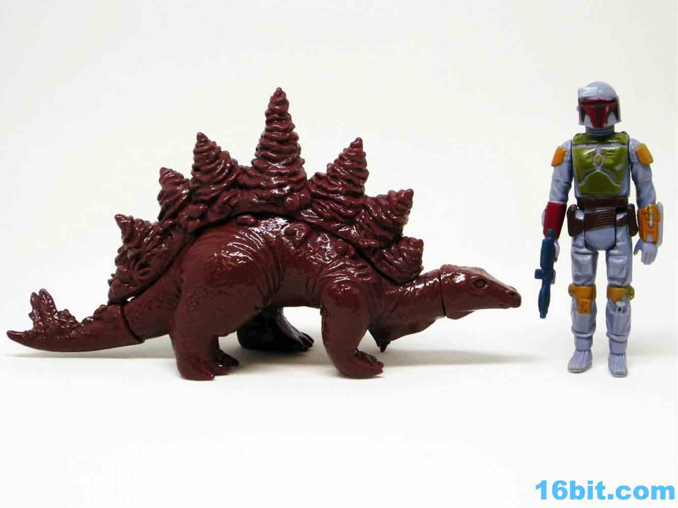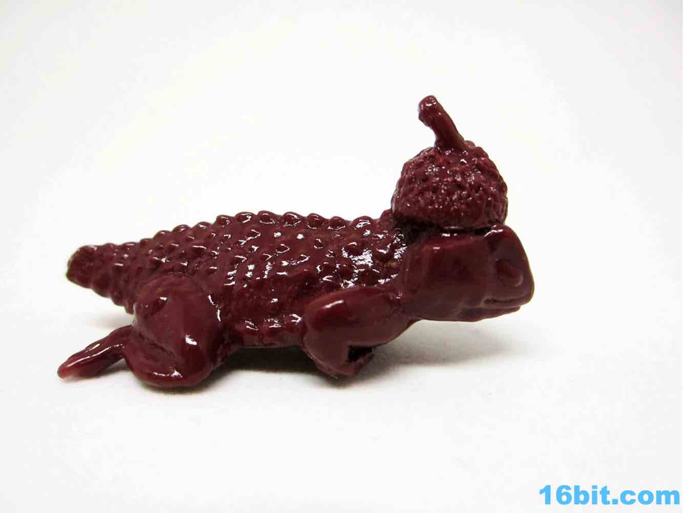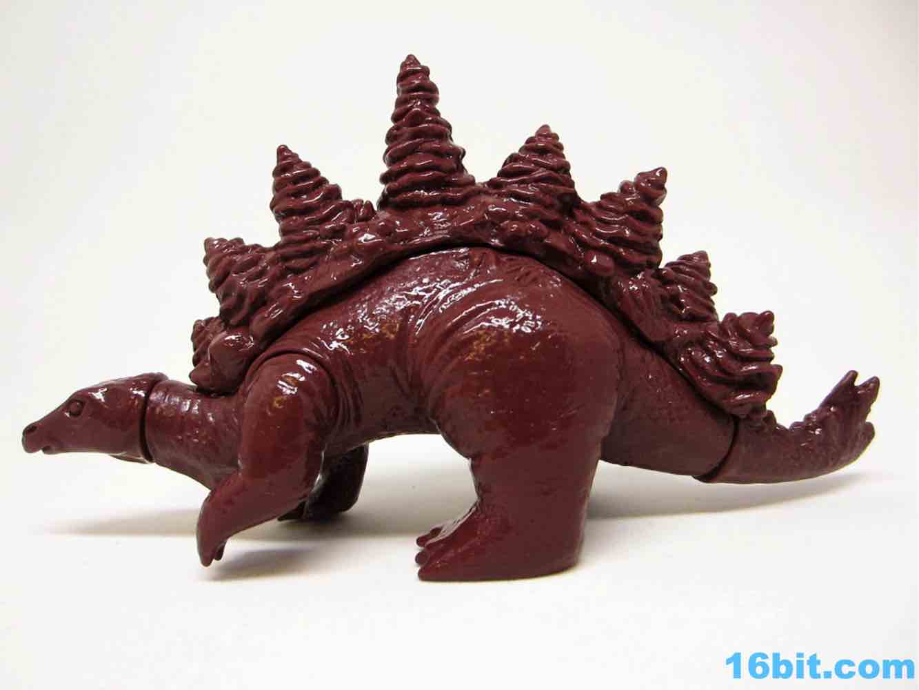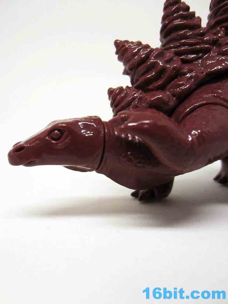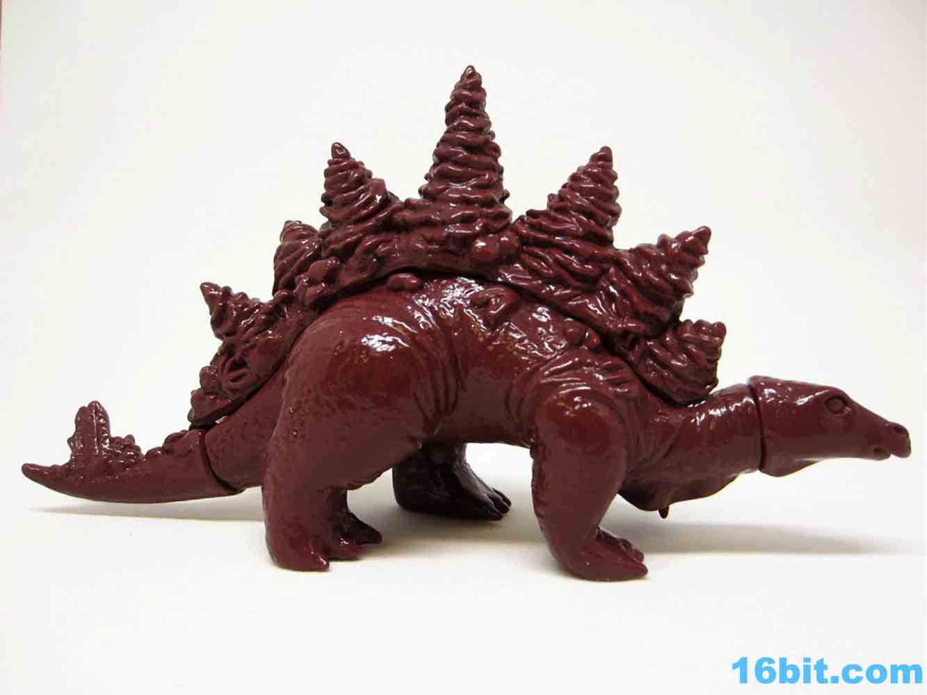The figure is glossy, airy, and shiny. This super glossy little creature looks like it might fit in the toy box of any kid from the 1960s through the 1990s, with its unpainted brown color looking not unlike the Marx dinosaurs my dad had or the more whimsical Playskool dinosaurs we saw in stores and Wendy's kid meals in the late 1980s. That's the really funny thing - those were decently sized hollow rubber dinosaurs, and Stegoforest has less paint, about the same mass, and costs considerably more. One was free with a $3 sack of what can be legally sold as food, and the other is $50. Stegoforest has an articulated left front leg and neck, plus a jointed thagomizer. The forest part is a separate piece glued on, and on my sample it's not quite a perfect fit. I'm not seeing any stray glue or anything, but the parts really don't fit together perfectly. Were this a Wendy's fast food premium this would probably be upsetting, but this was $50, so it's upsetting.