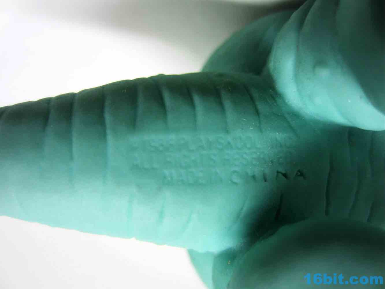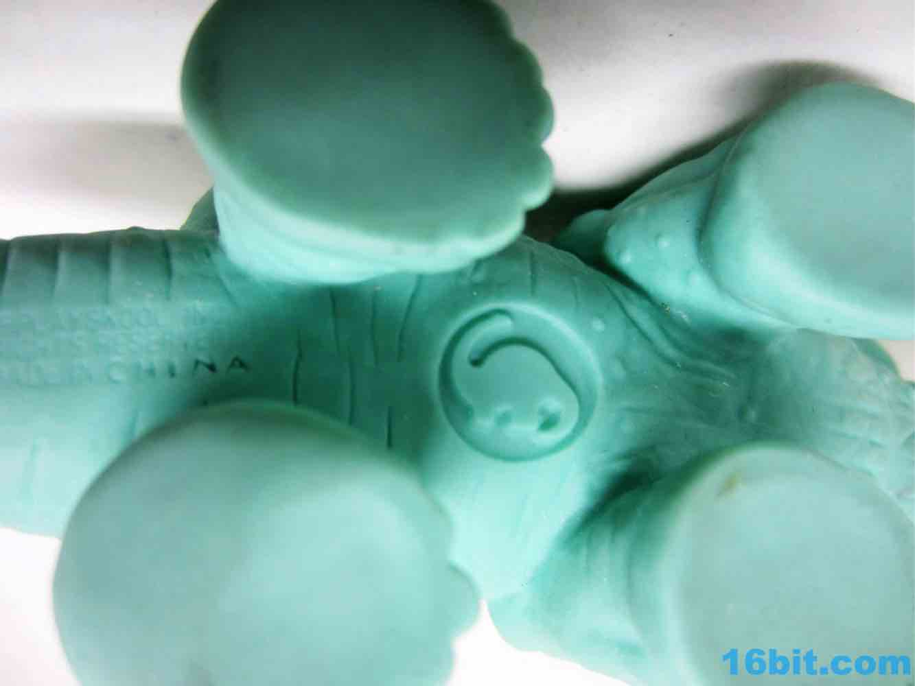 At over 5-inches long, this dinosaur is no slouch. He was big by some of the best standards of a fast food toy. Sure, we've had some big Iron Man figures at Burger King, but there was just one big guy in an otherwise decent line-up. It wasn't like the whole line was amazing, which this pretty much was. A pale green dinosaur had been sprayed with a dark green coat on top, with fully-painted yellow eyes with black markings to bring out some life in them. Only the neck is articulated, and the figure has a little Apatosaurus stamp on his belly - not unlike the "JP" logo which would become ubiquitous from Kenner just a few years later.
