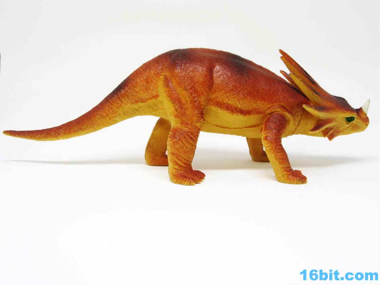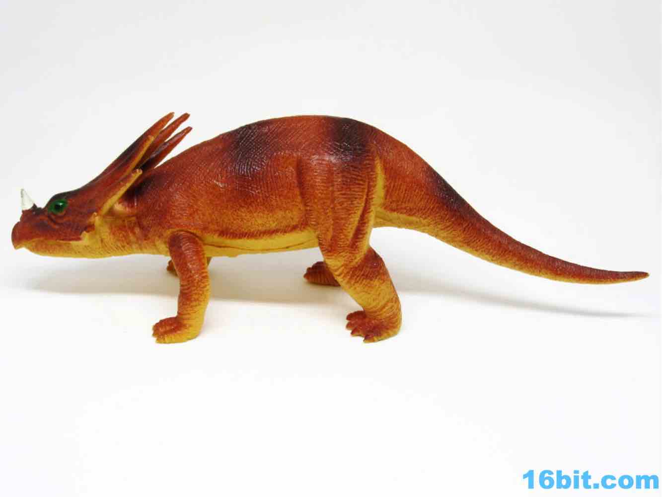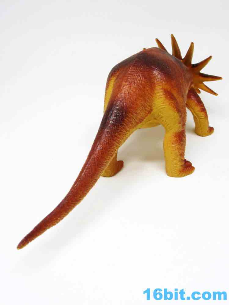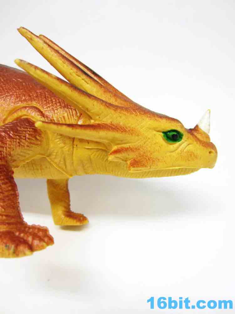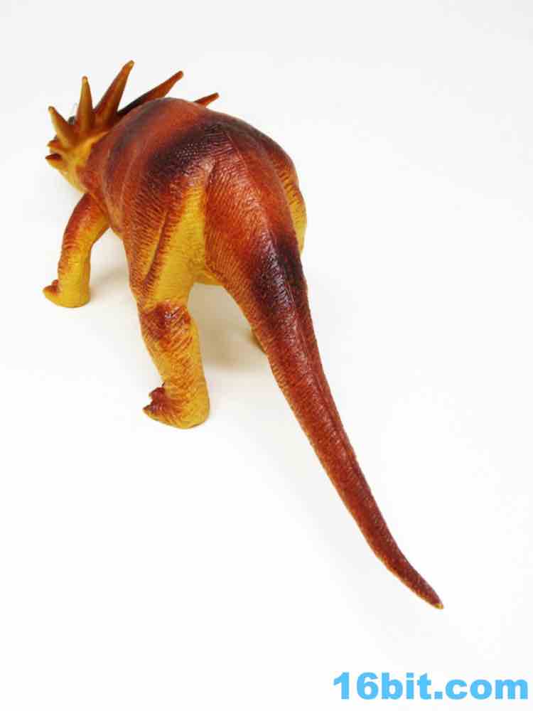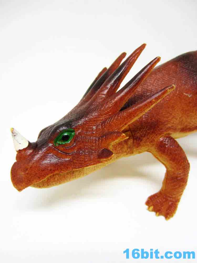 The 11-inch long beast looks more like a lizard than a dinosaur, but that's in line with the thinking and books aimed at kids at the time. This is a terrible lizard, with a rather svelte body and his head looking up to attack. He's hollow, his tail isn't dragging, and the sculpting is pretty phenomenal. There are lots of wrinkles and textures, plus surprisingly good deco for 1985. The eyes have two colors. The horn is painted white. The body has more than one shade of brown on it, including stripes! Someone who designed this did a pretty good job with the deco budget, when they probably could have gotten away with a barely-painted dinosaur and sold it without much of a fight.
