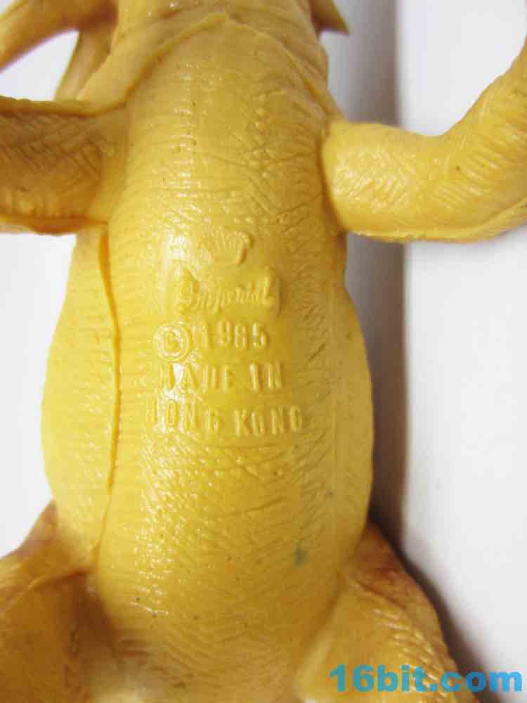 The figure has no real articulation - a hallmark of most dinosaur toys in the 1980s and before - but you will find a little crown and the words "1985 IMPERIAL MADE IN HONG KONG" on his yellow belly. The vinyl pieces don't fit together perfectly - you can see the seams - and if you give his belly a squeeze you will hear air puff out of a tiny hole in his lips. It's fun, it's for kids, and it's pretty sizable too. Looking at these dinosaur toys shows me that I could have probably had another, pretty decent career covering dinosaur toys were it not for the really likely fact that nobody would have ever paid me to write about them. Sure, he's probably not exactly scientifically accurate but it is big enough that you can fight other toys with it and it's hard to misplace. While I love Jurassic World toys they certainly aren't big, so it's neat to see meatier toys from a bygone era. It would even be nicer to see more of them make a return at the toy store.