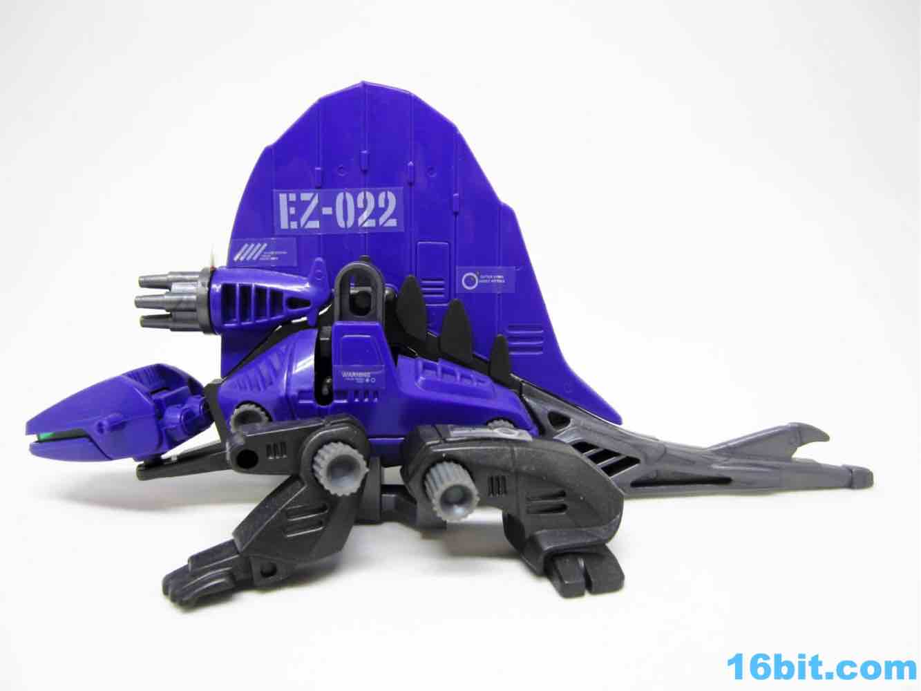 This is a small kit, roughly 5-inches long. The little dimetrodon has a grey tail and legs, with a body, sail, and head in purple. You should be able to pop it off the sprues and have it fully assembled. The design is similar to the early Zenebas kits in that there's a clamshell-like head, a big cannon on the fin, and four moving legs. Sadly, the fin isn't exactly locked down - it does snap in to place, but it also slides right out if you aren't careful. As such, I suggest that you not pick it up by the fin.