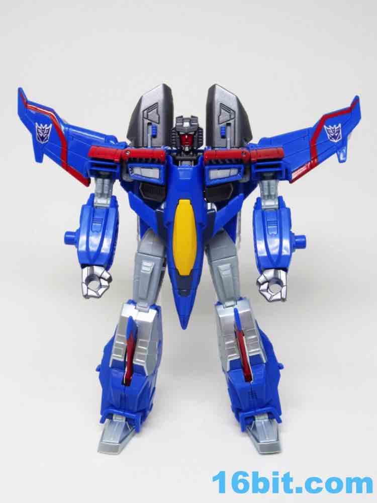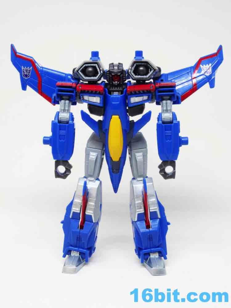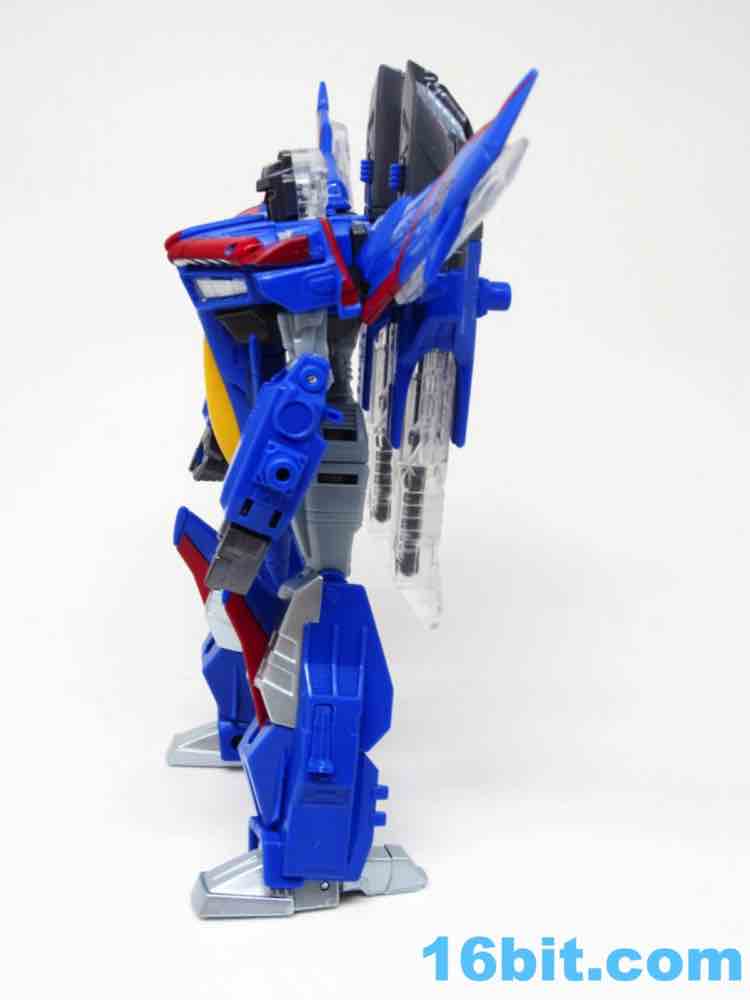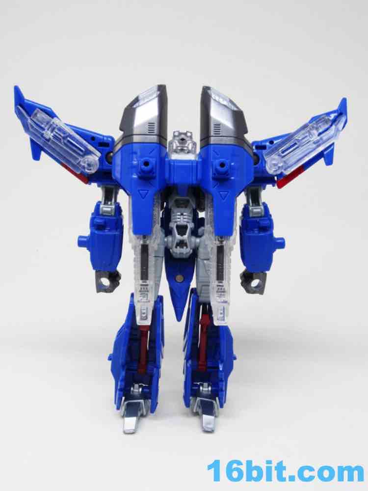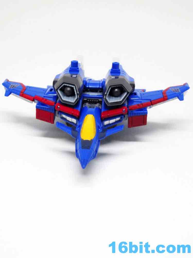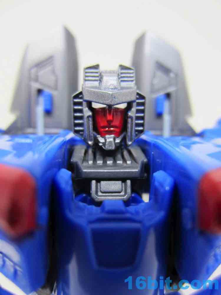 I liked the original, and I like this redeco. The blue is very nice, and the Decepticon symbols on Starscream's wings have a nice silver border like most current toys. The rest striping and face look fantastic, and the gunmetal grey on the fists, cannons, and helmet look superb. An orange canopy is opaque and pretty, with clear colorless swords that I wish were neither clear nor colorless. The cannons are also mostly clear colorless plastic, and well, I just assume this isn't going to age pretty. I'm all for opaque, not-clear, not-white plastics - but I will say the clear back of his head does allow for his eyes to light up nicely.