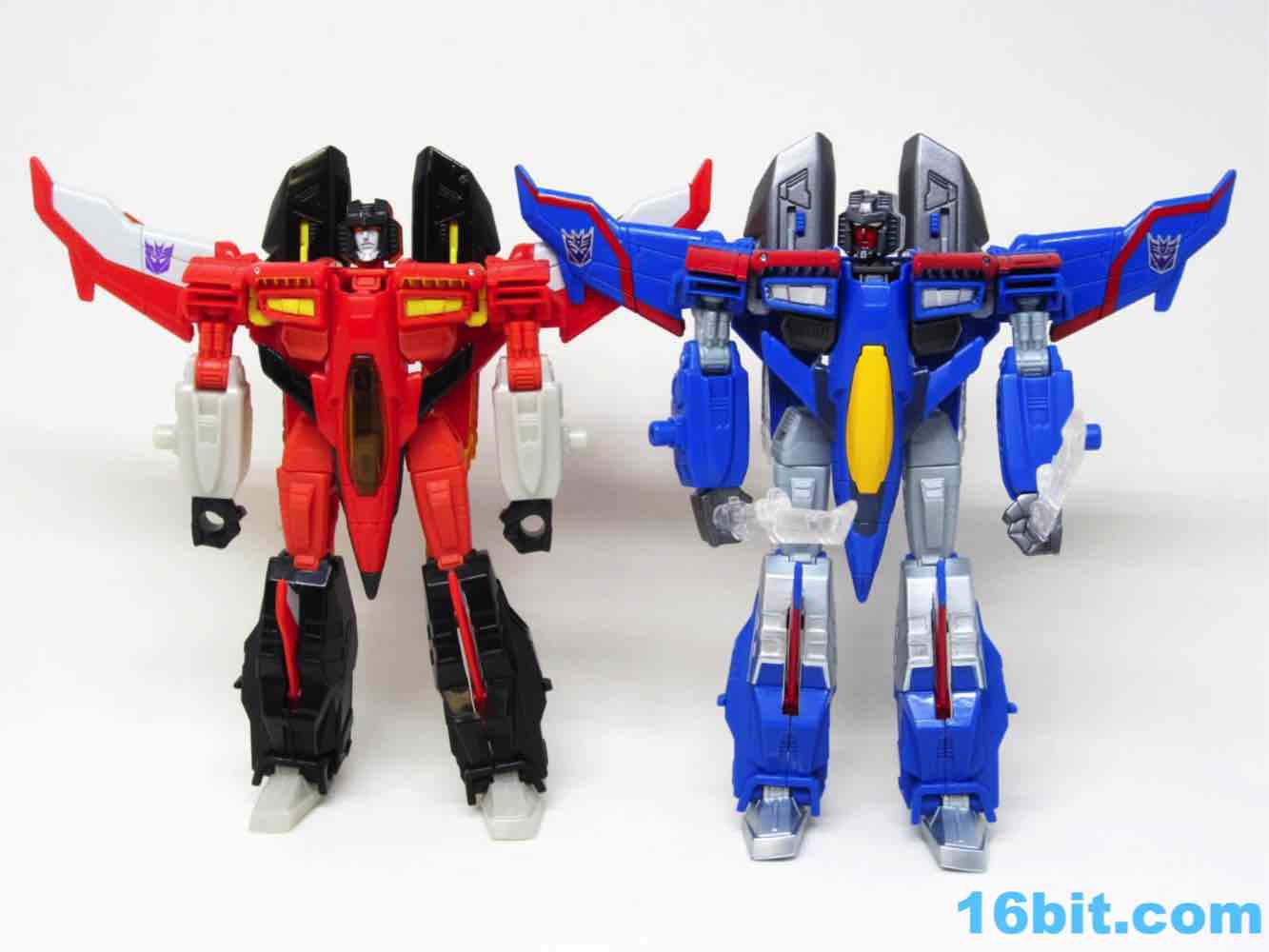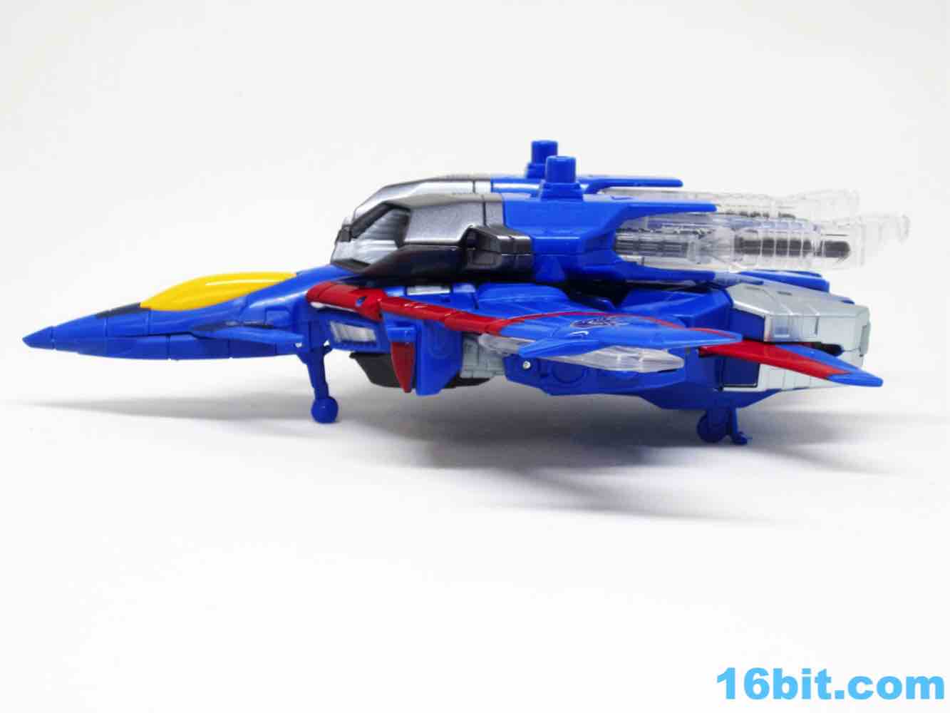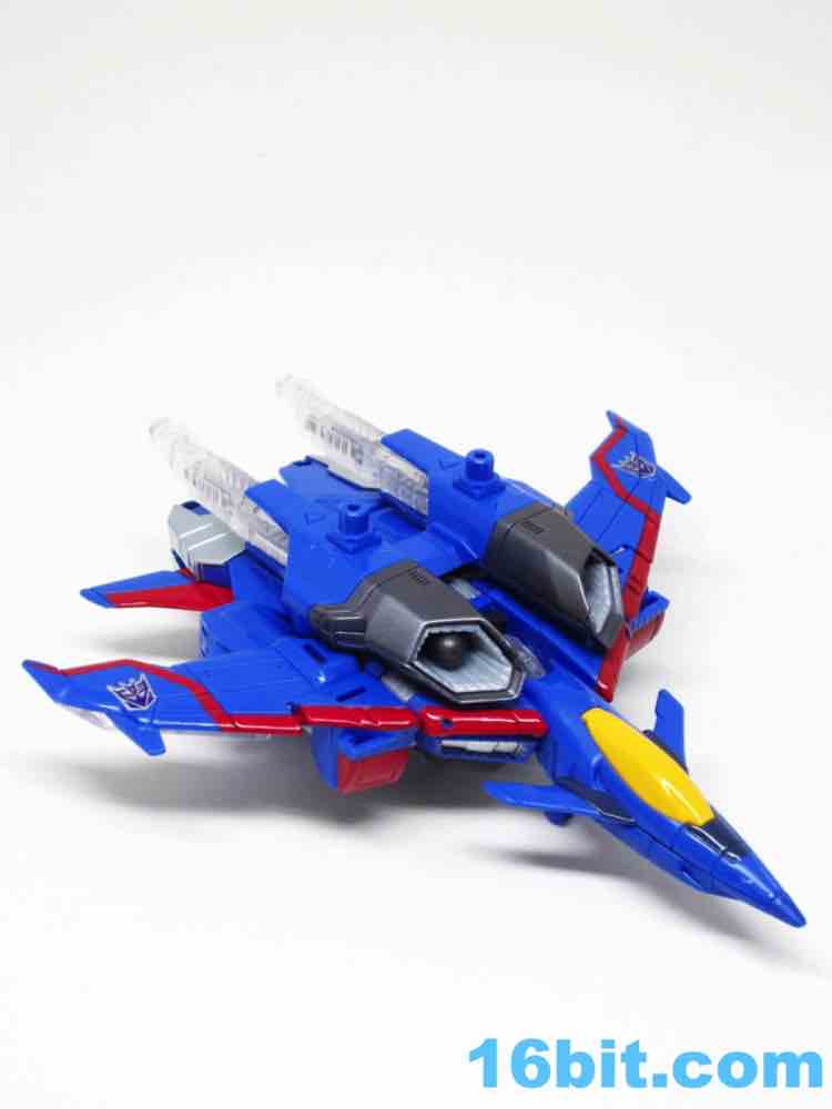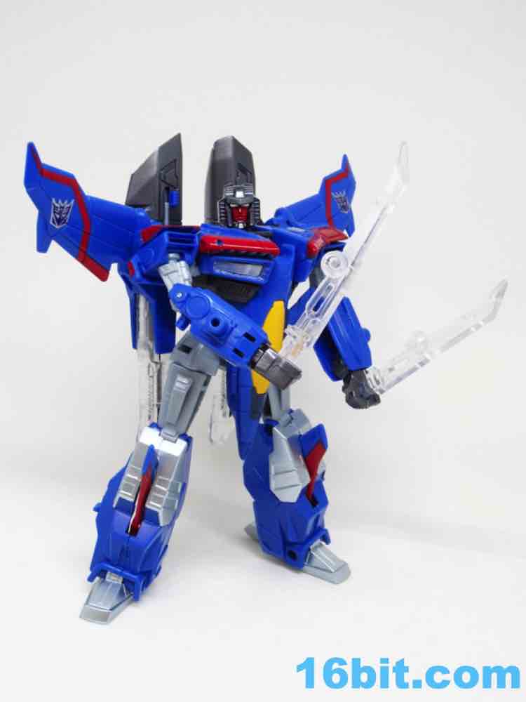 I liked the original, and I like this redeco. The blue is very nice, and the Decepticon symbols on Starscream's wings have a nice silver border like most current toys. The rest striping and face look fantastic, and the gunmetal grey on the fists, cannons, and helmet look superb. An orange canopy is opaque and pretty, with clear colorless swords that I wish were neither clear nor colorless. The cannons are also mostly clear colorless plastic, and well, I just assume this isn't going to age pretty. I'm all for opaque, not-clear, not-white plastics - but I will say the clear back of his head does allow for his eyes to light up nicely.