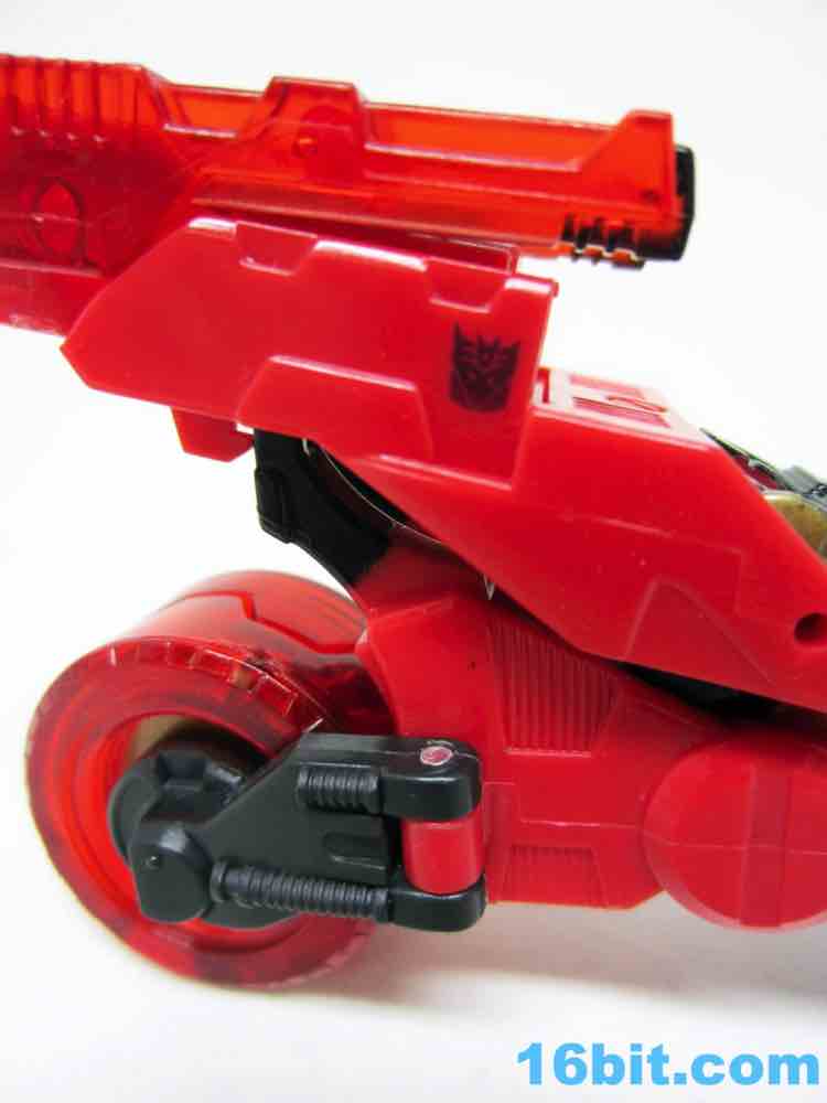 Inflation has not been too kind to most toys. $6.99 in 2005 is about $8.49 today - and today's closest analog to the old Scout class is Legends. Legends are roughly the same height, but are skinnier with no action figures and significantly smaller alt modes. Ransack's cycle mode not only look like an awesome Tron bike with candy red wheels, but it's over 5-inches long - 2015's Legends Groove doesn't even come close. The wheels are big enough so it can stand freely, the bike itself is large enough that you may be able to get a 3 3/4-inch figure to ride it, and the pop-out bike guns... well, they're a little silly since inserting the key makes them pop up and point behind the bike.