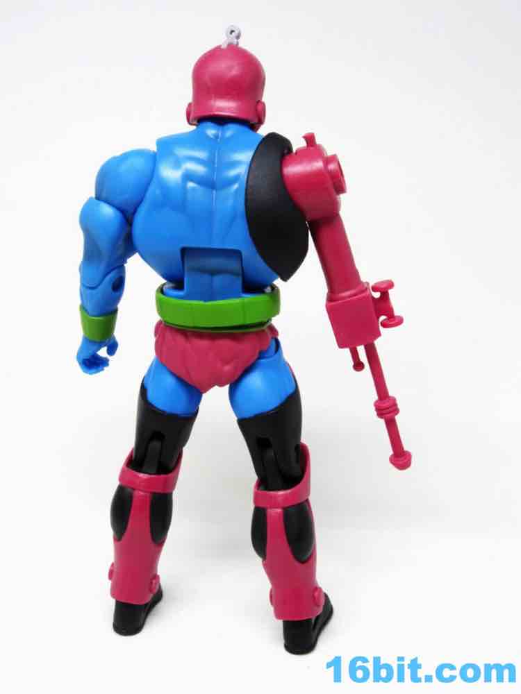 The Filmation makeover really works on the head. It's a little thinner, with bigger eyebrows and surprisingly a less monstrous face. The area under the pink jaw is now black - there's no bloody guts or anything, it's just a shadow. While seemingly very similar to the original, the sculpting is entirely different with a new loop on the head, a different depth on the stripe, and I was surprised they didn't recycle the chest either. Trap Jaw has a new upper torso, with the black armor molded right to it. His big cybernetic arm has no joint in it other than the place to plug in a different tool, and it's also a totally new and unpainted sculpt. If that weren't enough, the thighs are new. The shins are new. The rocker boots are new, too. There isn't as much deco on this guy as the last one, but a little black shading on the arm and torso give it some life. It looks good - it's worth finding one just to lay eyes on it.