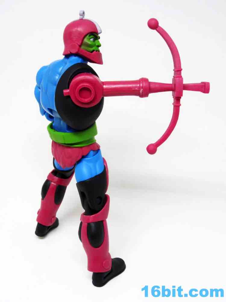 Accessories in this line are always interesting to watch, mostly because they've been cutting back. Filmation He-Man has a sword - and that's it, no shield and no axe. Trap Jaw loses his spare arm and original head, but you get some sizable weapons to plug in to the cyber stump. The default gun looks a lot like the original toy's accessory, and it's similar in its ornamentation. Little bits hang off in similar places, and it's generally pretty neat. A laser bow (sans arrows) is pretty spiffy, and a great little sci-fi extra. The real winner, though? A fly swatter arm. I doubt many toys in this line will ever be able to get away with a wacky accessory that fans love and appears on the show, but here it is - a pink fly swatter of your very own.