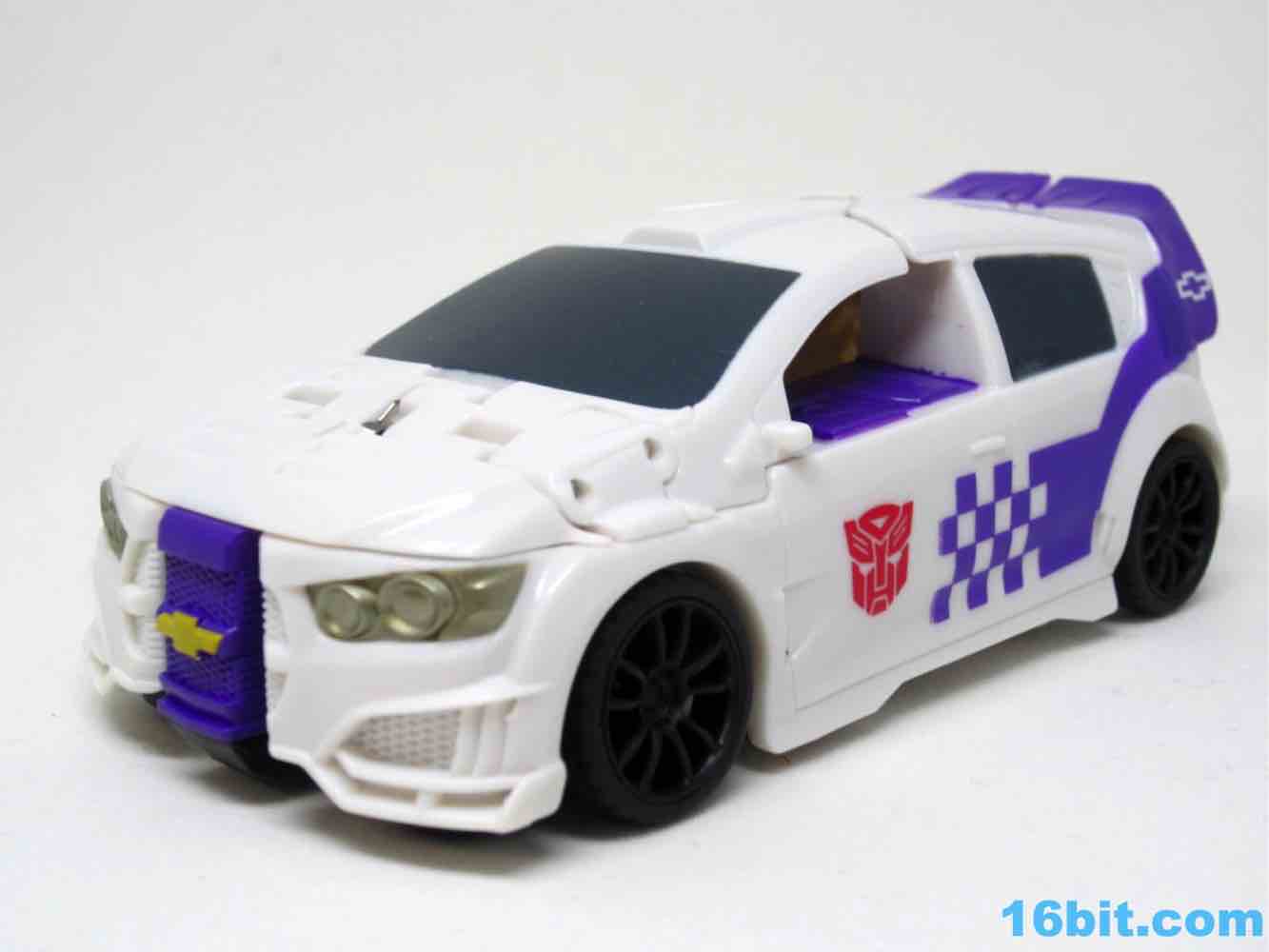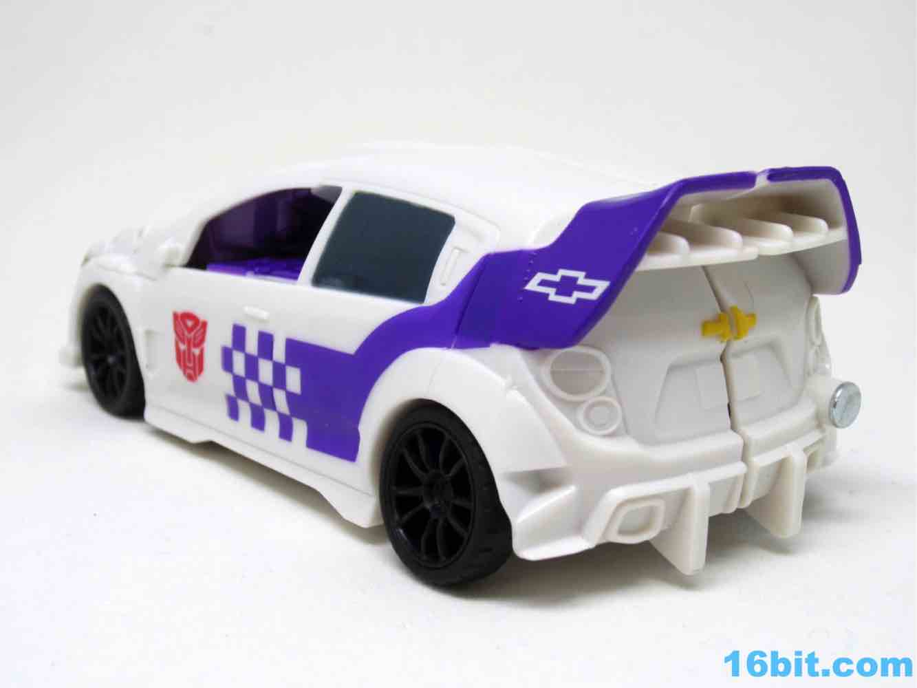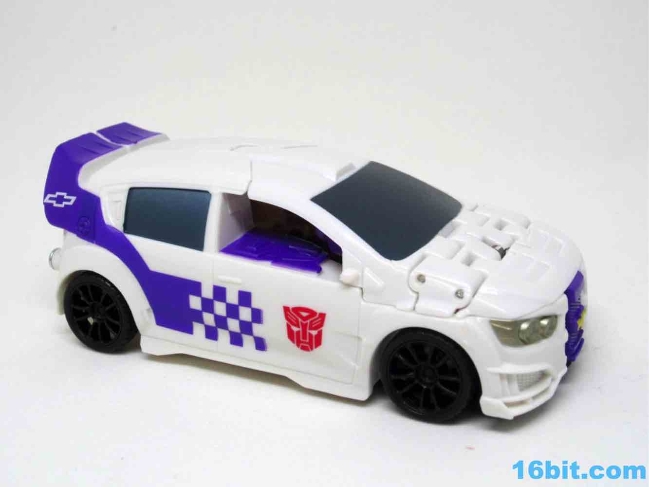 Car is smaller than a deluxe, measuring roughly four inches between each bumper. A nifty checker pattern and a Chevy marking make it distinctive, with an Autobot symbol to let kids know that disguises don't have to be perfect. Its wheels roll nicely and the windows are painted - or rolled down. While there's not a ton of paint here, they really make it count with 4 Chevy symbols and a nice big purple spoiler.