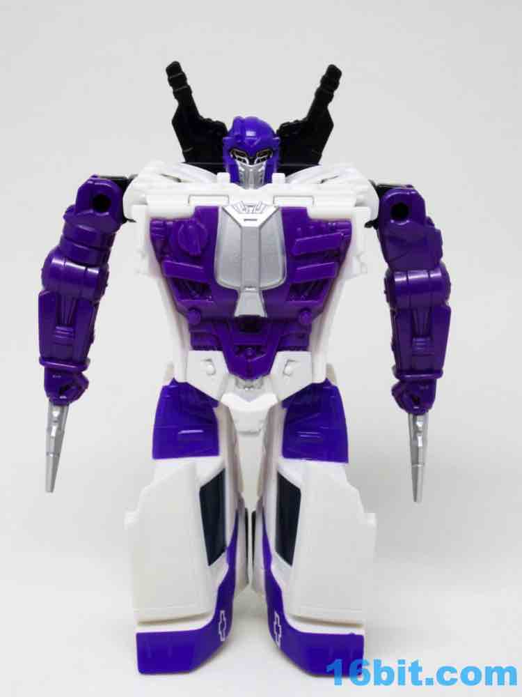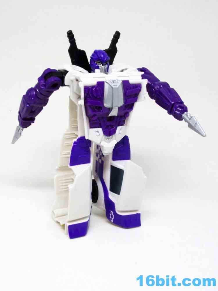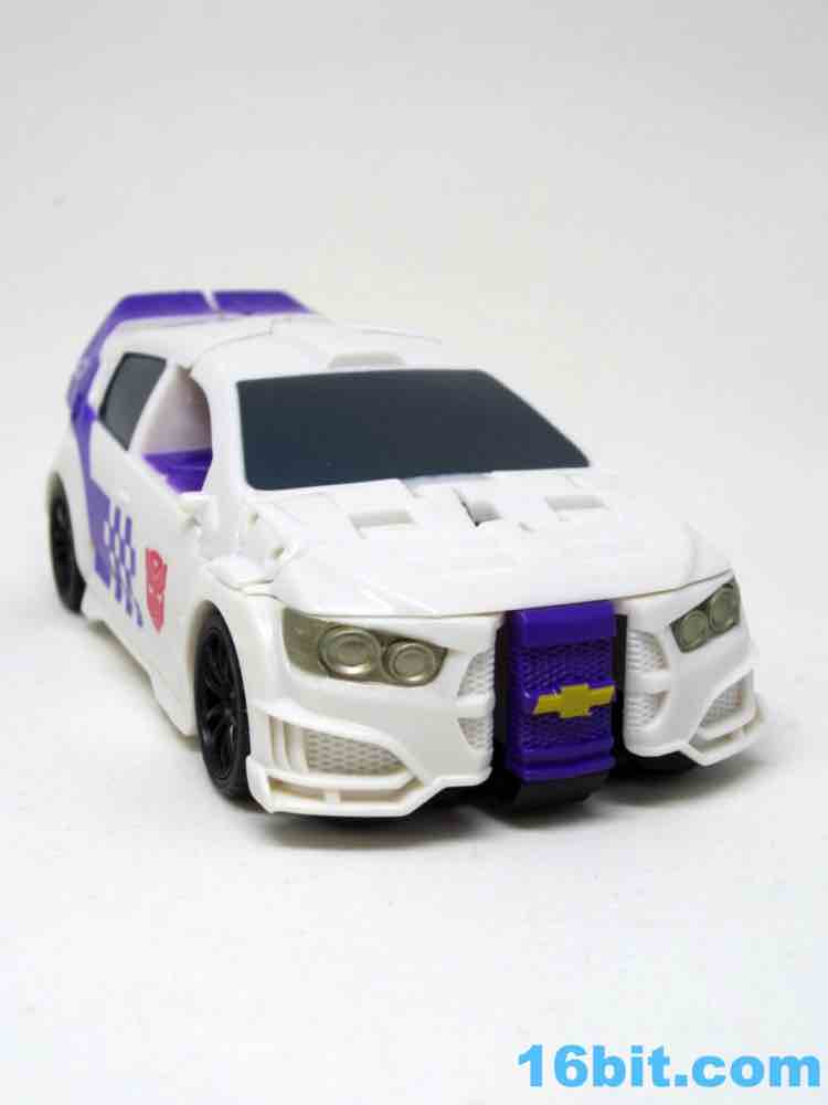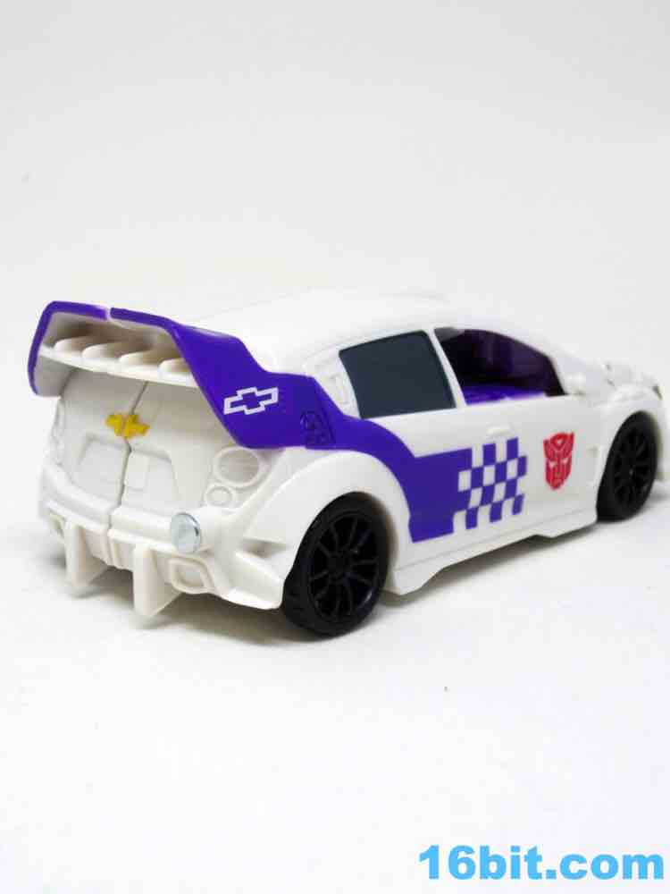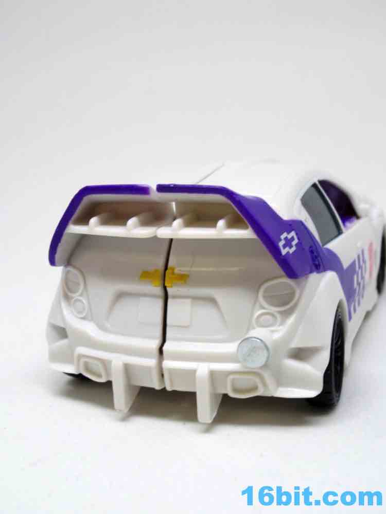 Car is smaller than a deluxe, measuring roughly four inches between each bumper. A nifty checker pattern and a Chevy marking make it distinctive, with an Autobot symbol to let kids know that disguises don't have to be perfect. Its wheels roll nicely and the windows are painted - or rolled down. While there's not a ton of paint here, they really make it count with 4 Chevy symbols and a nice big purple spoiler.