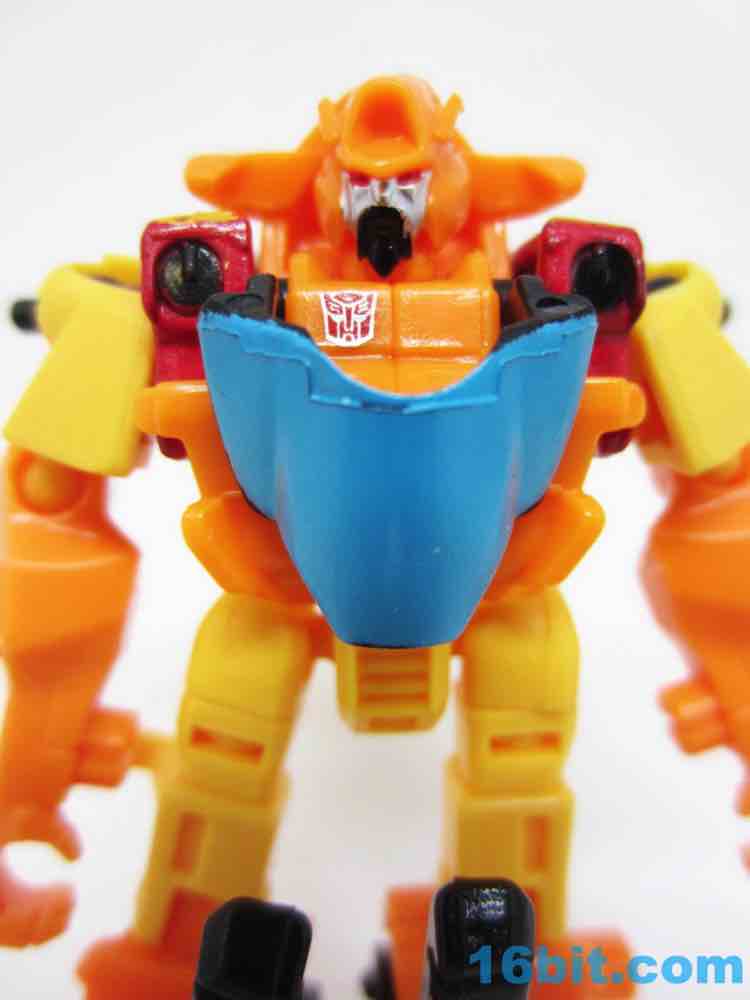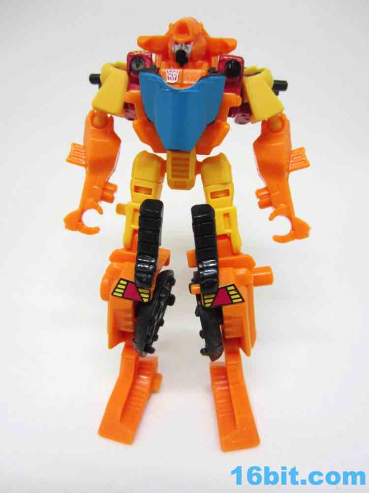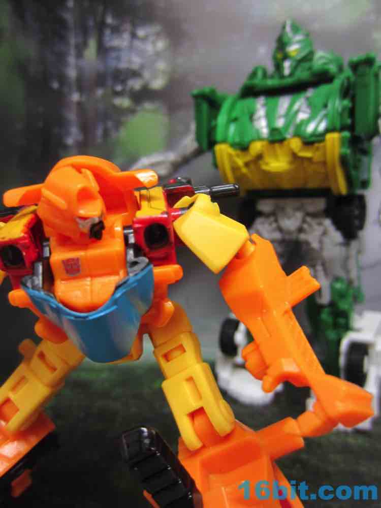 With 13 points of articulation, this is a fairly poseable figure. He's got a swell beard that thanks to the size is much bushier at this scale, and the new helmet looks great. It looks sufficiently like Wreck-Gar on the cartoon, but it's clearly only inspired by the original. My sample's 5mm compatible hands seem too stiff to take most weapons, although perhaps you will have a different experience. Probably not, though, because transformation is a huge pain in the neck. Don't let that gorgeous orange or those spiffy knee tampos fool you - this toy doesn't like to transform.