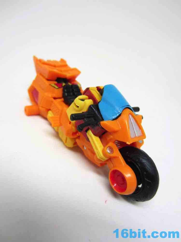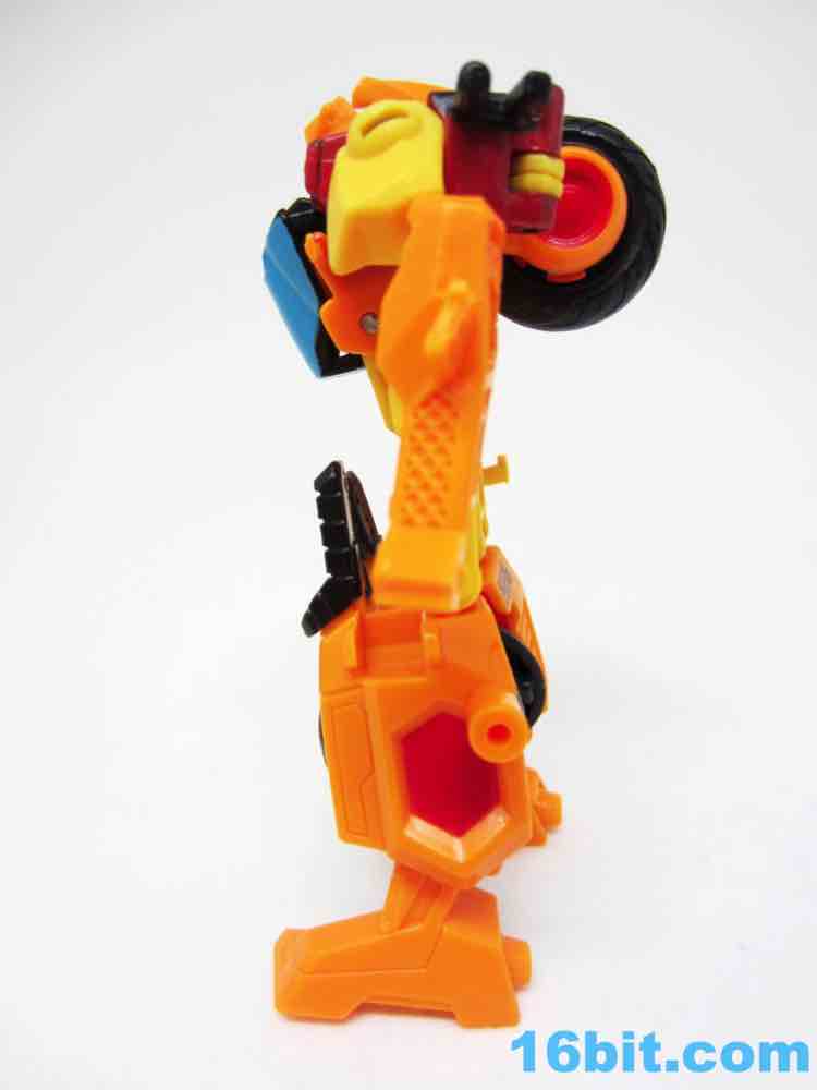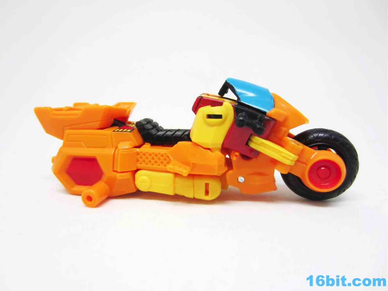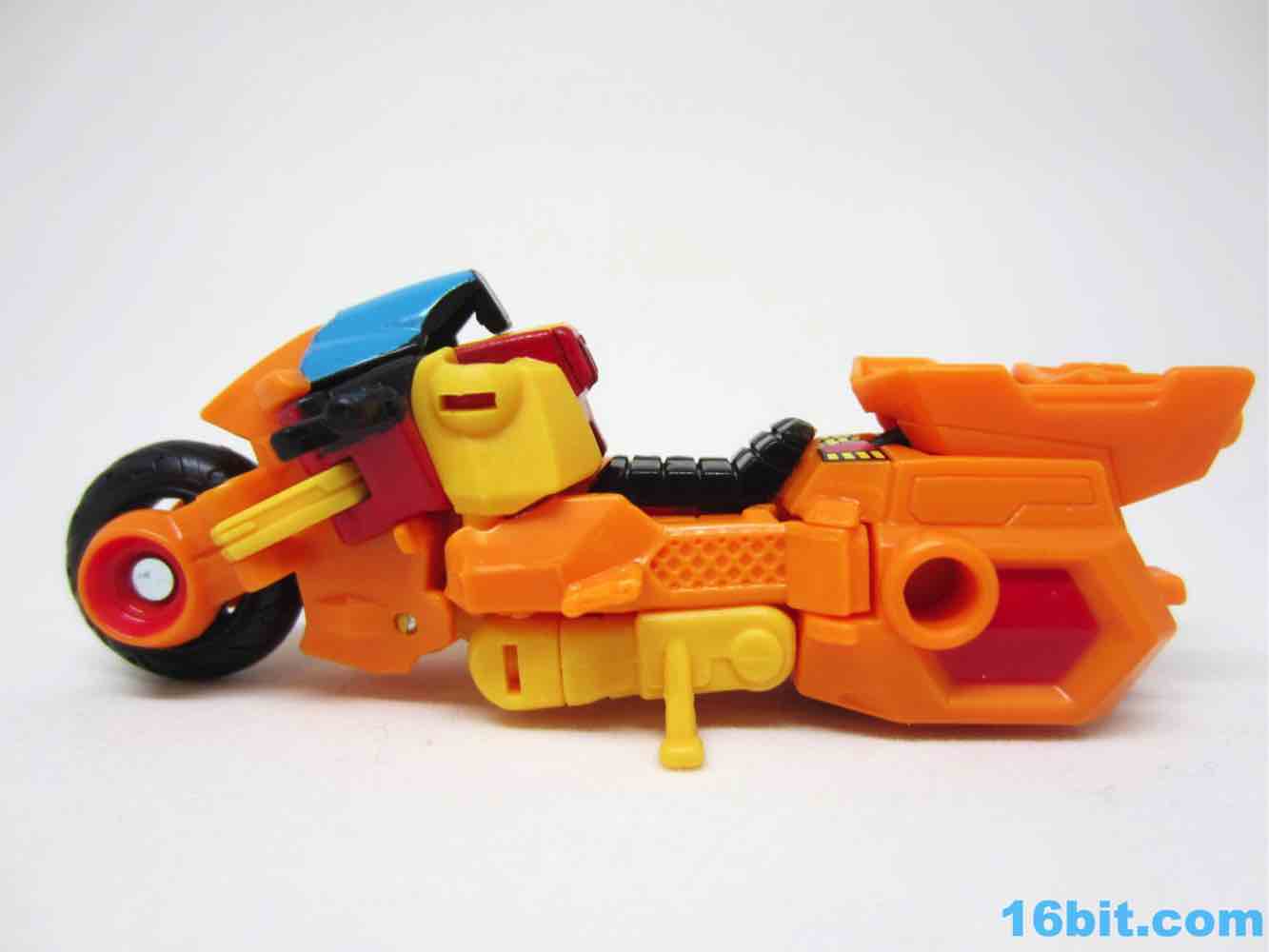 His vehicle mode is about as good as a transforming motorcycle gets, in that it has spinning wheels and does not much else. The 5mm peg and hole on the sides serves no obvious purpose in any of the modes, so if you figure it out let the rest of us know. Some extra deco on the wheel and under the seat looks great, but it's still basically just an orange vehicle with wheels. There's a kickstand, there are handlebars, and it's pretty good - but not impressive.