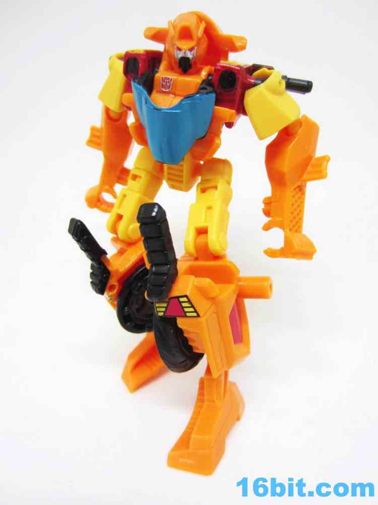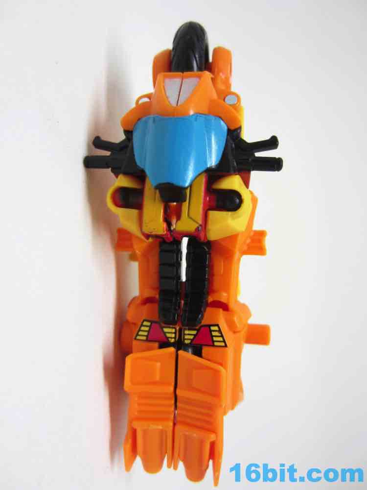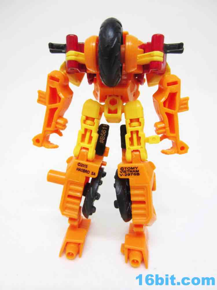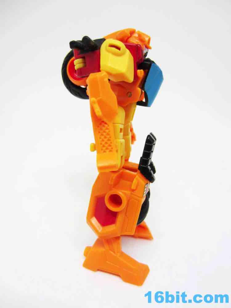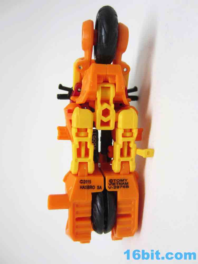 His vehicle mode is about as good as a transforming motorcycle gets, in that it has spinning wheels and does not much else. The 5mm peg and hole on the sides serves no obvious purpose in any of the modes, so if you figure it out let the rest of us know. Some extra deco on the wheel and under the seat looks great, but it's still basically just an orange vehicle with wheels. There's a kickstand, there are handlebars, and it's pretty good - but not impressive.