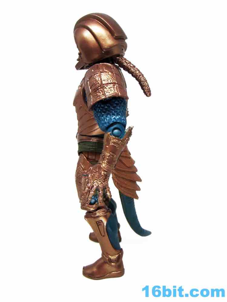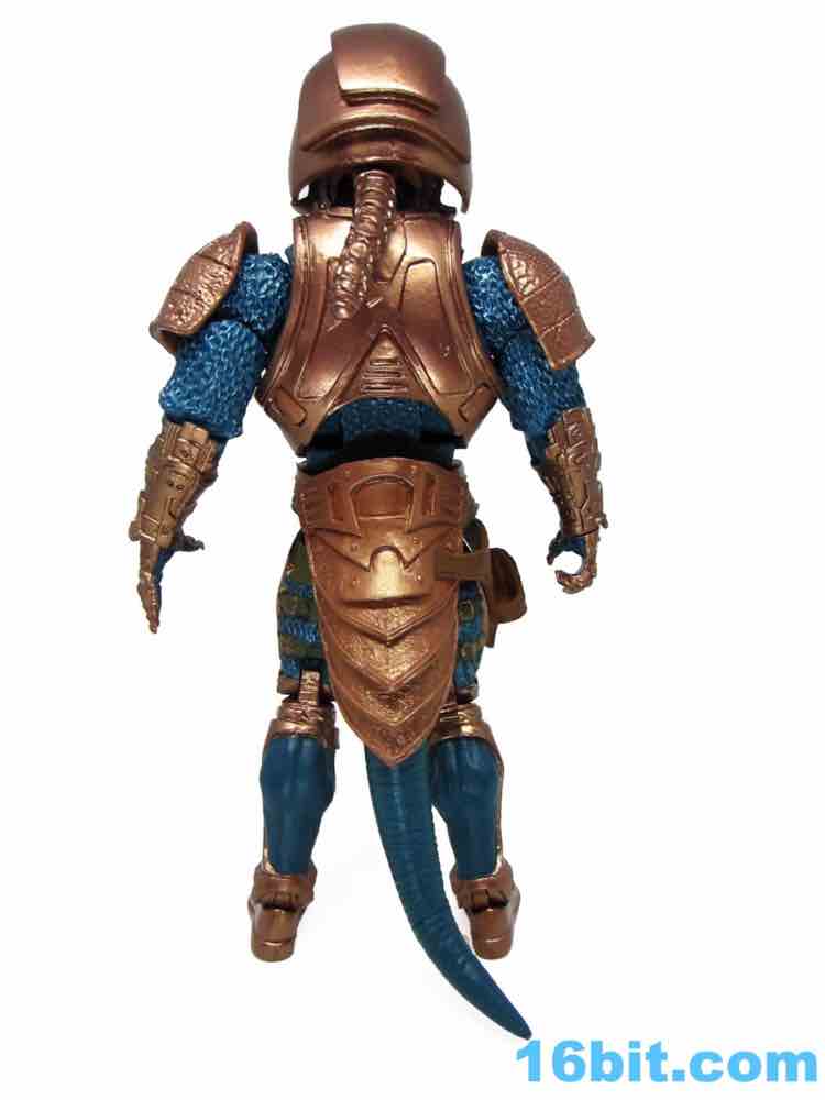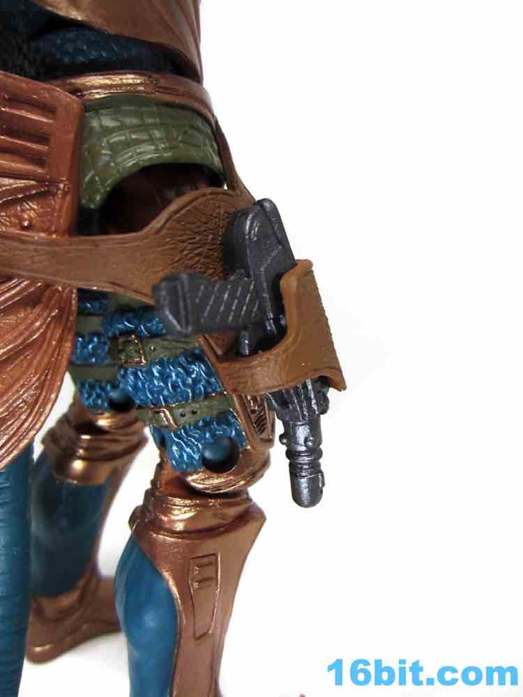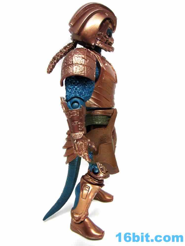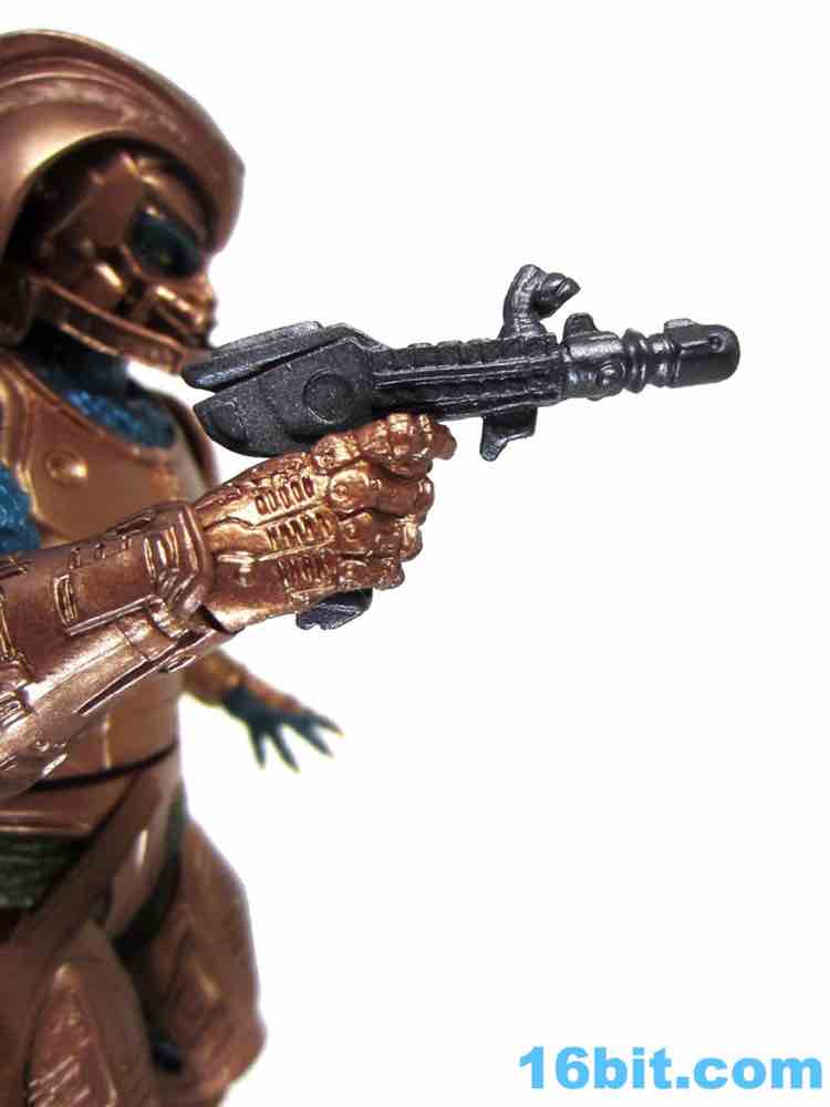As always, the Four Horsemen and Mattel delivered a great sculpt with good paint. It looks better than the original, plus they gave him a holster for his blaster - a nice touch. It's a tight fit, but it will fit in there or in his hand. The left hand is sculpted open and with big claws, with a gold and bony armored outside and a scaly green interior. Mattel refined the armor on this figure as well, with less bulky chest armor making it look almost like it's part of the upper torso. The figure is covered in amazing, subtle sculpted detail with al sorts of dents, rivets, and panels complete with straps and buckles on the back. The design looks very well-thought-out, granting the lizard man a tail as well as tail coverings.