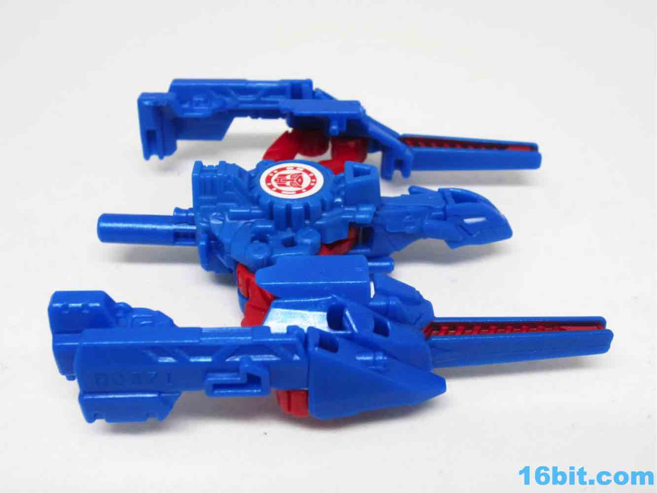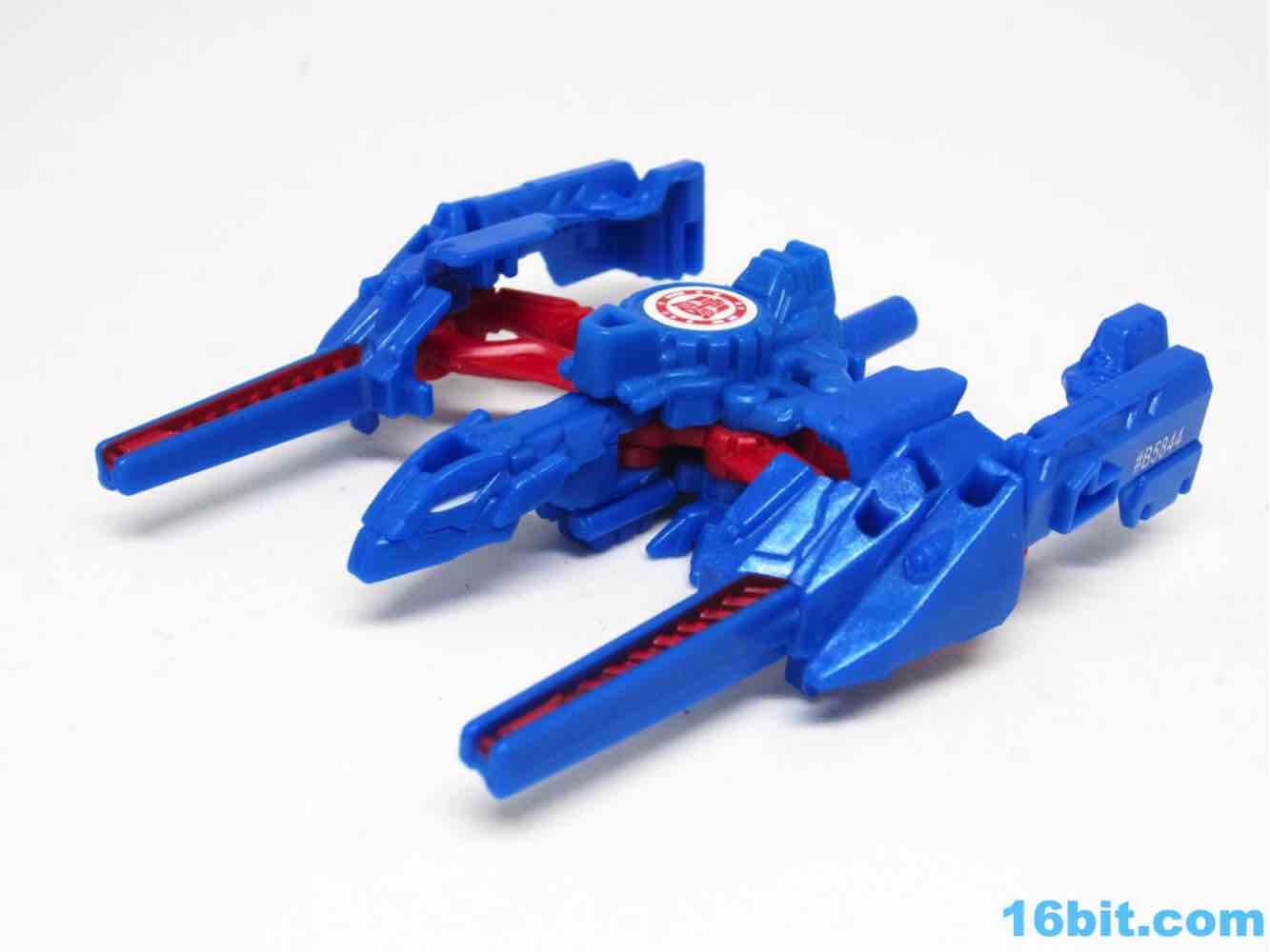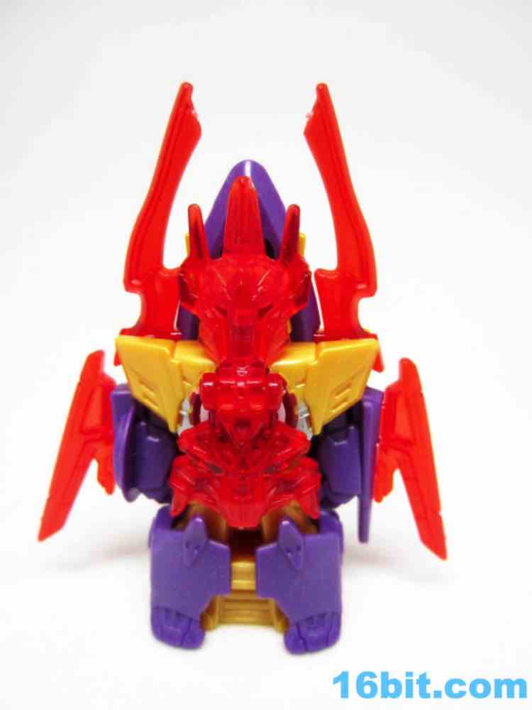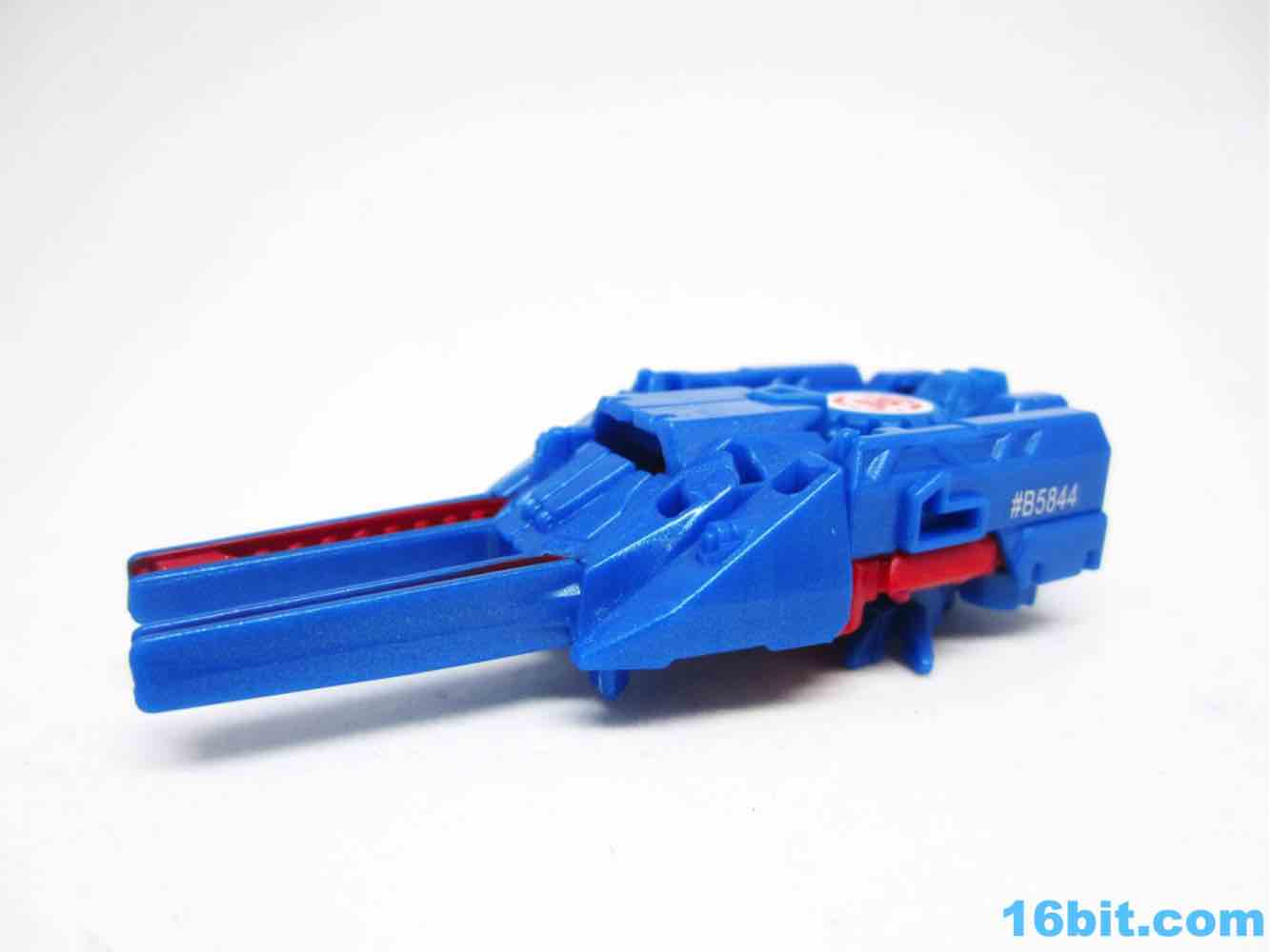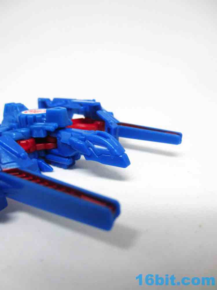 Next up is Autobot Dragonus, as the name hints this is the Autobot version of Dragonus - other toys are Decepticons named Mini-Con Dragonus. The one is a blue blaster that's quite large and sized for bigger toys, complete with red highlights. If you pry apart the forks in the front, a dragon's head pops out, with the 5mm grip on the gun becoming the dragon's tail. I don't much care for the robot mode - the dragon detail is kind of muddled in his face - but the gun? Magnifique. I'll buy the obligatory (and confirmed) black repaint. It's fun, but stiff - getting the geared wings in and out smoothly is difficult, and it could just be my sample. I don't think it's enough of a problem to prevent me from recommending the set.