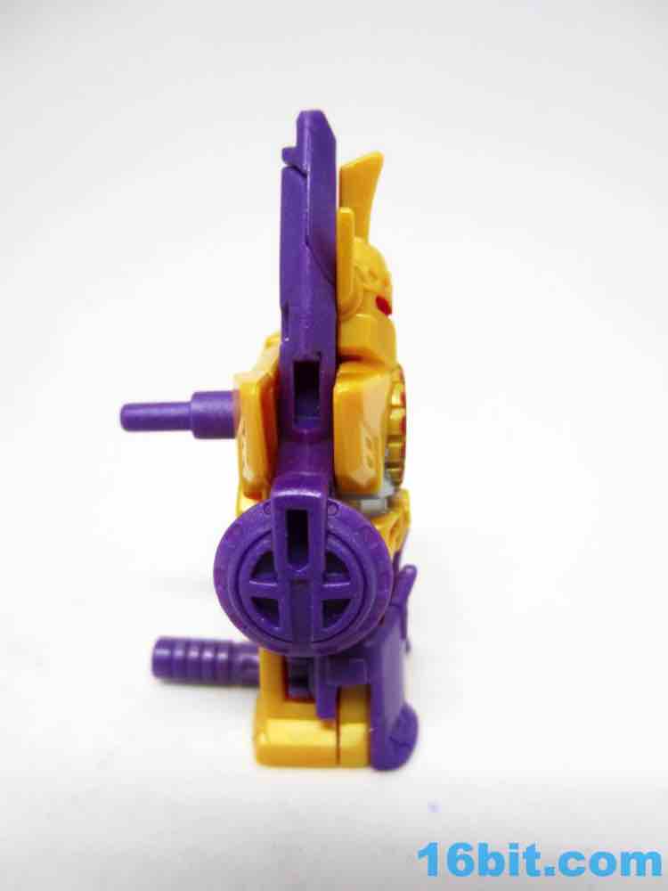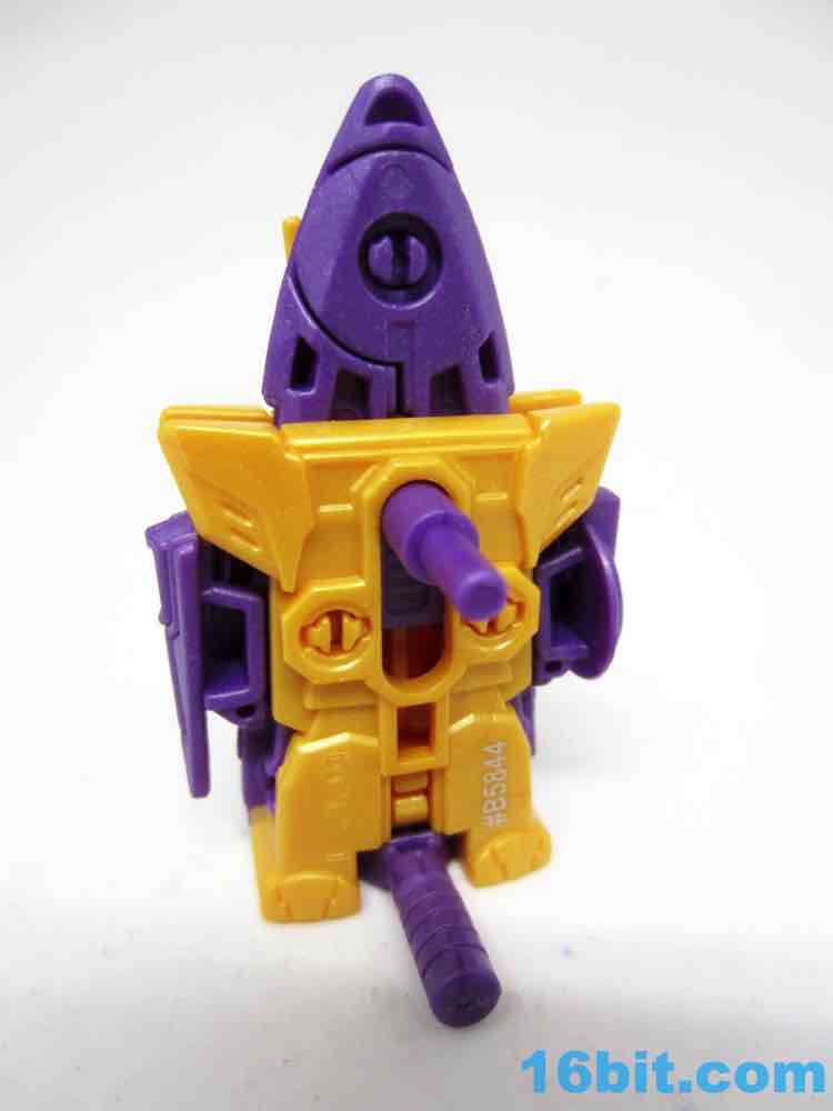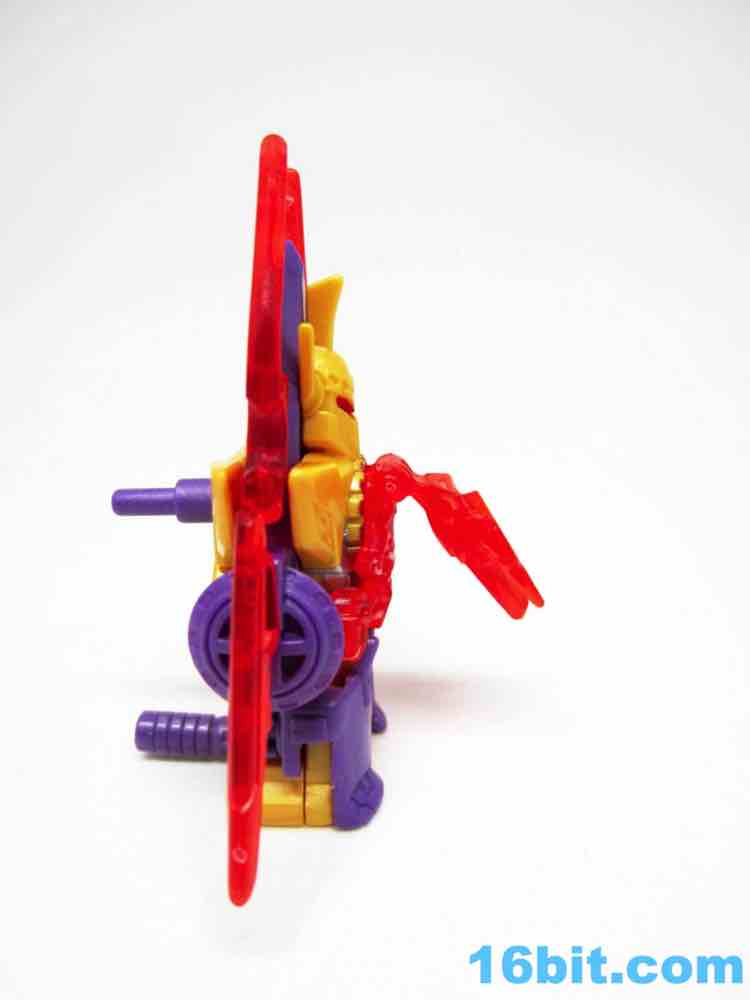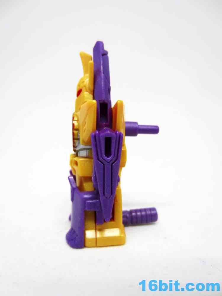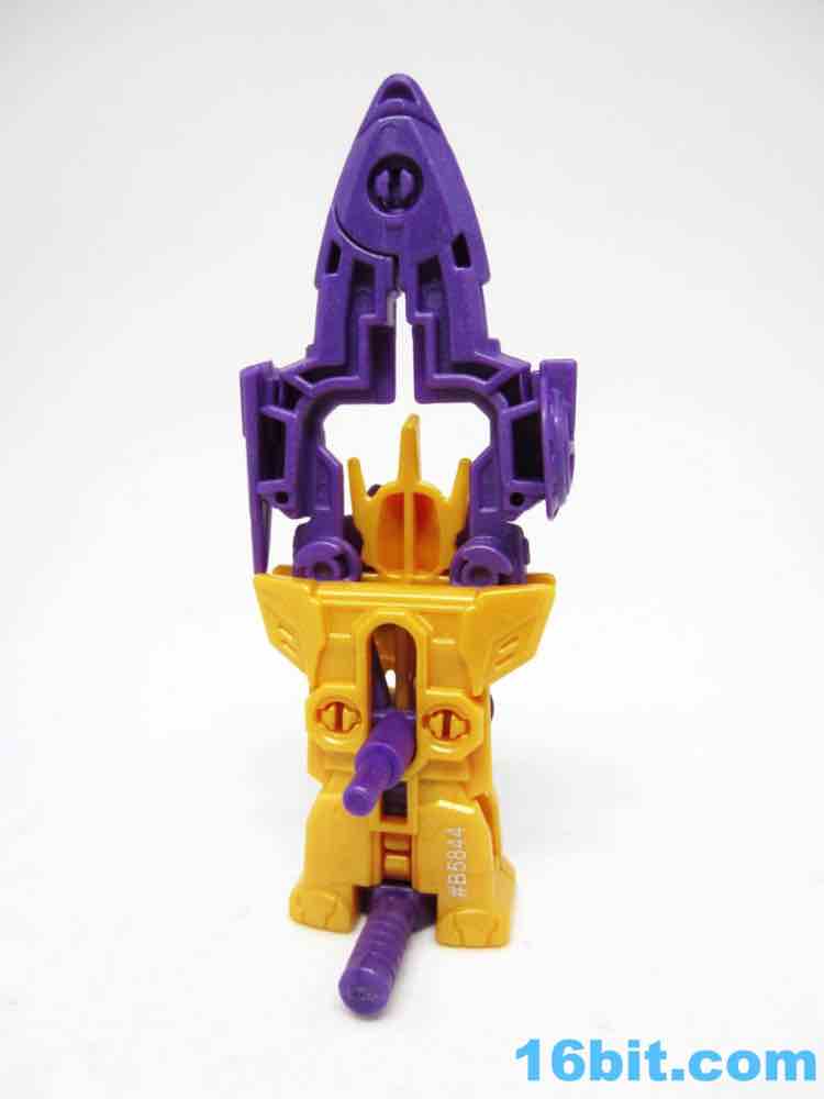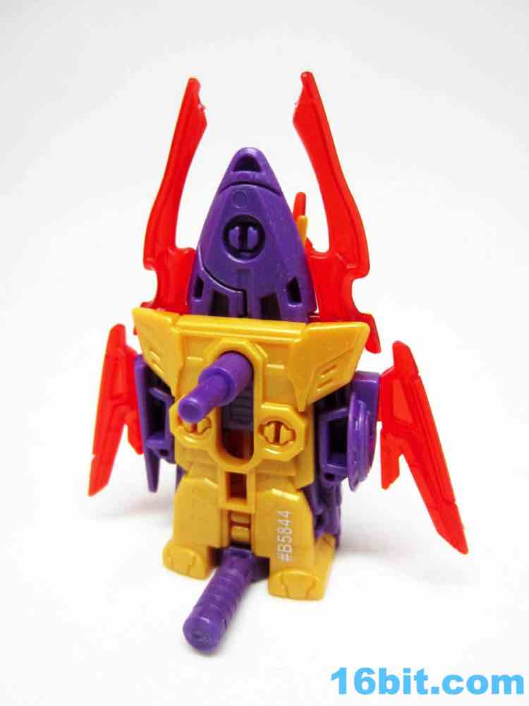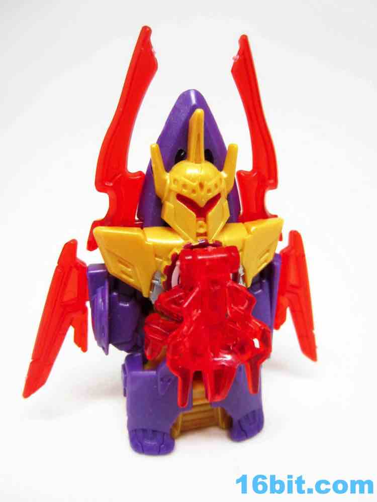The other weaponizers sport snap-on armor, which is, honestly, pretty useless. "Here's a sprue of crap that you will put up your nose or lose, kids!" I'm sure it was some sort of value-add to make the single guys look "worth" $5, but really, who would miss it? It's just debris. Lancelon is, as his name suggests, a knight that turns into a lance. The yellow and purple robot mode has a knight's helmet, but also a shield and a weapon sculpted into his non-moving hands. The figure has a lever on his back that causes his purple parts to fly over his head. Another 5mm peg rotates down from his feet, letting a bigger figure use him as a weapon. It ain't bad. It's a lot of fun, actually - the deco is decent, the sticker annoys me, the face has lost all personality, but I could transform him back and forth all day long. Hasbro nailed this one - it's stupid great fun. If you don't enjoy playing with it, I pity you. I say you've got a problem.