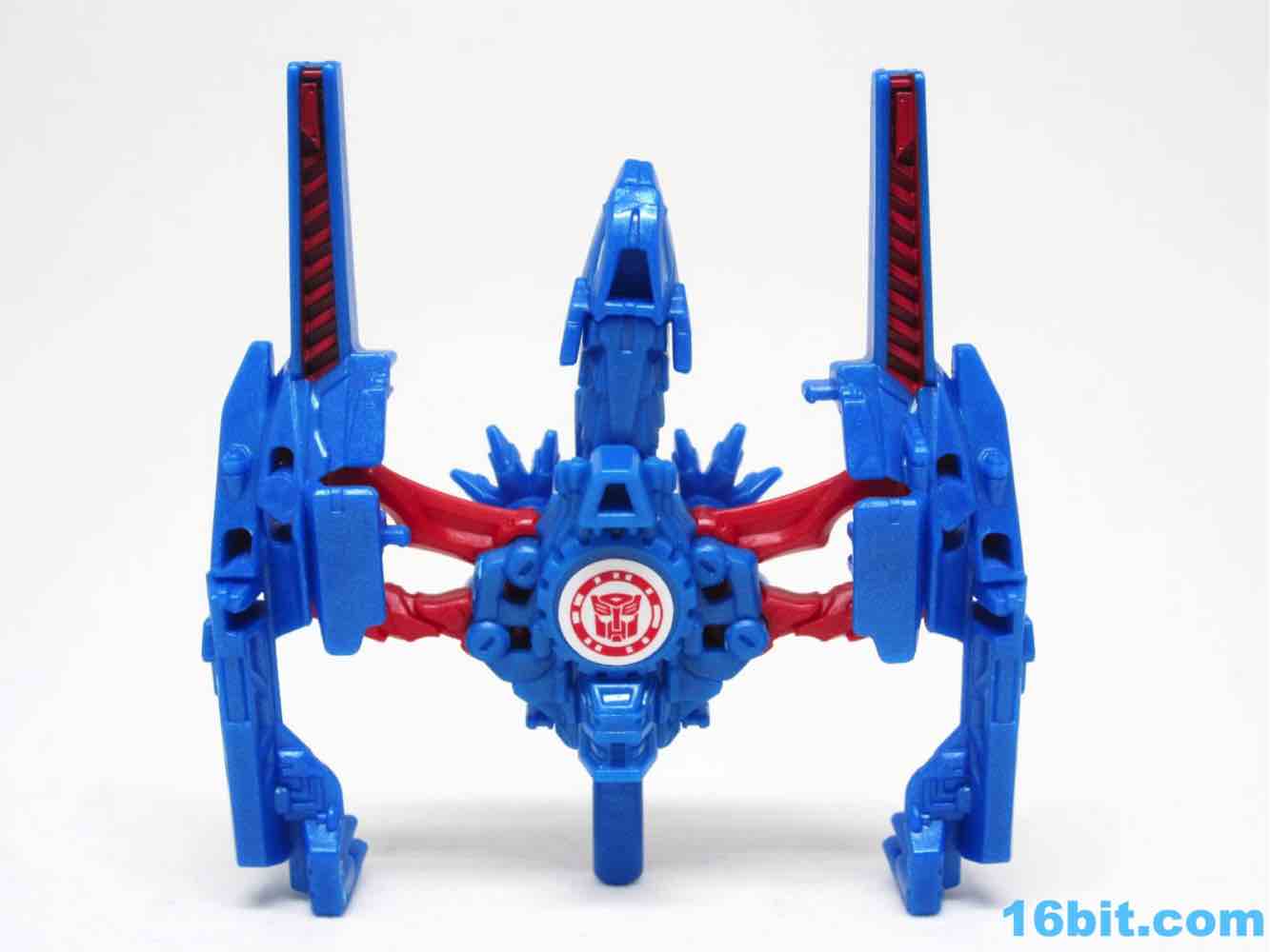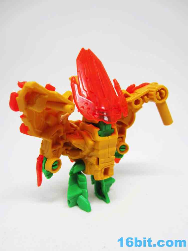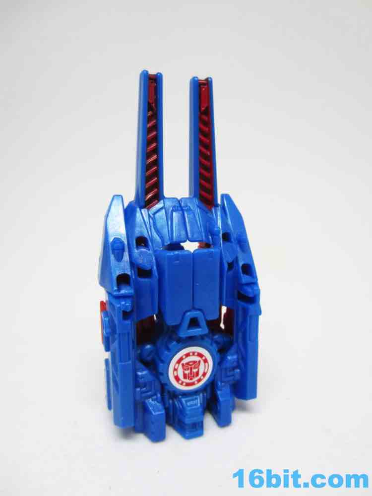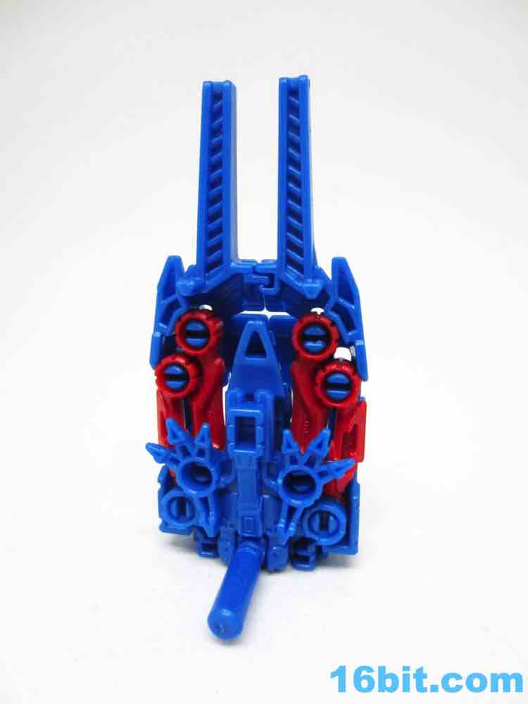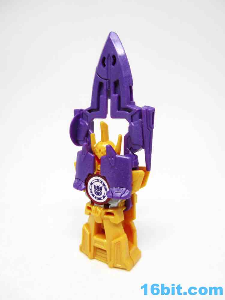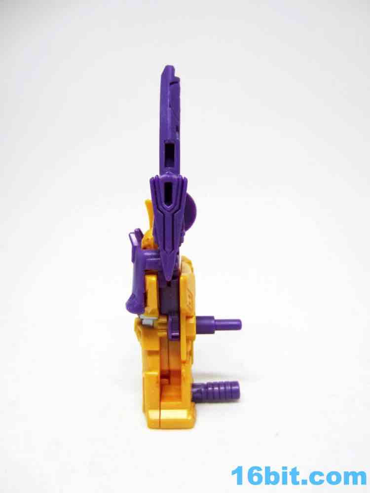 The other weaponizers sport snap-on armor, which is, honestly, pretty useless. "Here's a sprue of crap that you will put up your nose or lose, kids!" I'm sure it was some sort of value-add to make the single guys look "worth" $5, but really, who would miss it? It's just debris. Lancelon is, as his name suggests, a knight that turns into a lance. The yellow and purple robot mode has a knight's helmet, but also a shield and a weapon sculpted into his non-moving hands. The figure has a lever on his back that causes his purple parts to fly over his head. Another 5mm peg rotates down from his feet, letting a bigger figure use him as a weapon. It ain't bad. It's a lot of fun, actually - the deco is decent, the sticker annoys me, the face has lost all personality, but I could transform him back and forth all day long. Hasbro nailed this one - it's stupid great fun. If you don't enjoy playing with it, I pity you. I say you've got a problem.